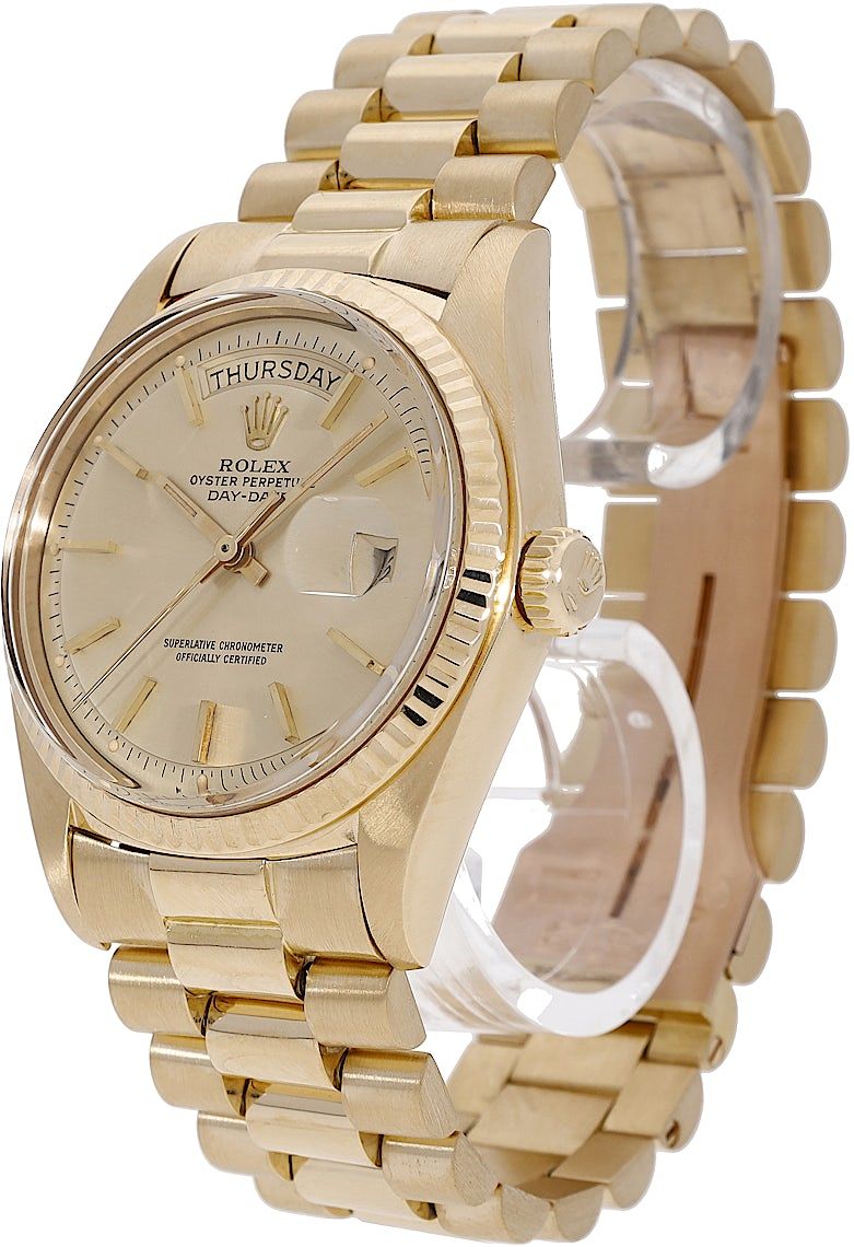 Rolex Day-Date 36, Reference: 18038, Gender: Unisex, Size: 36mm, Dial color: Gold, Strap material: Yellow Movement: Automatic, Condition: The luxury watch is older than 20 years. timepiece has been worn and may have visible signs of usage ageing. movement inspected the case polished. An inspection by our certified watchmakers guarantees its authenticity. Please note that water resistance vintage watches not guaranteed., Documents: Chronext Certificate