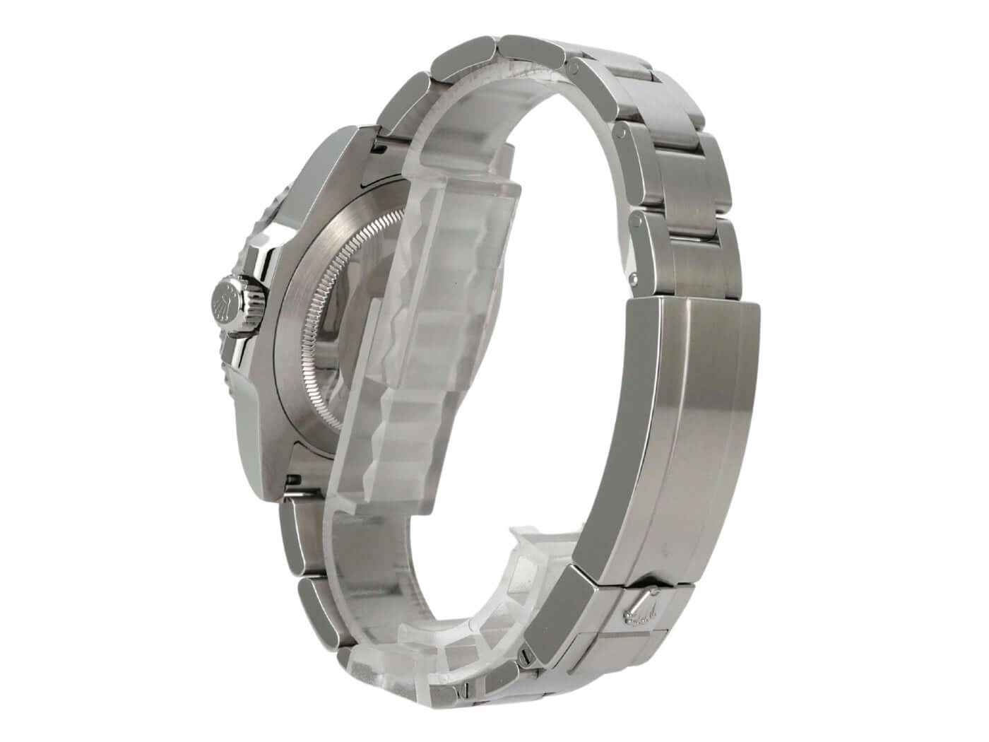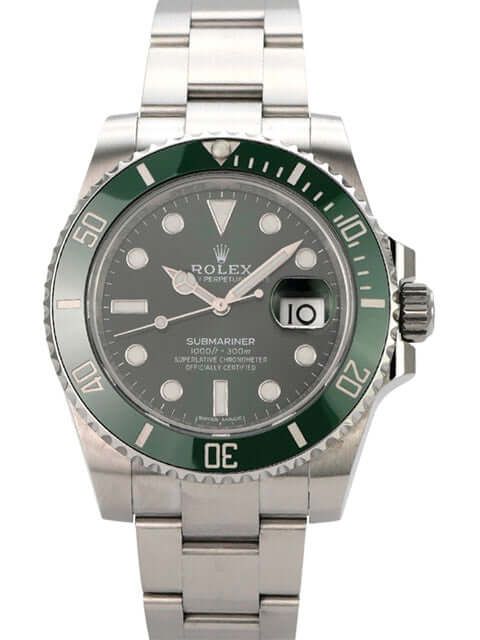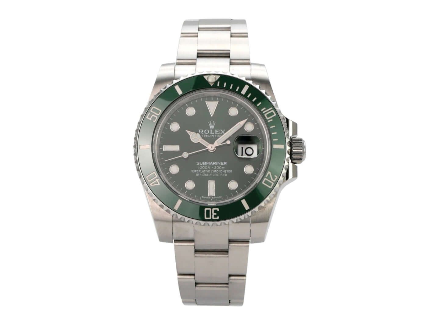 Rolex Submariner Date Ref. 116610LV from 2018Case made of polished and satin-finished stainless steel, case diameter 40 mm, case height 12.5 mm, stainless steel bezel with green ceramic inlay, 60-minute scale and luminous dot, rotatable, Oyster stainless steel bracelet polished and satin-finished with safety folding clasp, green dial with applied luminous markers and luminous dots, luminous hands, automatic movement, caliber Rolex 3135 with 31 jewels, 28,800 vibrations per hour, date display with quick adjustment and magnifier, chronometer, sapphire glass, screw-down crown with crown guards, screw-down stainless steel back, water-resistant up to 30 bar.
