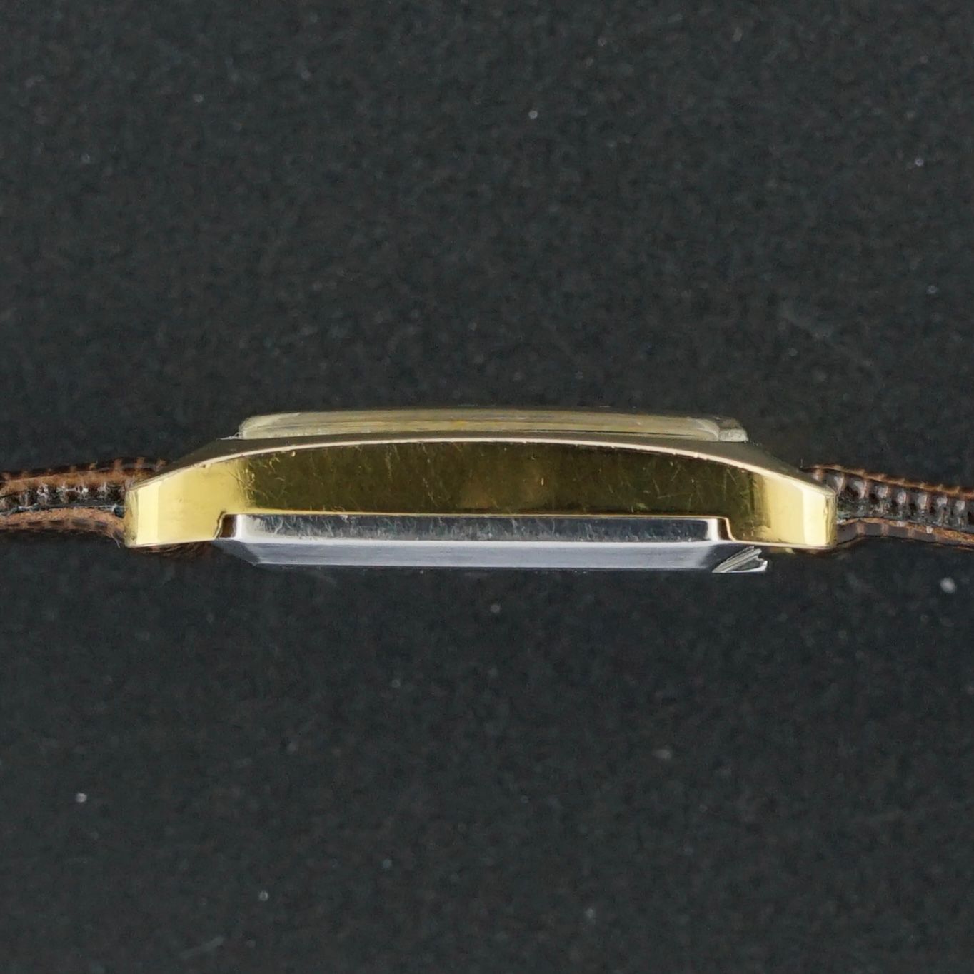 This vintage Omega De Ville from 1970 features a stunning brown dial with a vertical brushed finish that plays beautifully with the light. The warm tones are complemented by gold accents, including the Omega logo, hands, and hour markers, giving the watch a cohesive aesthetic.The tank-style case is made of steel with gold plating and remains in great condition. Inside sits a recently overhauled manual-wind Caliber 620 movement, serviced in January 2026. It runs and functions smoothly