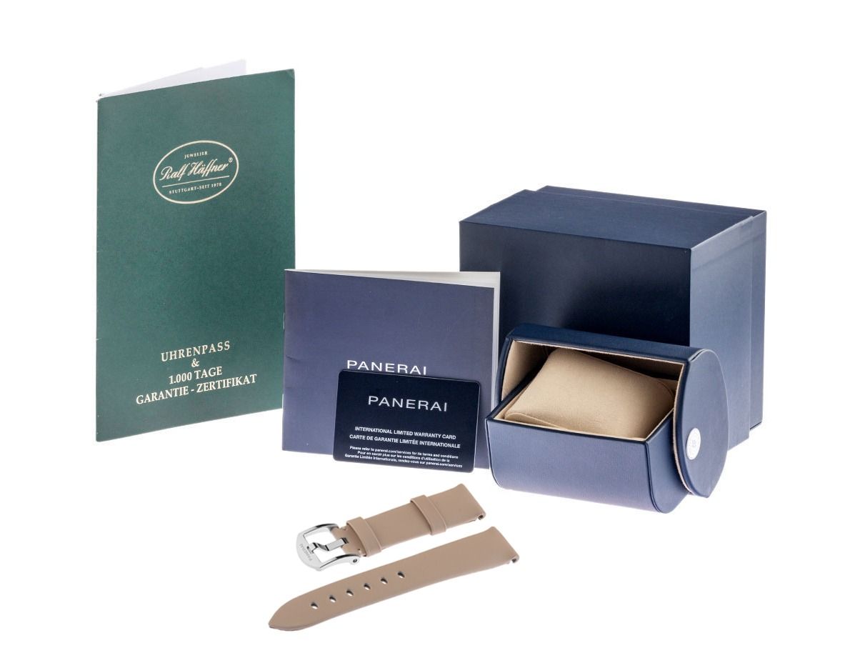 Gehäuse aus poliertem Edelstahl, Gehäusedurchmesser ohne Krone 38mm, Gehäusehöhe 11,3mm. Lünette aus glattem und poliertem Edelstahl. Armband aus poliertem und satiniertem Edelstahl, Stiftschließe aus Edelstahl mit Hersteller-Logo. Zifferblatt in Weiß mit Leuchtindexen, arabischen Ziffern und roségoldenen Leuchtzeigern. Uhrwerk Automatik, Chronometer mit Zeugnis, Panerai Manufakturkaliber P.900 mit 23 Edelsteinen, Gangreserve ca. 72 Stunden. Anzeige von Stunde und Minute über Zeiger aus der Mitte, kleine Sekunde mit Sekundenstopp zur sekundengenauen Einstellung der Uhrzeit bei 9 Uhr, Datumsanzeige mit Schnellverstellung bei 3 Uhr. Saphirglas kratzfest, doppelseitig entspiegelt und bombiert. Krone mit patentiertem Panerai Schutzbügel. Boden aus Edelstahl, verschraubt und graviert. Gewicht der Uhr inklusive Armband 125g, Länge des Armbandes inklusive Gehäuse 195mm. Wasserdicht bis 5 ATM. Referenznummer: PAM01508, ID: ST1160116140126H-8000, Artikelnummer: 10000084413. Original Panerai Box mit Umkarton und Garantieunterlagen von Dezember 2025 sowie Beschreibung, Lünettenschutz und Wechselarmband aus pinkem Leder, Full Set. Ungetragen. Lieferzeit sofort.