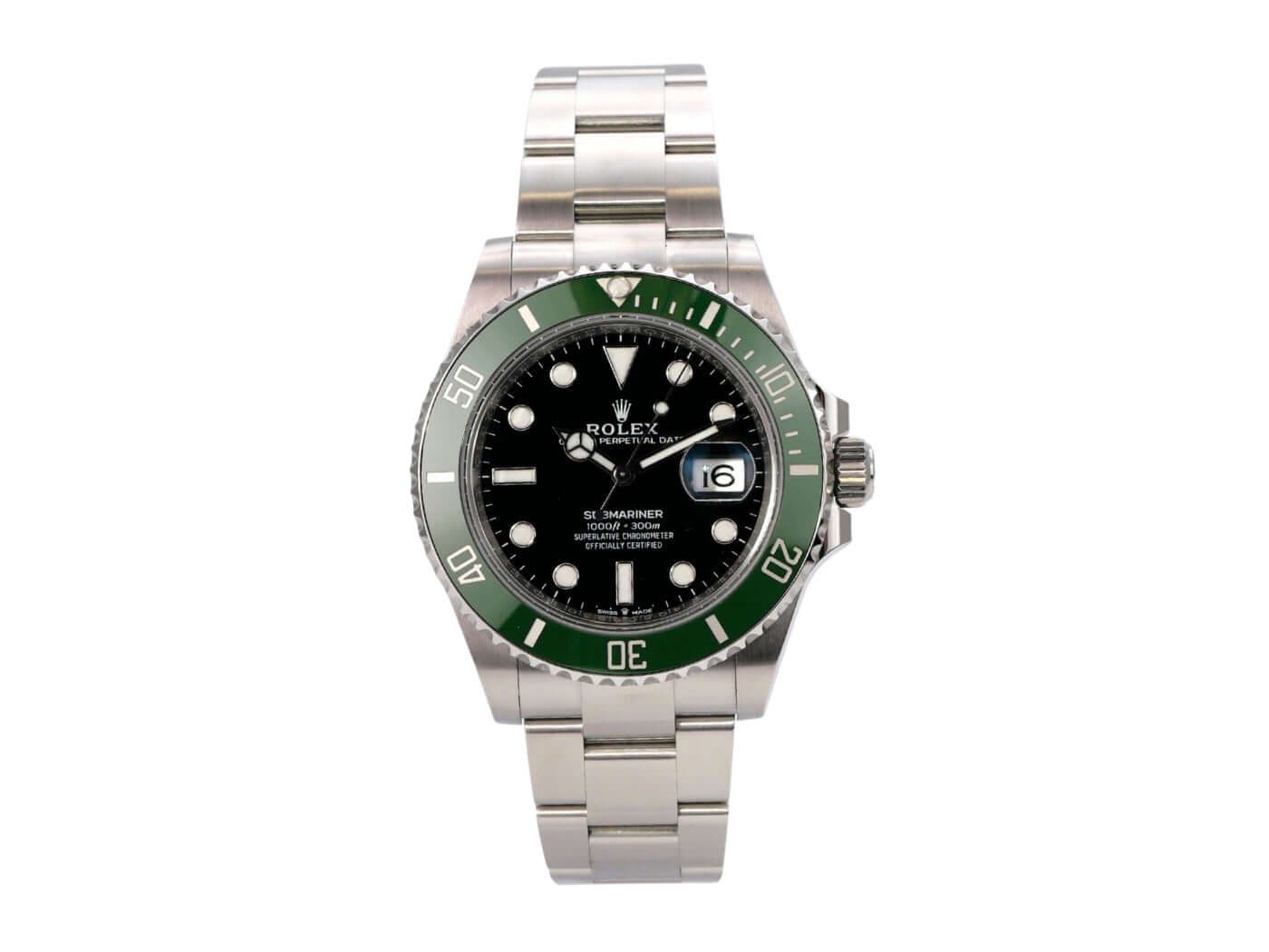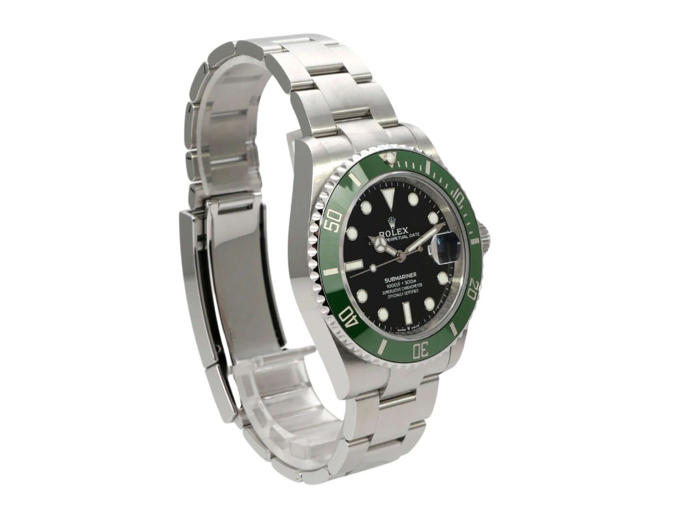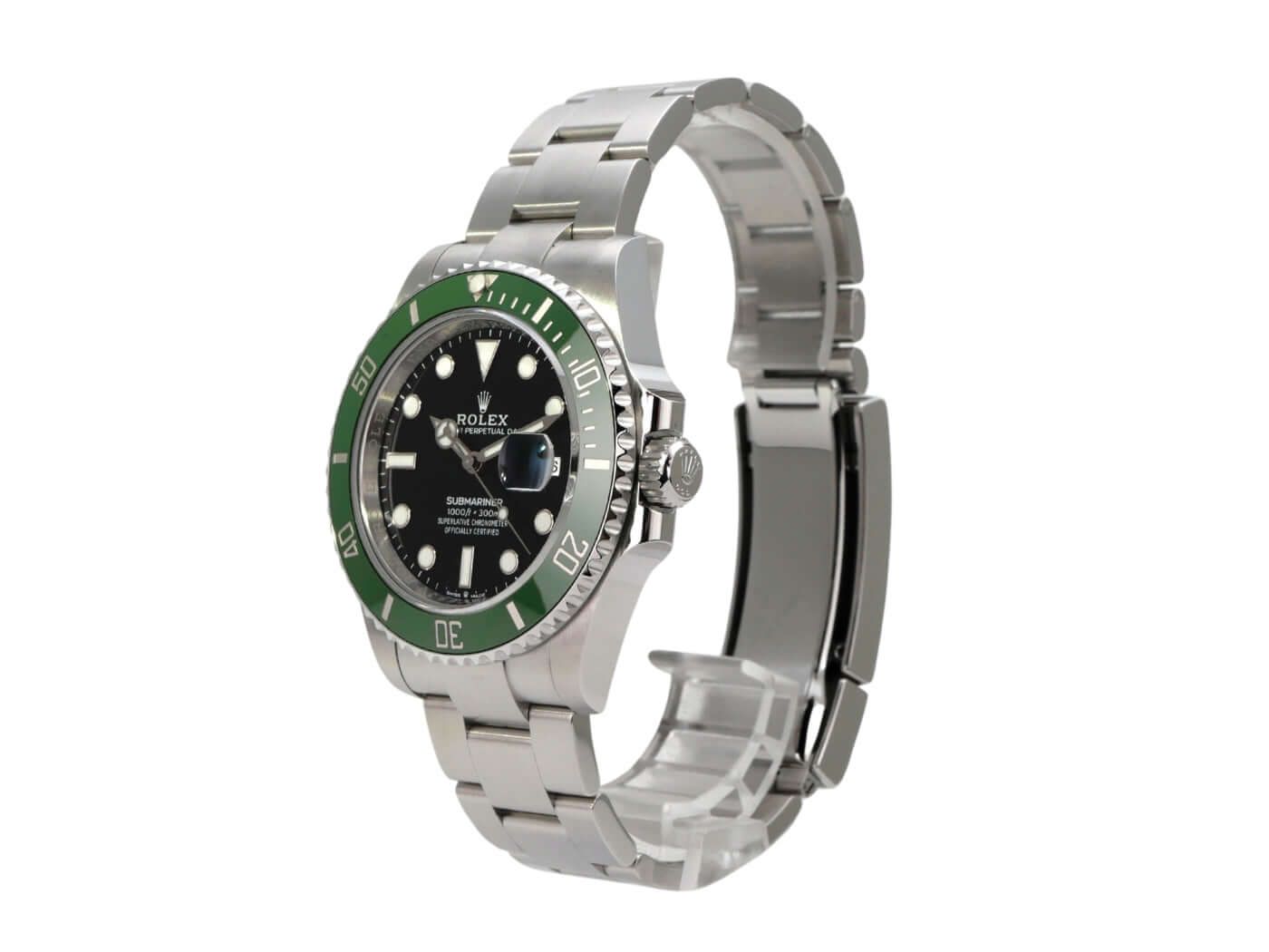 Rolex Submariner Date Stainless Steel Ref. 126610LV StarbucksCase made of polished and satin-finished stainless steel, case diameter 41 mm, case height 12.5 mm, stainless steel bezel with green ceramic insert, 60-minute scale and luminous dot, rotatable, Oyster stainless steel bracelet polished and satin-finished with safety folding clasp, black dial with applied luminous indices and luminous dots, luminous hands, automatic movement, Rolex caliber 3235 with 31 jewels, 28,800 vibrations per hour, 70-hour power reserve, date display with quick adjustment and magnifier, chronometer, sapphire crystal, screw-down crown with crown guards, screw-down stainless steel case back, water-resistant up to 30 bar.