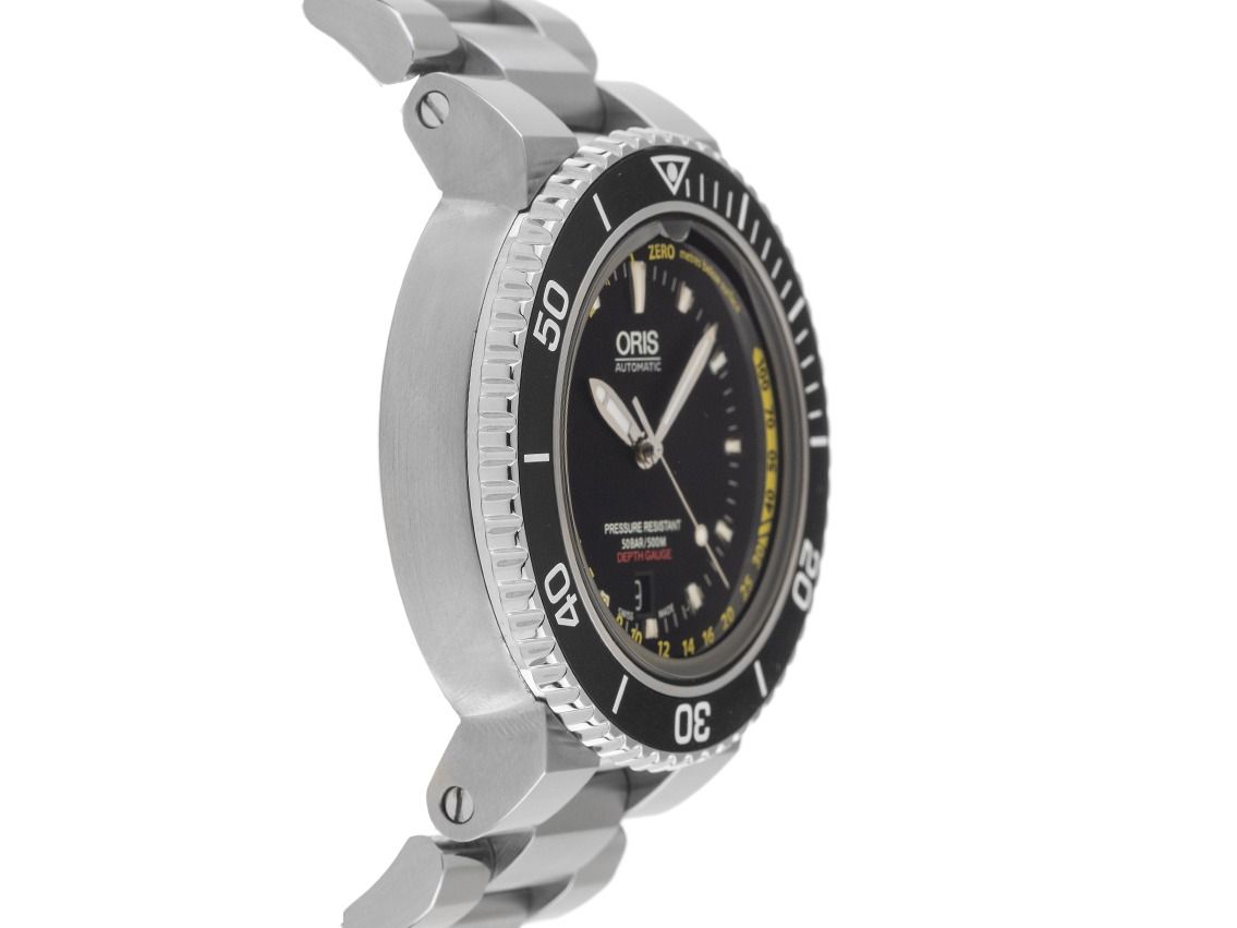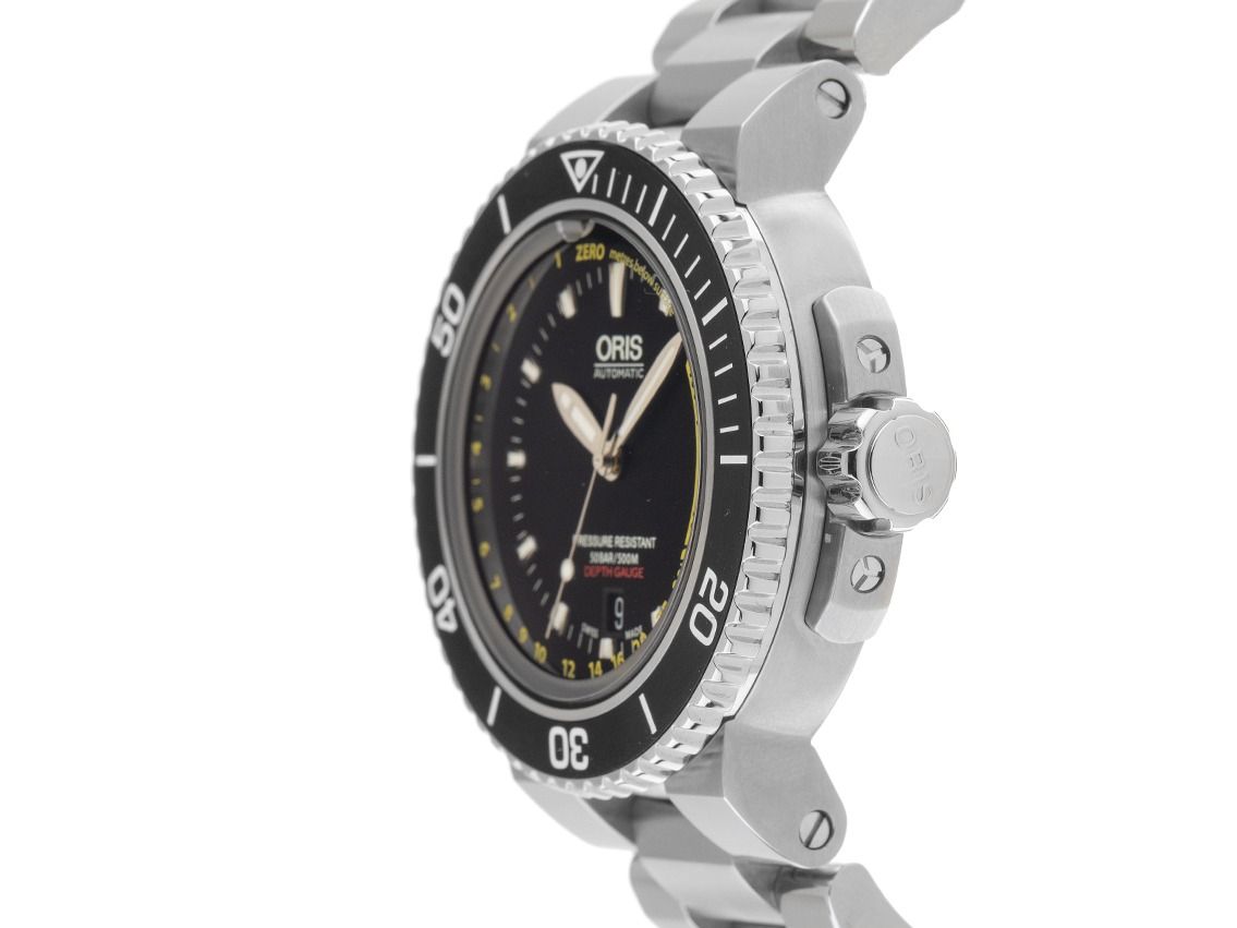Oris Aquis Depth Gauge Stahl Automatik Armband StahlGehäuse Edelstahl poliert und satiniert, Gehäusedurchmesser ohne Krone 46mm, Gehäusehöhe 15,3mm. Lünette Edelstahl mit schwarzem Inlay, 60-Minuten Skala und Leuchtpunkt, einseitig drehbar. Armband Edelstahl poliert und satiniert, Sicherheitsfaltschließe mit Hersteller-Logo. Zifferblatt schwarz mit aufgesetzten Edelstahl Indexen und Edelstahl Zeigern, schwarz / gelbe Tachymeterskala auf der Innenseite des Saphirglases. Uhrwerk Automatik, Kaliber Oris 1847MC mit 23 Edelsteinen. Anzeige von Stunde, Minute und Sekunde über Zeiger aus der Mitte mit Sekundenstopp zur sekundengenauen Einstellung der Uhrzeit, Datumsanzeige mit Schnellverstellung bei 6 Uhr. Saphirglas extra stark und kratzfest, mit kleiner Öffnung bei 12 Uhr wo ein kleiner Kanal verläuft entgegengesetzt dem Uhrzeigersinn im inneren Rand des Saphirglases zur Anzeige des Wassertiefe und endet zwischen 1 und 2 Uhr (sog. Boyle-Marionette Gesetz). Krone verschraubbar mit Flankenschutz und Hersteller-Logo. Boden Edelstahl verschraubt und graviert. Gewicht der Uhr inklusive Armband 244g, Länge des Armbandes inklusive Gehäuse 195mm. Referenznummer: 01 733 7675 4154-Set MB, Gehäusenummer: 3242XXX, ID: P234317000126H-4200, Artikelnummer: 10000084387. Mit Gangkontrolle und kompletter äußerlicher Aufarbeitung von Januar 2026. Original Oris Box mit Umkarton und Garantie Papiere von August 2013 sowie Beschreibung, zusätzliches Kautschuk Band schwarz und Bandwechsel Werkzeug, Erstkaufrechnung von Juli 2013 sowie Watchregister Auszug von Januar 2026, The Watch Register Zertifikat / ohne Eintrag (Internationale Datenbank für verlorene oder gestohlene Uhren), Full Set. Superschnäppchen, sehr seltenes Sammlerstück, fast nicht getragen. Wie Neu. Lieferzeit sofort.