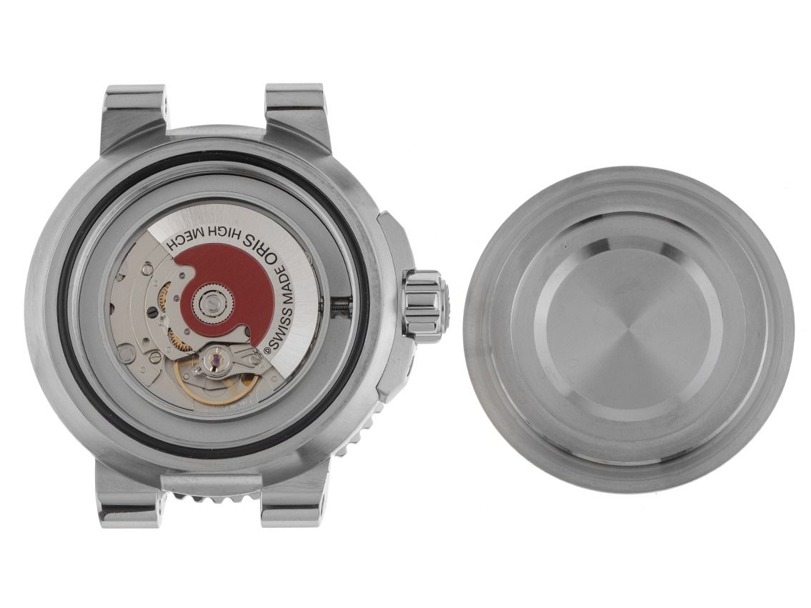 Gehäuse aus poliertem und satiniertem Edelstahl, Gehäusedurchmesser ohne Krone 46mm, Gehäusehöhe 15,3mm. Lünette aus Edelstahl mit schwarzem Inlay, 60-Minuten Skala und Leuchtpunkt, einseitig drehbar. Armband aus poliertem und satiniertem Edelstahl, Sicherheitsfaltschließe mit Hersteller-Logo. Zifferblatt schwarz mit aufgesetzten Edelstahl-Indizes und Edelstahlzeigern, schwarz/gelbe Tachymeterskala auf der Innenseite des Saphirglases. Uhrwerk Automatik, Kaliber Oris 1847MC mit 23 Edelsteinen. Anzeige von Stunde, Minute und Sekunde über Zeiger aus der Mitte mit Sekundenstopp zur sekundengenauen Einstellung der Uhrzeit, Datumsanzeige mit Schnellverstellung bei 6 Uhr. Saphirglas extra stark und kratzfest, mit kleiner Öffnung bei 12 Uhr, wo ein kleiner Kanal verläuft, entgegengesetzt dem Uhrzeigersinn im inneren Rand des Saphirglases zur Anzeige der Wassertiefe und endet zwischen 1 und 2 Uhr (sog. Boyle-Marionette Gesetz). Krone verschraubbar mit Flankenschutz und Hersteller-Logo. Boden aus Edelstahl, verschraubt und graviert. Gewicht der Uhr inklusive Armband 244g, Länge des Armbandes inklusive Gehäuse 195mm. Referenznummer: 01 733 7675 4154-Set MB, Gehäusenummer: 3242XXX, ID: P234317000126H-4200, Artikelnummer: 10000084387. Mit Gangkontrolle und kompletter äußerlicher Aufarbeitung von Januar 2026. Original Oris Box mit Umkarton und Garantieunterlagen von August 2013 sowie Beschreibung, zusätzliches schwarzes Kautschukband und Bandwechselwerkzeug, Erstkaufrechnung von Juli 2013 sowie Watchregister-Auszug von Januar 2026, The Watch Register Zertifikat / ohne Eintrag (Internationale Datenbank für verlorene oder gestohlene Uhren), Full Set. Superschnäppchen, sehr seltenes Sammlerstück, fast nicht getragen. Wie neu. Lieferzeit sofort.