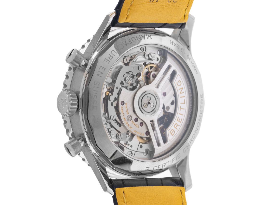 Gehäuse Edelstahl poliert, Gehäusedurchmesser ohne Krone 41mm, Gehäusehöhe 13,6mm. Lünette Edelstahl gerädelt, beidseitig drehbar mit Unterglas Rechenschieber. Armband Krokoleder schwarz mit heller Ziernaht, Anstoßbreite 22mm, Sicherheitsfaltschließe Edelstahl mit Hersteller-Logo. Zifferblatt blau mit aufgesetzten Edelstahl Indexen und Leuchtpunkten sowie Edelstahl Leuchtzeigern. Uhrwerk Automatik, Chronograph, Chronometer mit Zeugnis, Kaliber Breitling 01 mit 47 Edelsteinen. Anzeige von Stunde und Minute über Zeiger aus der Mitte, kleine Sekunde mit Sekundenstopp zur sekundengenauen Einstellung der Uhrzeit bei 9 Uhr, Datumsanzeige mit Schnellverstellung bei 6 Uhr. Saphirglas kratzfest, doppelseitig entspiegelt und bombiert. Krone mit Hersteller-Logo. Boden Edelstahl verschraubt und graviert mit Saphirglas Sichtfenster. Gewicht der Uhr inklusive Armband 91g. Wasserdicht bis 3 ATM. Referenznummer: AB0139241C1P1, ID: ST1160128380126H-9500, Artikelnummer: 10000084436. Original Breitling Box und Garantie Papiere von 2026 sowie Beschreibung, Full Set. Ungetragen. Lieferzeit sofort.