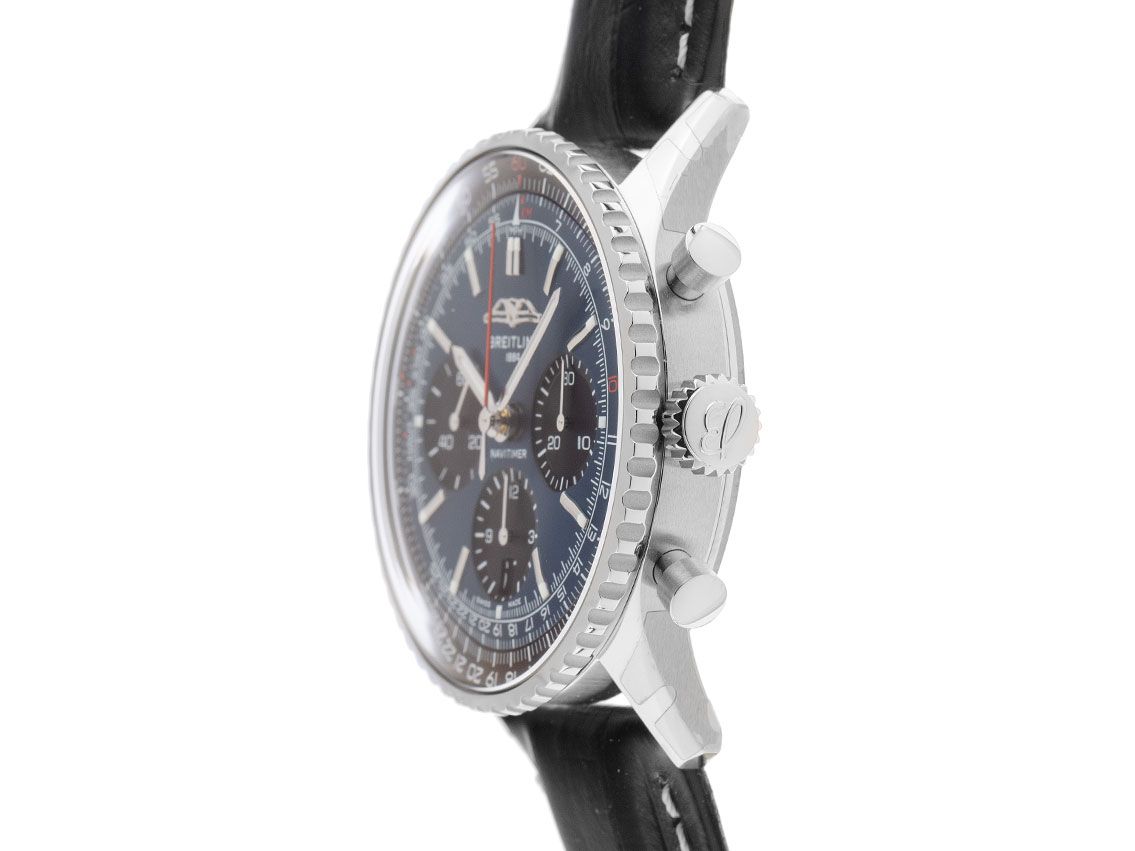 Breitling Navitimer B01 Stahl Automatik Chronograph Armband Krokoleder FaltschließeGehäuse Edelstahl poliert, Gehäusedurchmesser ohne Krone 41mm, Gehäusehöhe 13,6mm. Lünette Edelstahl gerädelt, beidseitig drehbar mit Unterglas Rechenschieber. Armband Krokoleder schwarz mit heller Ziernaht, Anstoßbreite 22mm, Sicherheitsfaltschließe Edelstahl mit Hersteller-Logo. Zifferblatt blau mit aufgesetzten Edelstahl Indexen und Leuchtpunkten sowie Edelstahl Leuchtzeigern. Uhrwerk Automatik, Chronograph, Chronometer mit Zeugnis, Kaliber Breitling 01 mit 47 Edelsteinen. Anzeige von Stunde und Minute über Zeiger aus der Mitte, kleine Sekunde mit Sekundenstopp zur sekundengenauen Einstellung der Uhrzeit bei 9 Uhr, Datumsanzeige mit Schnellverstellung bei 6 Uhr. Saphirglas kratzfest, doppelseitig entspiegelt und bombiert. Krone mit Hersteller-Logo. Boden Edelstahl verschraubt und graviert mit Saphirglas Sichtfenster. Gewicht der Uhr inklusive Armband 91g. Wasserdicht bis 3 ATM. Referenznummer: AB0139241C1P1, ID: ST1160128380126H-9500, Artikelnummer: 10000084436. Original Breitling Box und Garantie Papiere von 2026 sowie Beschreibung, Full Set. Ungetragen. Lieferzeit sofort.