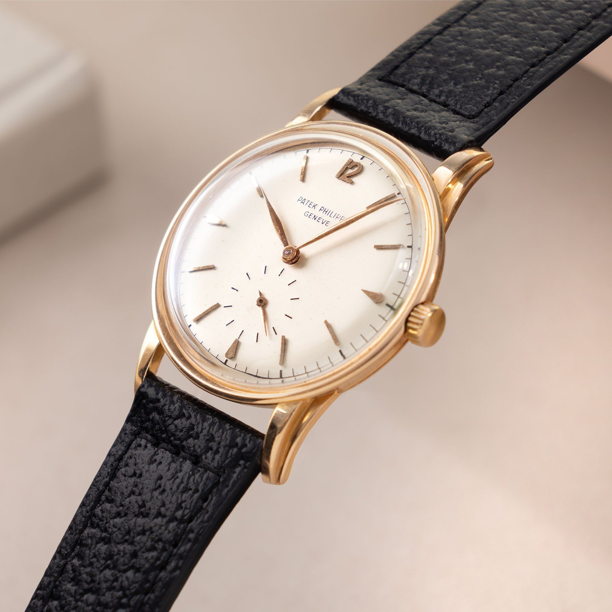 Launched in 1932 with the iconic reference 96, the Patek Philippe Calatrava represents the purest expression of the classic dress watch. Born under the Stern family’s stewardship during the Great Depression, it marked a new direction for Patek Philippe—one focused on clarity, balance, and understated elegance. The inaugural reference 96 moved away from the complexity of pocket watches, embracing a clean, modern wristwatch design that reflected both the practical and aesthetic sensibilities of its time. This particular Calatrava is the rarely seen reference 2452R, a 35 mm masterpiece executed in 18k rose gold. It features beautifully downturned, stepped lugs and a concave bezel plus a snap-back case, giving the watch an elegant yet purposeful presence on the wrist. The silver dial is thoughtfully executed, with an Arabic 12, dagger-shaped markers at 3, 6, and 9, and simple stick markers for the remaining hours. A small running seconds sub-dial, graceful leaf hands, and a hard enamel Patek Philippe signature complete the composition. The watch is paired with a Bulang & Sons leather strap, and an additional used original Patek Philippe strap is also included in the sale. Both the watch and its hand-wound caliber 10-400 movement have been fully serviced by our watchmaker. We have always loved the Calatrava—it is the backbone of Patek Philippe. In this size and style, it’s simply a no-brainer in our view! Specifications Patek Philippe Calatrava Reference 2452R 35mm 18k Rose Gold Case with snap-back case-back Silver dial with small seconds and non-lumed leaf hands, hard enamel signature Bulang and sons leather strap and an extra, used Patek Philippe strap Calibre 10-400 hand wound movement Case number 95xxxx, movement number 95xxxx , dating to circa 1955 Fully serviced by our watchmaker One-year mechanical warranty Free worldwide FedEx Priority shipping
