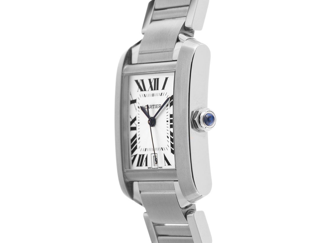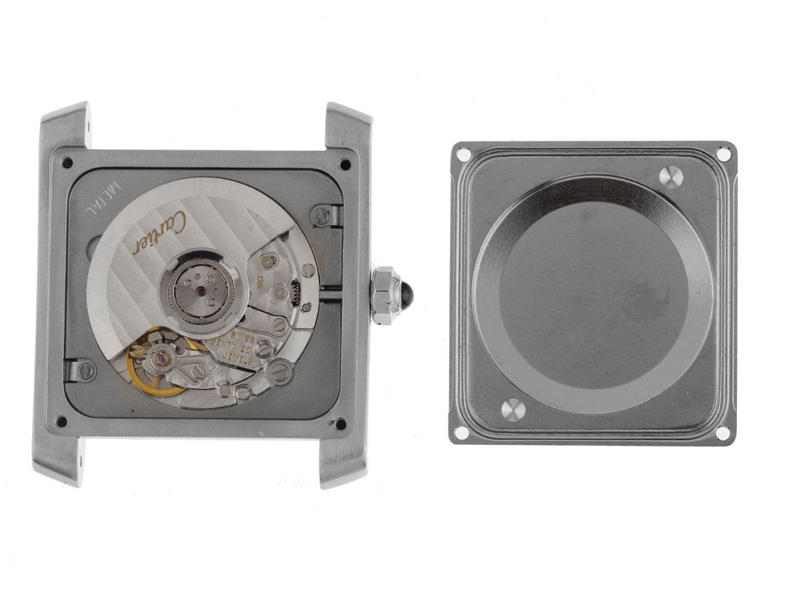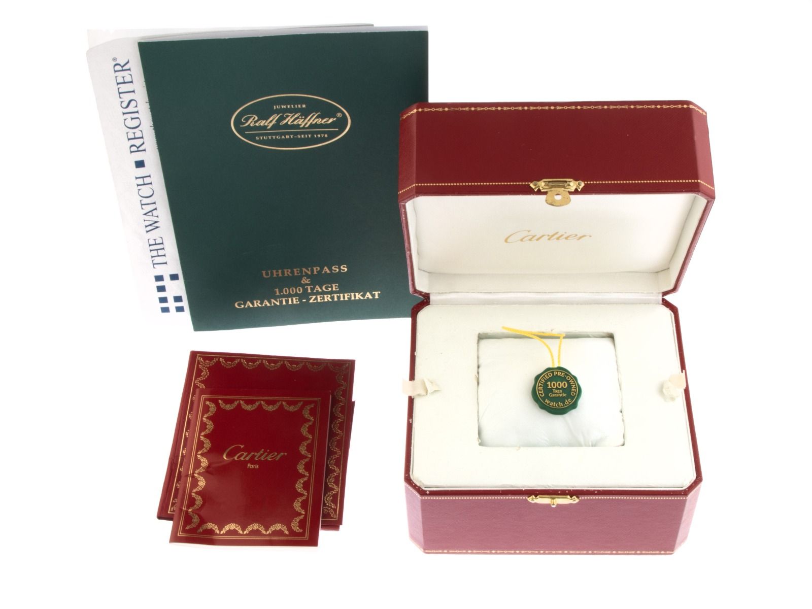 Gehäuse aus poliertem und satiniertem Edelstahl, Gehäusemaße ohne Krone (L x B x H) 32 x 28 x 7,5 mm. Armband aus poliertem und satiniertem Edelstahl, verdeckte Doppelfaltschließe aus Edelstahl. Zifferblatt cremeweiß mit schwarzen römischen Ziffern und gebläuten Zeigern. Uhrwerk Automatik, Kaliber Cartier 120 mit 20 Edelsteinen. Anzeige von Stunde, Minute und Sekunde über Zeiger aus der Mitte, Datumsanzeige mit Schnellverstellung bei 6 Uhr. Saphirglas kratzfest. Krone mit Saphir Cabochon. Boden aus Edelstahl, 4-fach verschraubt und graviert. Gewicht der Uhr inklusive Armband 97 g, Länge des Armbandes inklusive Gehäuse 180 mm. Referenznummer: 2302, Gehäusenummer: 39245XXX, Baujahr: 2004, ID: P236746180126H-5400, Artikelnummer: 10000084466. Mit Gangkontrolle und kompletter äußerlicher Aufarbeitung von Januar 2026. Original Cartier Box sowie Beschreibung und Watchregister Auszug von Januar 2026, The Watch Register Zertifikat / ohne Eintrag (Internationale Datenbank für verlorene oder gestohlene Uhren). Superschnäppchen. Sehr guter Zustand. Lieferzeit sofort.