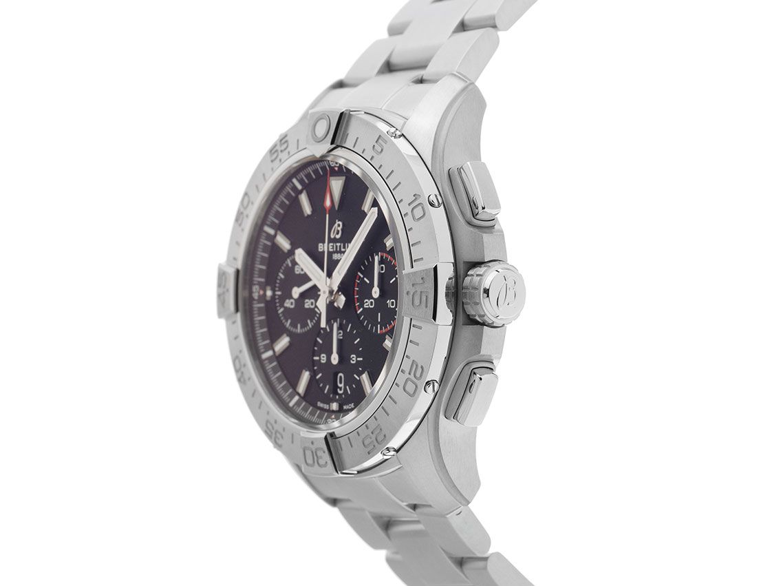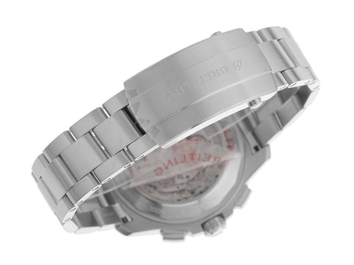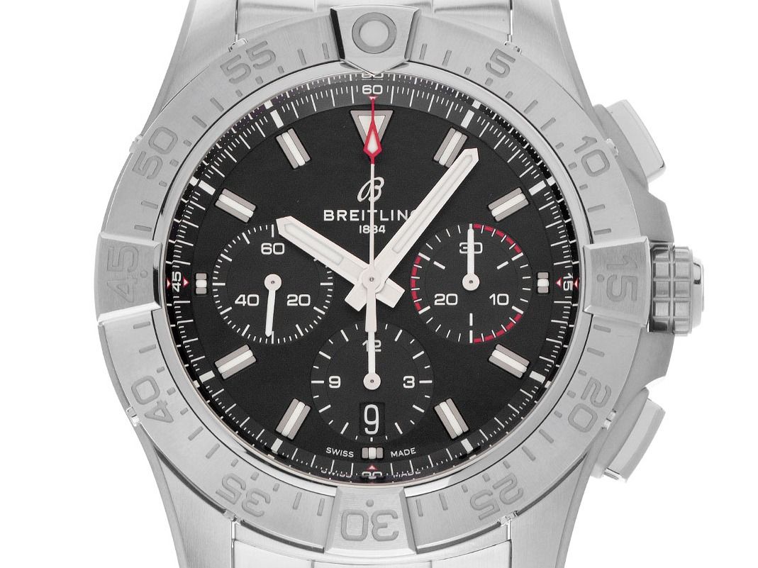 Gehäuse aus satiniertem Edelstahl, Gehäusedurchmesser ohne Krone 44 mm, Gehäusehöhe 15,2 mm. Lünette aus satiniertem Edelstahl mit 60-Minuten-Skala und Leuchtpunkt, einseitig drehbar. Armband aus satiniertem Edelstahl, Sicherheitsfaltschließe aus Edelstahl mit Hersteller-Logo. Zifferblatt schwarz mit aufgesetzten Leuchtindexen und Leuchtzeigern. Uhrwerk Automatik, Chronograph, Chronometer mit Zeugnis, Breitling Manufakturkaliber 01 mit 45 Edelsteinen, Gangreserve ca. 70 Stunden. Anzeige von Stunde und Minute über Zeiger aus der Mitte, kleine Sekunde mit Sekundenstopp zur sekundengenauen Einstellung der Uhrzeit bei 9 Uhr, Datumsanzeige mit Schnellverstellung bei 6 Uhr. Saphirglas kratzfest, beidseitig entspiegelt und bombiert. Krone verschraubbar mit Flankenschutz und Hersteller-Logo. Boden aus Edelstahl verschraubt und graviert mit Saphirglas-Sichtfenster. Gewicht der Uhr inklusive Armband 206 g, Länge des Armbandes inkl. Gehäuse 200 mm. Wasserdicht bis 30 ATM. Referenznummer: AB0147101B1A1, ID: ST116099380126H-7200, Artikelnummer: 10000084464. Original Breitling Box und Garantie-Papiere von Januar 2026 sowie Beschreibung, Full Set. Ungetragen. Lieferzeit sofort.