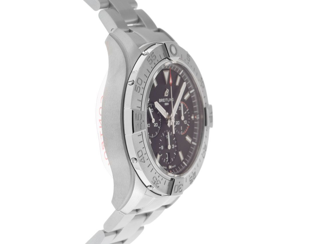 Breitling Avenger B01Chrongraph Stahl Automatik Armband StahlGehäuse Edelstahl satiniert, Gehäusedurchmesser ohne Krone 44mm, Gehäusehöhe 15,2mm. Lünette Edelstahl satiniert mit 60-Minuten Skala und Leuchtpunkt, einseitig drehbar. Armband Edelstahl satiniert, Sicherheitsfaltschließe Edelstahl mit Hersteller-Logo. Zifferblatt schwarz mit aufgesetzten Leuchtindexen und Leuchtzeigern. Uhrwerk Automatik, Chronograph, Chronometer mit Zeugnis, Breitling Manufakturkaliber 01 mit 45 Edelsteinen, Gangreserve ca. 70 Stunden. Anzeige von Stunde und Minute über Zeiger aus der Mitte, kleine Sekunde mit Sekundenstopp zur sekundengenauen Einstellung der Uhrzeit bei 9 Uhr, Datumsanzeige mit Schnellverstellung bei 6 Uhr. Saphirglas kratzfest, beidseitig entspiegelt und bombiert. Krone verschraubbar mit Flankenschutz und Hersteller-Logo. Boden Edelstahl verschraubt und graviert mit Saphirglas Sichtfenster. Gewicht der Uhr inklusive Armband 206g, Länge des Armbandes inkl. Gehäuse 200mm. Wasserdicht bis 30 ATM. Referenznummer: AB0147101B1A1, ID: ST116099380126H-7200, Artikelnummer: 10000084464. Original Breitling Box und Garantie Papiere von Januar 2026 sowie Beschreibung, Full Set. Ungetragen. Lieferzeit sofort.