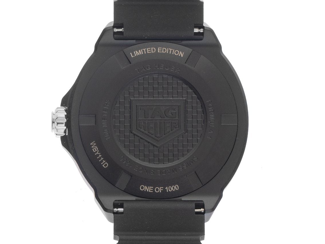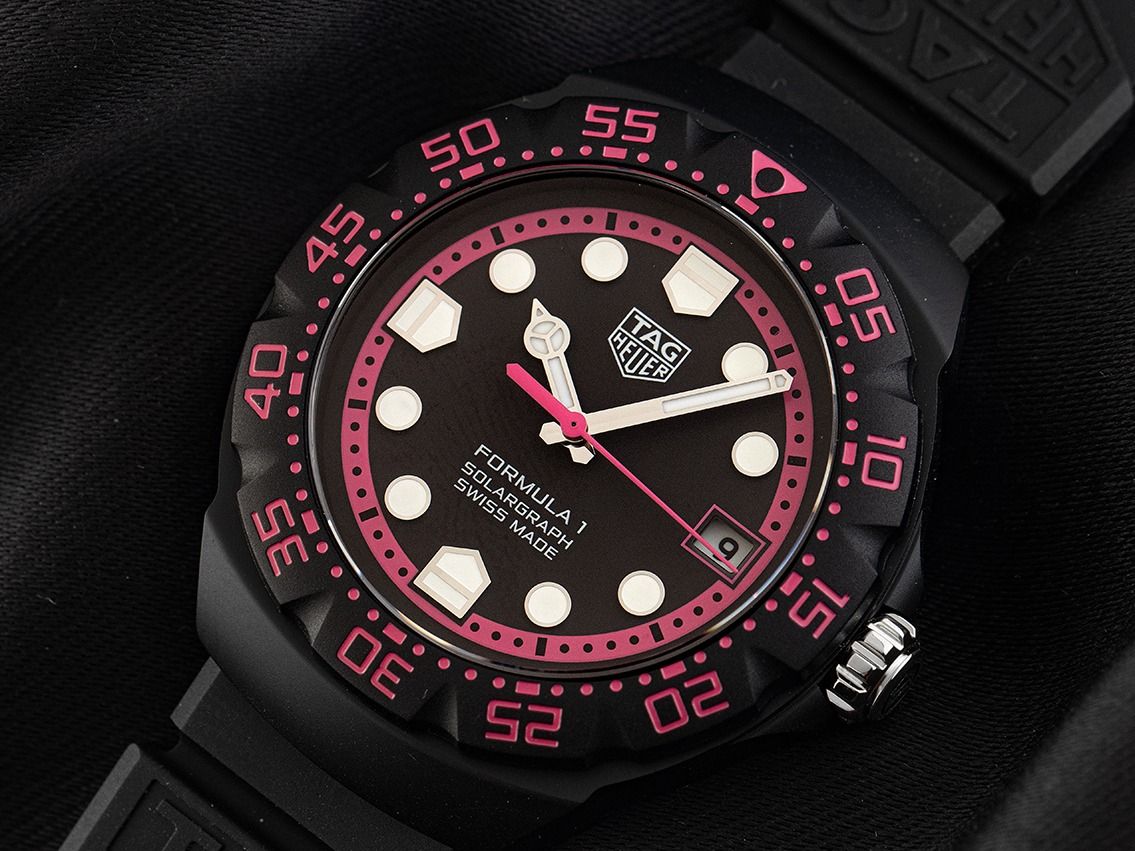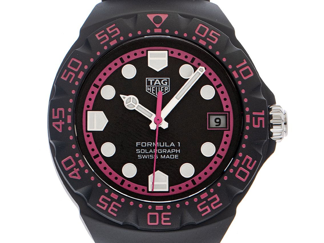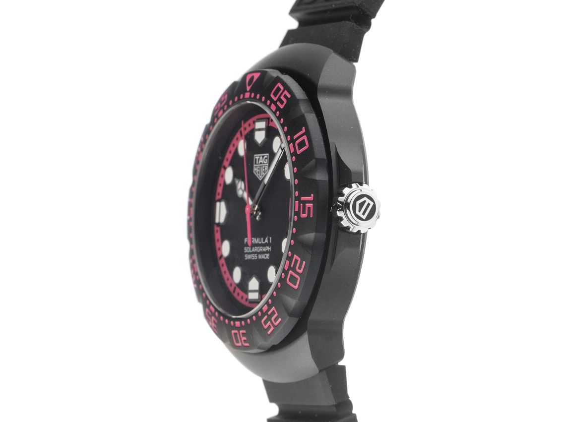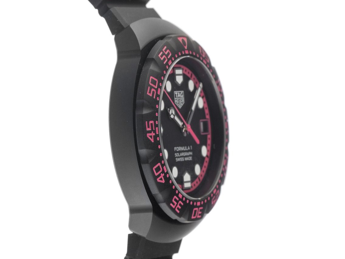 Tag Heuer Formula 1 Solargraph Edelstahl mit DLC-Beschichtung Schwarz Quarz Armband KautschukGehäuse Edelstahl mit DLC-Beschichtung schwarz satiniert, Gehäusedurchmesser ohne Krone 38mm, Gehäusehöhe 9,9mm. Lünette Edelstahl mit DLC-Beschichtung matt schwarz mit 60-Minuten Einteilung, beidseitig drehbar. Armband Kautschuk schwarz, Anstoßbreite 18mm, Stiftschließe Edelstahl DLC beschichtet mit Hersteller-Logo. Zifferblatt schwarz mit pinker Minuterie, aufgesetzten Leuchtindexen und Edelstahl Leuchtzeigern. Uhrwerk quarzgesteuert Kaliber TH50-00. Anzeige von Stunde, Minute und Sekunde über Zeiger aus der Mitte mit Sekundenstopp zur sekundengenauen Einstellung der Uhrzeit, Datumsanzeige mit Schnellverstellung bei 3 Uhr. Saphirglas kratzfest. Krone geriffelt mit Flankenschutz und Hersteller-Logo. Boden Edelstahl mit DLC-Beschichtung schwarz, verschraubt und graviert mit Tag Heuer Relief. Gewicht der Uhr inklusive Armband 71g. Wasserdicht bis 10 ATM. Referenznummer: WBY111D.FT8084, ID: ST116023700126H-1950, Artikelnummer: 10000084475. Original Tag Heuer Box mit Umkarton und Garantie Papiere von 2026 sowie Beschreibung, Full Set. Limitiert auf 1000 Exemplare. Ungetragen. Lieferzeit sofort.