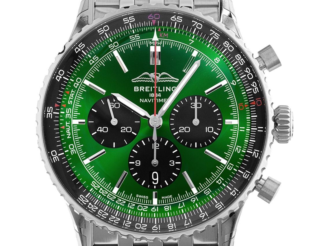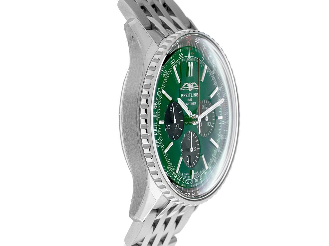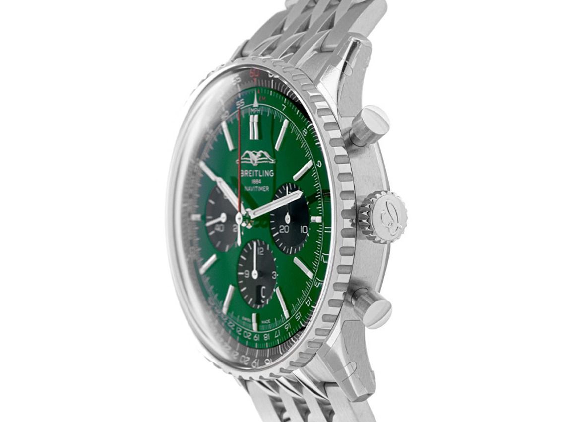 Gehäuse aus poliertem Edelstahl, Gehäusedurchmesser ohne Krone 46mm, Gehäusehöhe 13,9mm. Lünette aus Edelstahl mit geriffeltem Rand und Unterglas-Rechenschieber, beidseitig drehbar. Armband aus poliertem und satiniertem Edelstahl, Doppelsicherheitsfaltschließe aus Edelstahl mit Hersteller-Logo. Zifferblatt in grün mit aufgesetzten Edelstahl-Leuchtindizes und Edelstahl-Leuchtzeigern. Uhrwerk Automatik, Chronograph, Chronometer mit Zeugnis, Breitling Manufakturkaliber B01 mit 47 Edelsteinen, Gangreserve ca. 70 Stunden. Anzeige von Stunde und Minute über Zeiger aus der Mitte, kleine Sekunde mit Sekundenstopp zur sekundengenauen Einstellung der Uhrzeit bei 9 Uhr, Datumsanzeige mit Schnellverstellung bei 6 Uhr. Saphirglas kratzfest, doppelseitig entspiegelt und bombiert. Krone mit Hersteller-Logo. Boden aus Edelstahl, verschraubt und graviert mit Saphirglas-Sichtfenster. Gewicht der Uhr inklusive Armband 183g, Länge des Armbandes inklusive Gehäuse 225mm. Wasserdicht bis 3 ATM. Referenznummer: AB0137241L1A1, ID: ST1160133200126H-9850, Artikelnummer: 10000084473. Original Breitling Box und Garantie-Papiere von Januar 2026, Full Set. Ungetragen. Lieferzeit sofort.