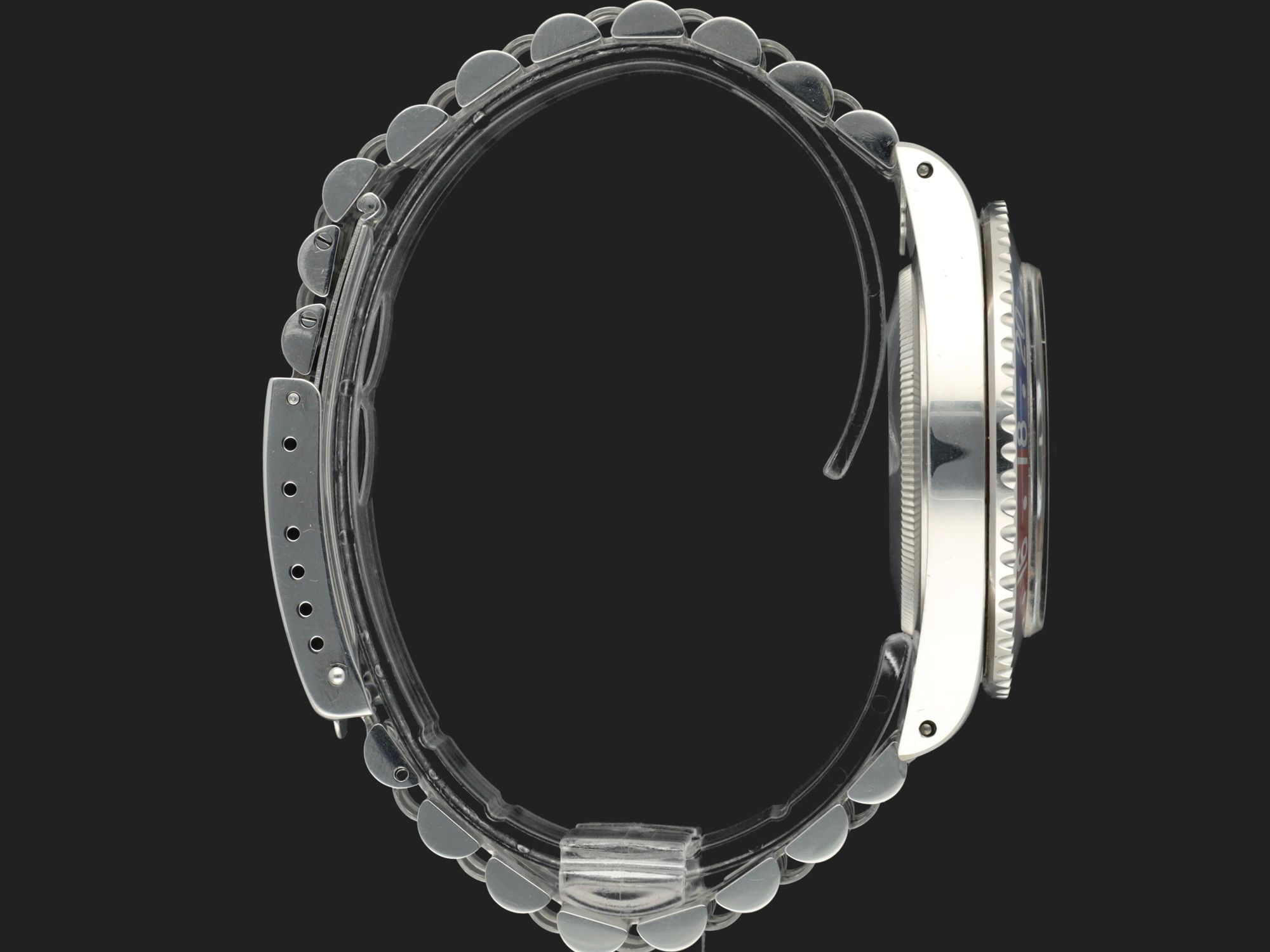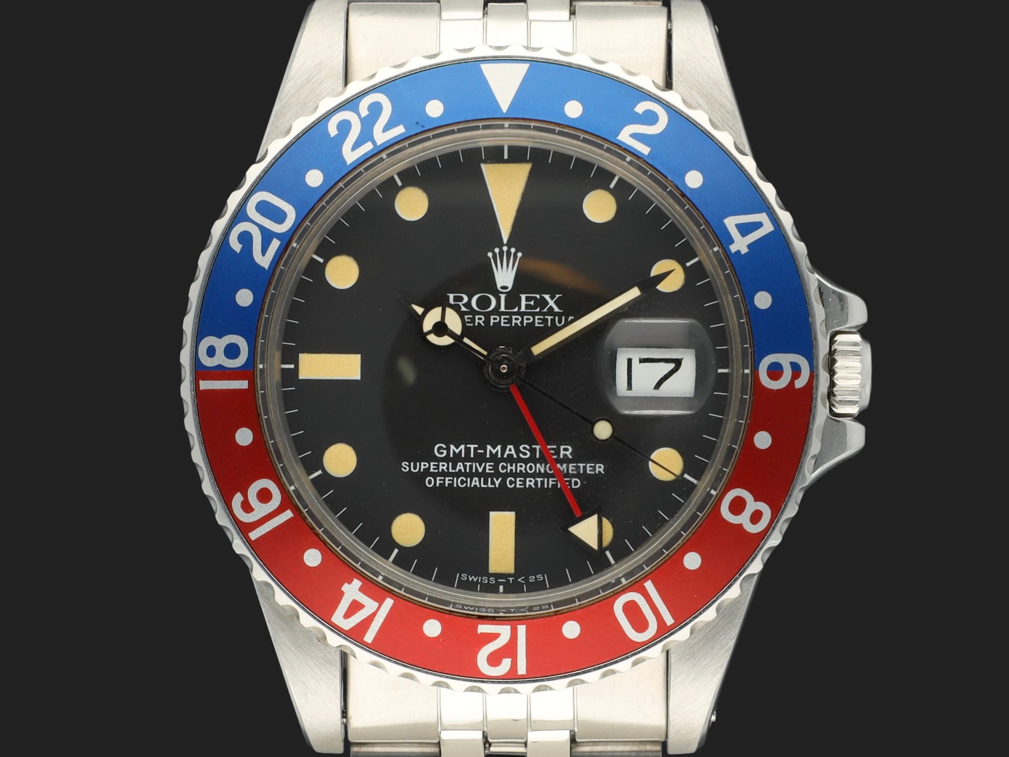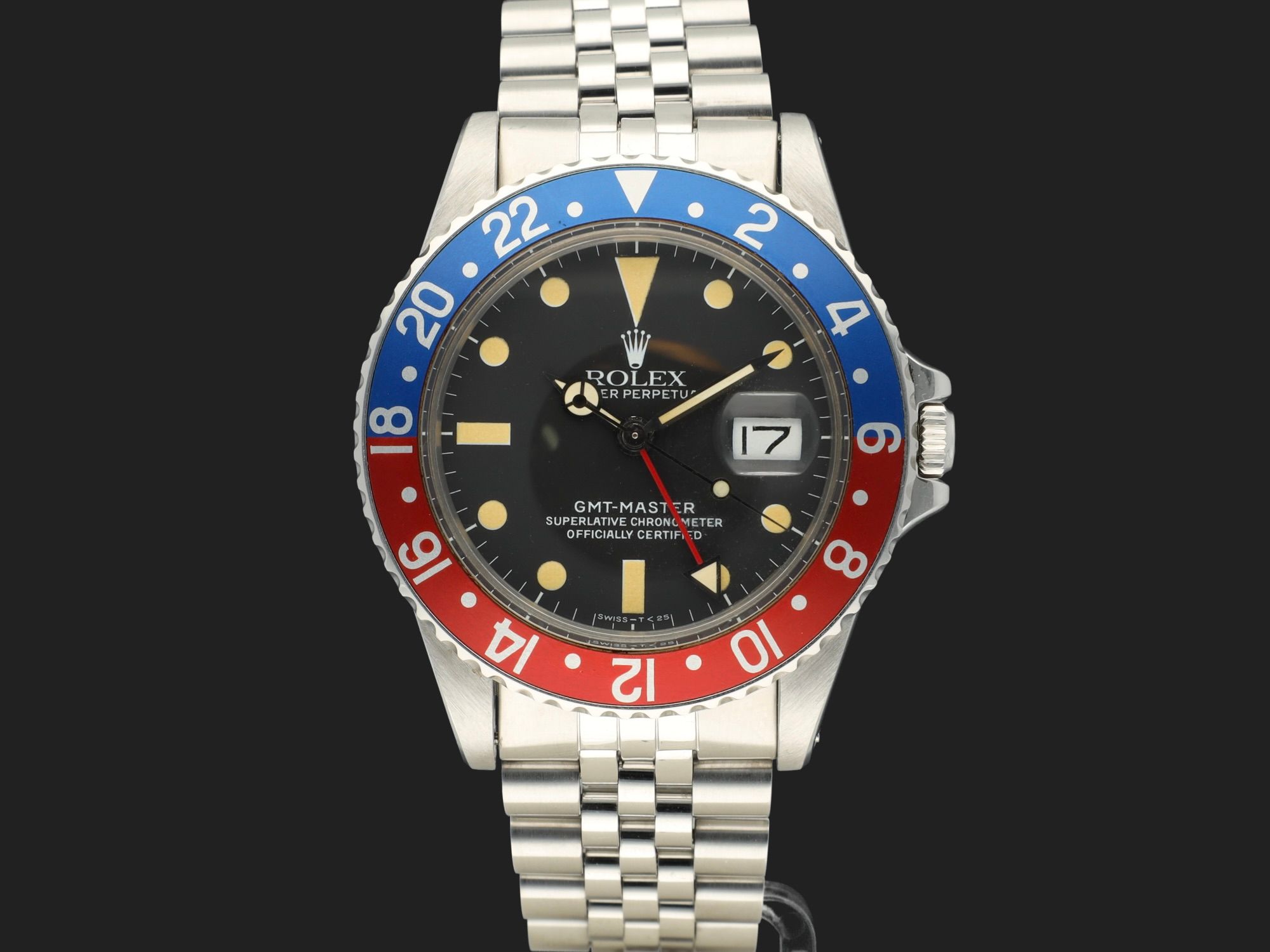 Es verfügt über einen originalen roten Pepsi-Einsatz, ein 62510H Jubilee-Armband mit F-Schließe (1983) und 555 Endlinks.