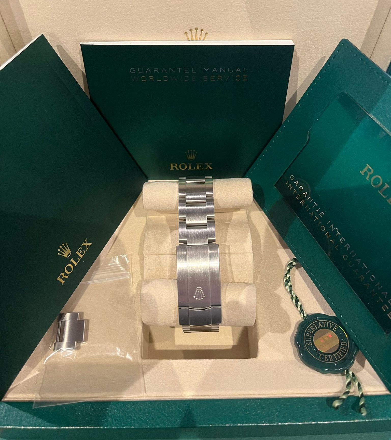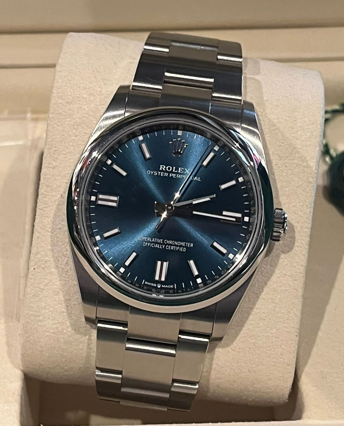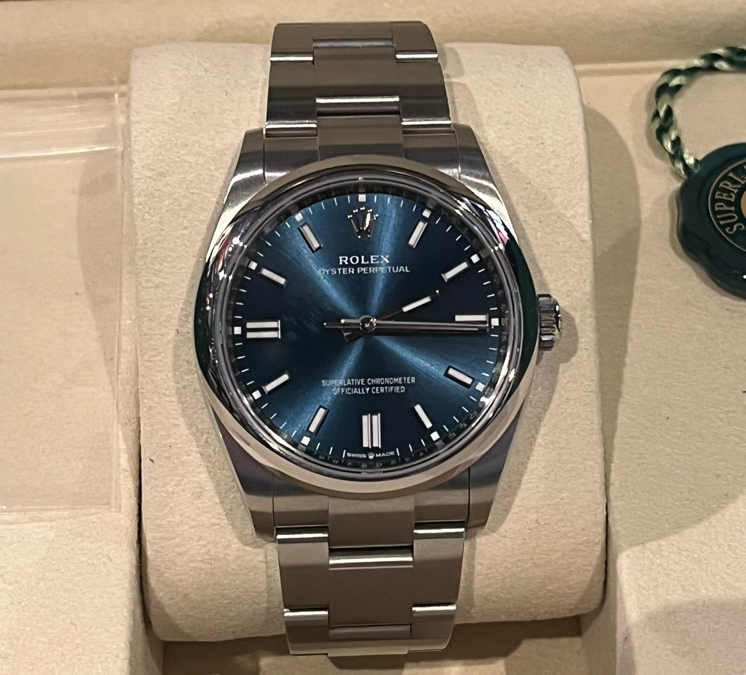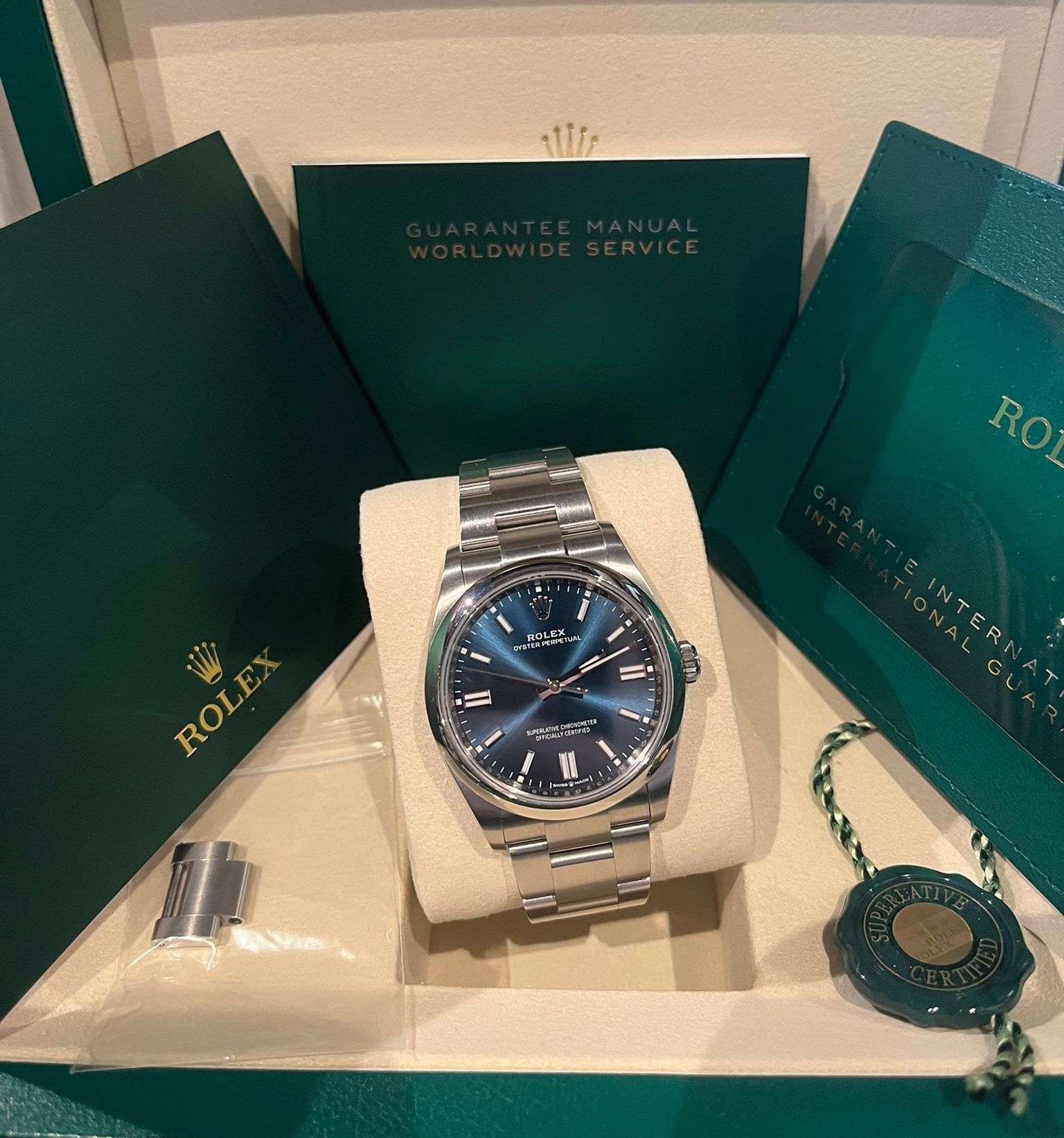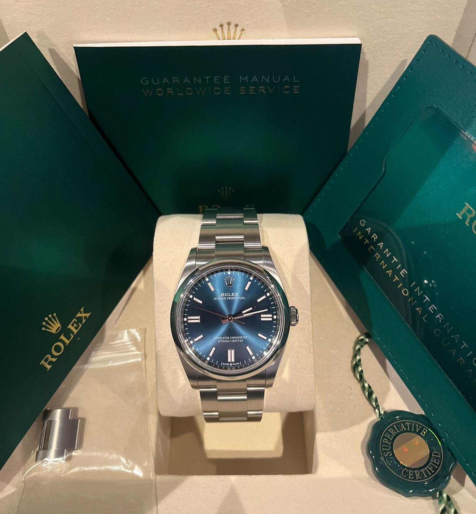 The watch comes as a full set, including the original Rolex box, warranty card, booklets, and all original full links. An excellent opportunity to acquire a nearly new Oyster Perpetual 36 in one of the most desirable dial colors, offered in complete and well-preserved condition.