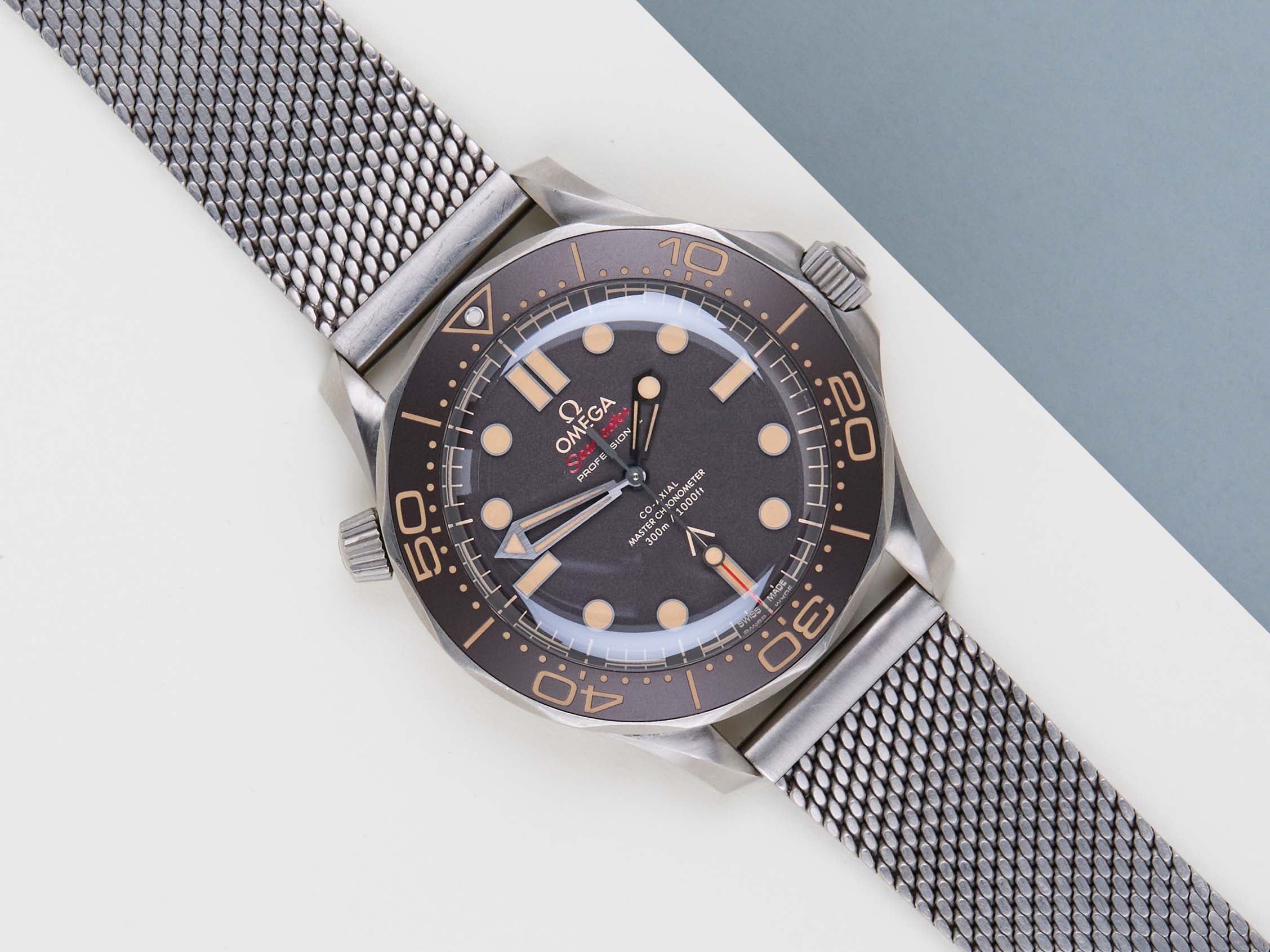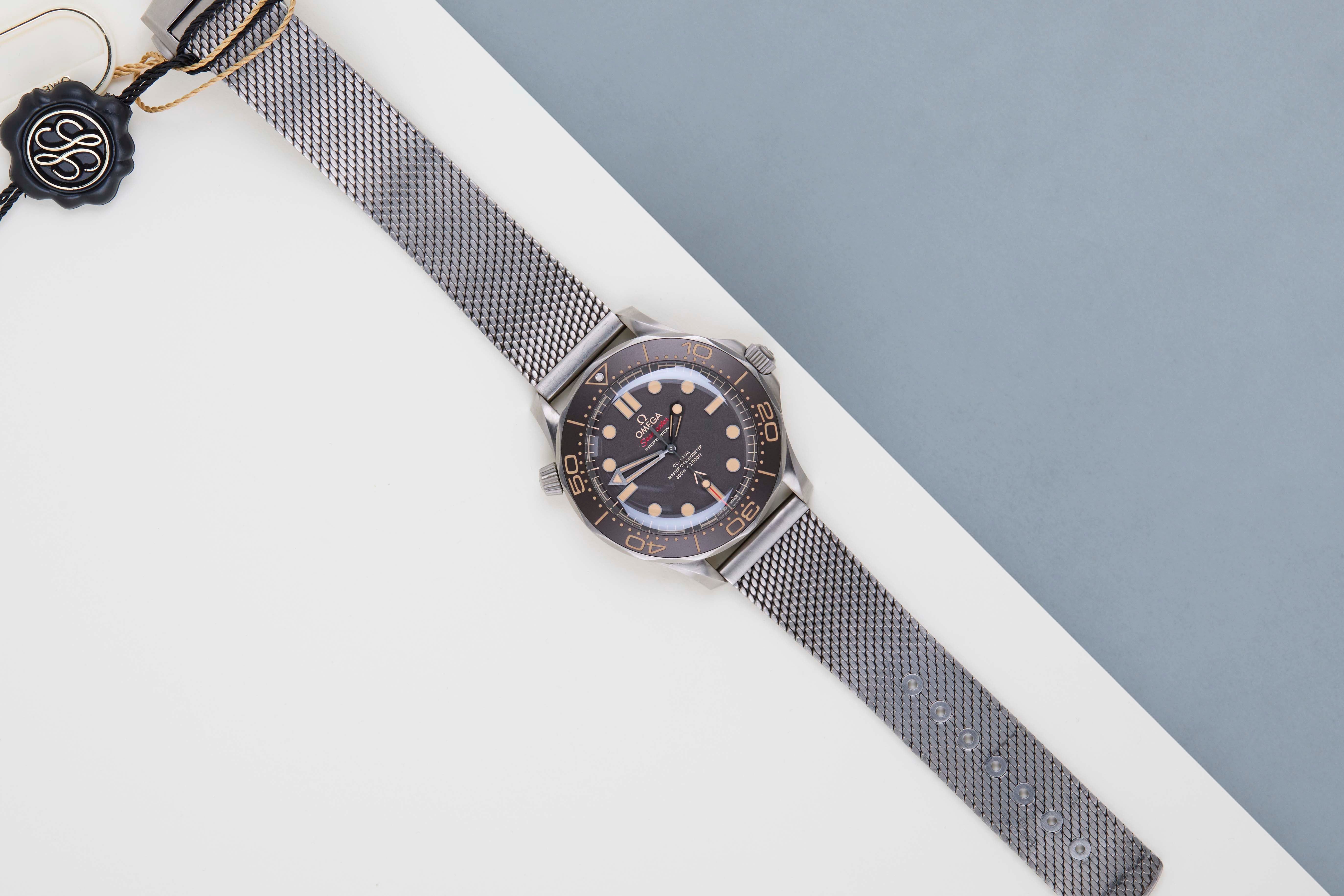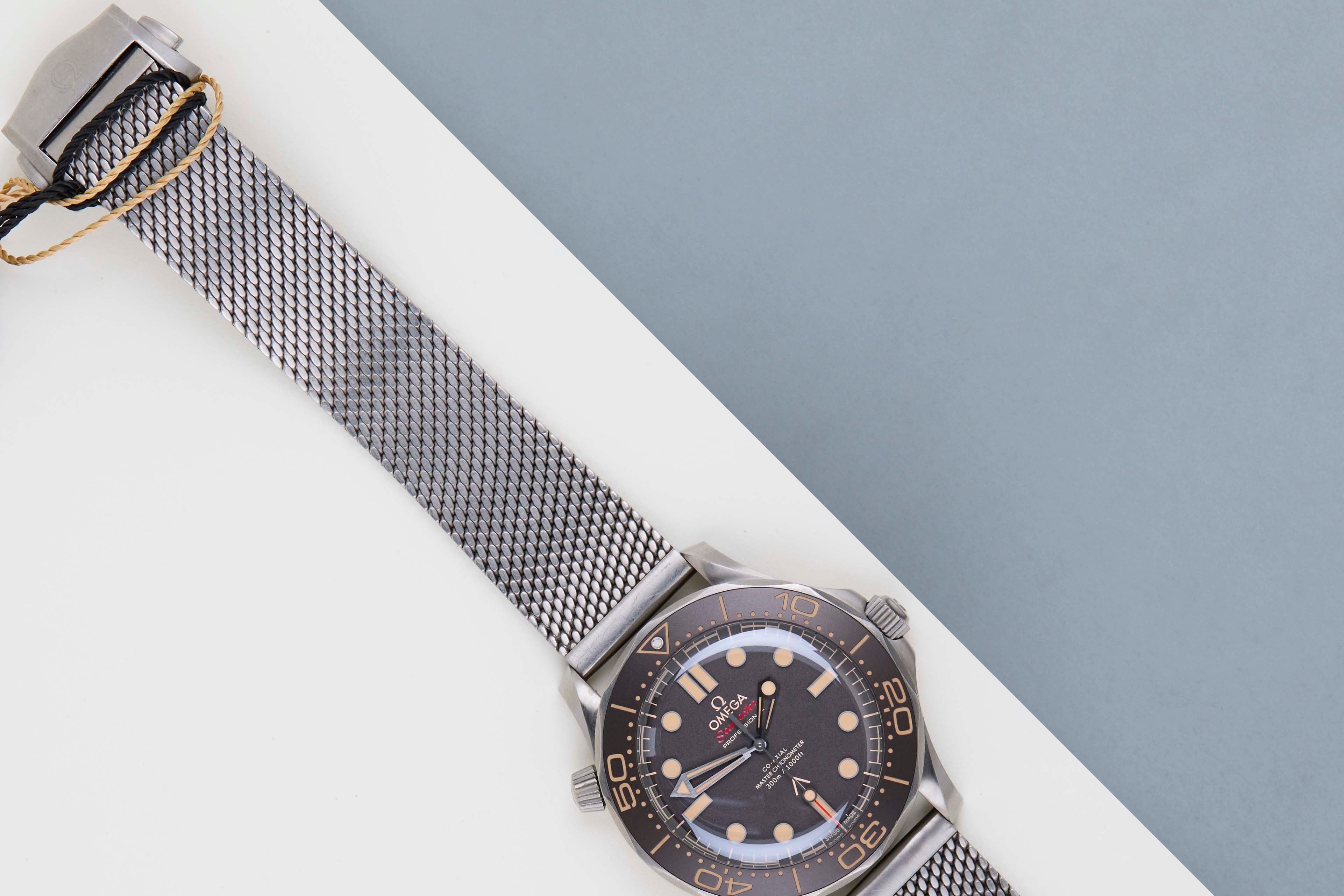 Full Set | Including both Original Omega Titanium and Nato StrapIdentical to 007's watch in No Time To Die this 42mm Seamaster, in strong yet light Grade 2 Titanium, sports a brown tropical aluminium bezel ring and dial.Slightly slimmer than the standard Diver 300M models thanks to the doming of the sapphire-crystal glass. The 007-edition Diver is powered by OMEGA's Co-Axial Master Chronometer 8806, which has achieved the industry’s highest standards of precision, chronometric performance - and of course - magnetic resistance.This Omega is in Mint condition and comes with the original Omega Warranty Papers and Box. Furthermore, the watch has been checked by our watchmaker, and therefore it comes with one year of Steiner warranty.