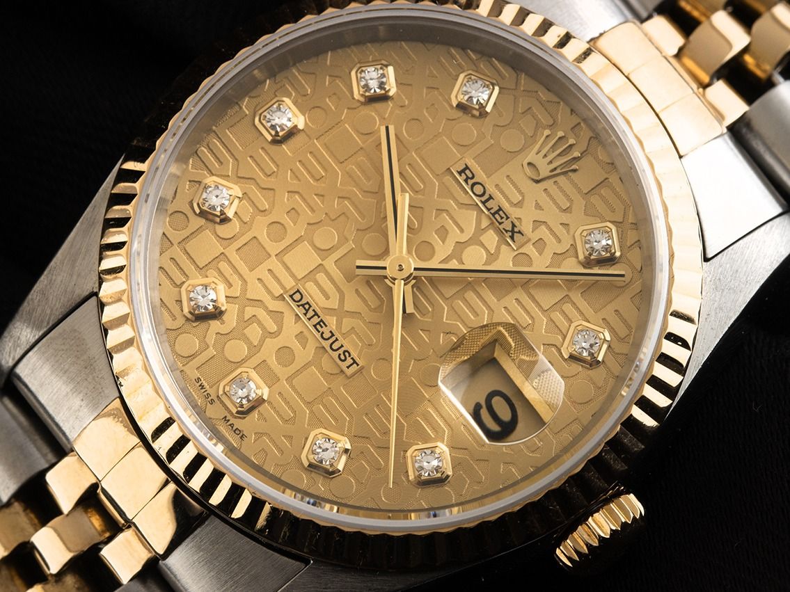 Gehäuse aus poliertem und satiniertem Edelstahl, Gehäusedurchmesser ohne Krone 36mm, Gehäusehöhe 11,8mm. Lünette aus 18kt Gelbgold, geriffelt und poliert. Armband Jubilé aus poliertem und satiniertem Edelstahl / 18kt Gelbgold, Faltschließe aus Edelstahl mit Hersteller-Logo. Zifferblatt Jubilé in champagnerfarben mit 10 aufgesetzten, in Gelbgold gefassten Diamantindexen und gelbgoldenen Zeigern. Uhrwerk Automatik, Chronometer, Rolex Manufakturkaliber 3135 mit 31 Edelsteinen. Anzeige von Stunde, Minute und Sekunde über Zeiger aus der Mitte mit Sekundenstopp zur sekundengenauen Einstellung der Uhrzeit, Datumsanzeige mit Schnellverstellung unter Glaslupe bei 3 Uhr. Saphirglas kratzfest. Krone aus 18kt Gelbgold, verschraubbar mit Hersteller-Logo. Boden aus Edelstahl, verschraubt. Gewicht der Uhr inklusive Armband 96g, Länge des Armbandes inklusive Gehäuse 170mm. Referenznummer: 16233, Gehäusenummer: W962XXX, Baujahr: 1995, ID: P1876100001125H-10200, Artikelnummer: 10000083079. Mit Gangkontrolle und kompletter äußerlicher Aufarbeitung von November 2025. Original Rolex Box mit Umkarton sowie Beschreibung, Ledermäppchen, Übersetzungsheft, Rolex Chronometer-Siegel und Watchregister Auszug von November 2025, The Watch Register Zertifikat / ohne Eintrag (Internationale Datenbank für verlorene oder gestohlene Uhren). Kapitalanlage mit Wertsteigerungspotential, extrem seltenes Sammlerstück. Sehr guter Zustand. Lieferzeit sofort.