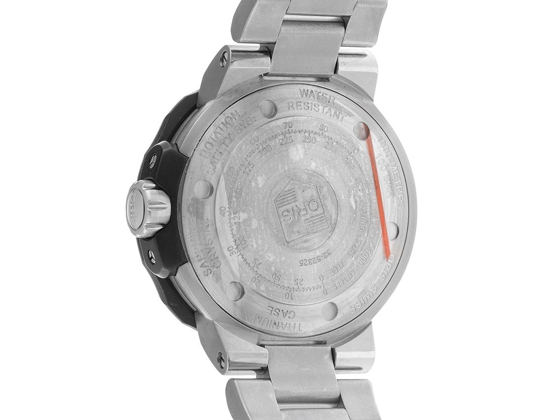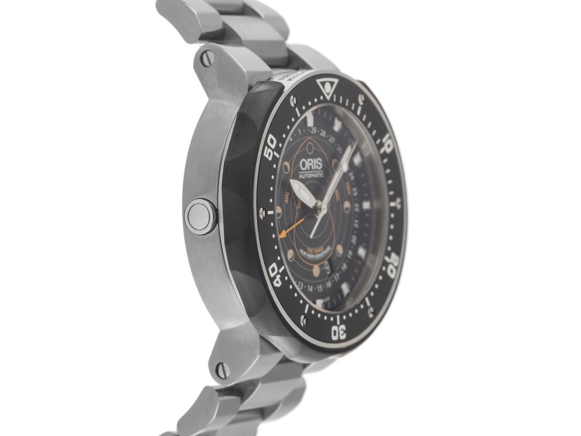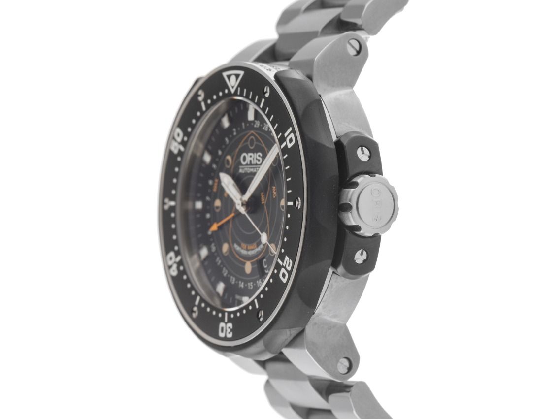 Gehäuse Titan poliert und satiniert, Gehäusedurchmesser ohne Krone 49mm, Gehäusehöhe 16,1mm. Lünette Titan mit schwarzem Inlay, 60-Minuten Skala und Leuchtpunkt, einseitig drehbar und Drehsicherheitssystem. Armband Titan poliert und satiniert, Sicherheitsfaltschließe mit Hersteller-Logo. Zifferblatt schwarz mit aufgesetzten Edelstahl Indexen und Edelstahl Zeigern. Uhrwerk Automatik, Kaliber Oris 761 mit 26 Edelsteinen. Anzeige von Stunde, Minute und Sekunde über Zeiger aus der Mitte mit Sekundenstopp zur sekundengenauen Einstellung der Uhrzeit, Datumsanzeige mit Schnellverstellung zwischen 4 und 5 Uhr, Mondphasenanzeige / Datumsanzeige über Zeiger aus der Mitte. Saphirglas extra stark und kratzfest. Krone verschraubbar mit Flankenschutz und Hersteller-Logo. Boden Titan verschraubt und graviert. Gewicht der Uhr inklusive Armband 173g, Länge des Armbandes inklusive Gehäuse 195mm. Referenznummer: 01 761 7682 7154-Set, Gehäusenummer: 3252XXX, ID: P234812000126H-3250, Artikelnummer: 10000084392. Mit Gangkontrolle und kompletter äußerlicher Aufarbeitung von Januar 2026. Original Oris Box mit Umkarton und Garantie Papiere von April 2014 sowie Beschreibung, zusätzliches Kautschuk Band schwarz und Bandwechsel Werkzeug, Erstkaufrechnung von April 2014 sowie Watchregister Auszug von Januar 2026, The Watch Register Zertifikat / ohne Eintrag (Internationale Datenbank für verlorene oder gestohlene Uhren), Full Set. Superschnäppchen, sehr seltenes Sammlerstück, fast nicht getragen. Wie Neu. Lieferzeit sofort.