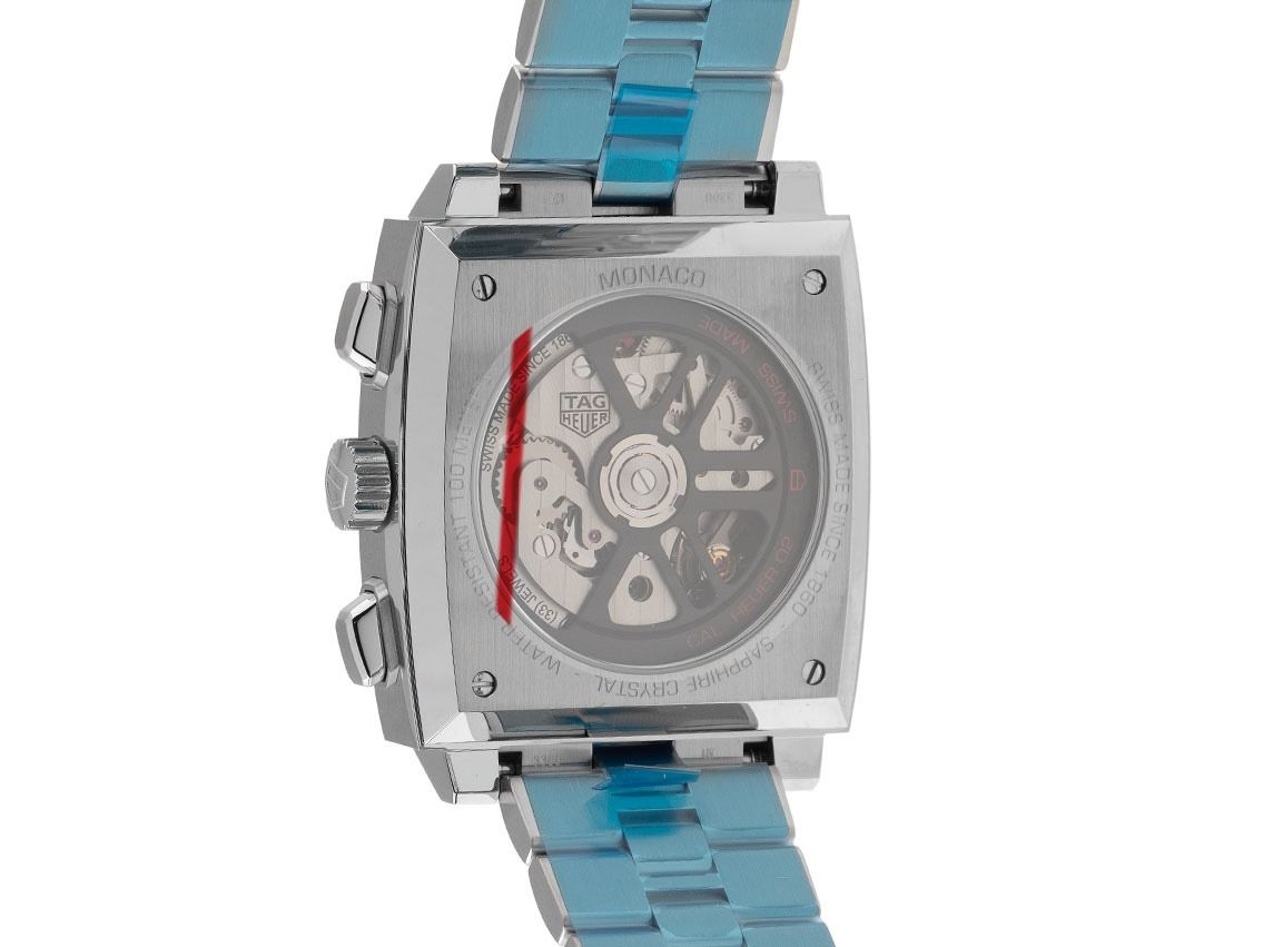 Tag Heuer Monaco Stahl Automatik Chronograph Armband StahlGehäuse Edelstahl poliert und satiniert, rechteckig, Gehäusedurchmesser ohne Krone (L x B x H) 39 x 39 x 15,2mm. Armband Edelstahl poliert und satiniert, verdeckte Doppelsicherheitsfaltschließe Edelstahl mit Hersteller-Logo. Zifferblatt blau mit Sonnenschliff, weißen Hilfszifferblättern, aufgesetzten Edelstahl Indexen und Leuchtpunkten sowie Edelstahl Leuchtzeigern. Uhrwerk Automatik, Chronograph, Tag Heuer Manufakturkaliber TH20-00 mit 33 Edelsteinen, Gangreserve ca. 80 Stunden. Anzeige von Stunde und Minute über Zeiger aus der Mitte, kleine Sekunde mit Sekundenstopp zur sekundengenauen Einstellung der Uhrzeit bei 6 Uhr, Datumsanzeige mit Schnellverstellung bei 6 Uhr. Saphirglas kratzfest. Krone mit Hersteller-Logo. Boden Edelstahl 4-fach verschraubt und graviert mit Saphirglas Sichtfenster. Gewicht der Uhr inklusive Armband 192g, Länge des Armbandes inklusive Gehäuse 200mm. Wasserdicht bis 10 ATM. Referenznummer: CBL2111.BA0644, ID: ST1160105300126H-8450, Artikelnummer: 10000084492. Original Tag Heuer Box mit Umkarton und Garantie Papiere von 2026, Full Set. Ungetragen. Lieferzeit sofort.