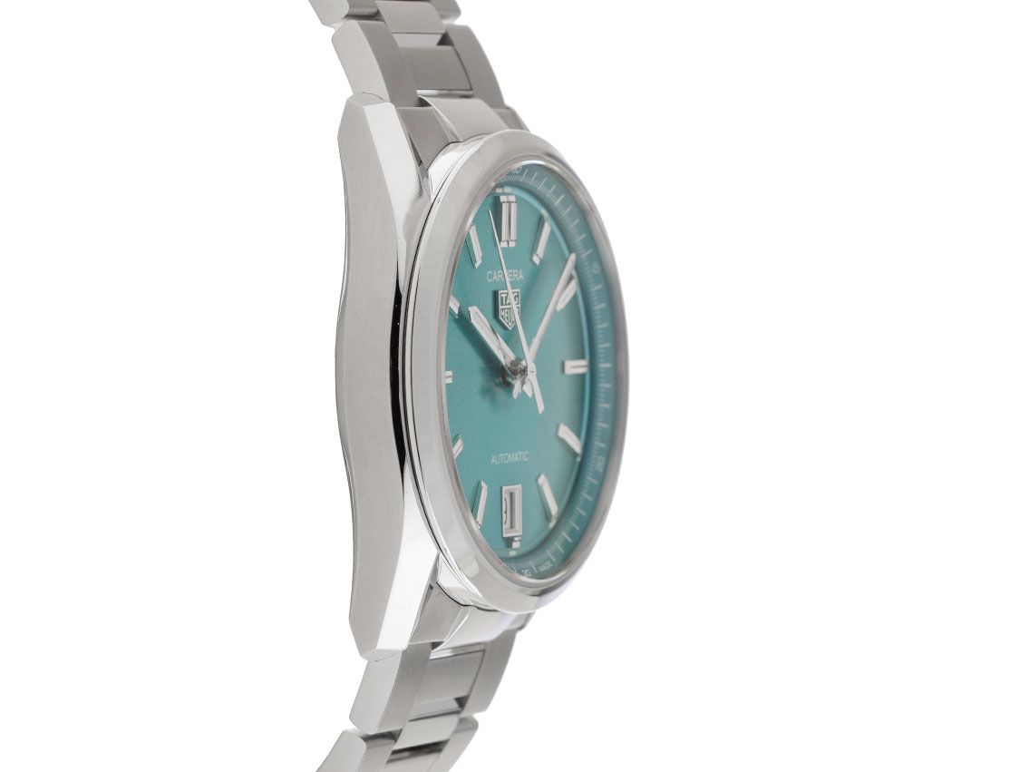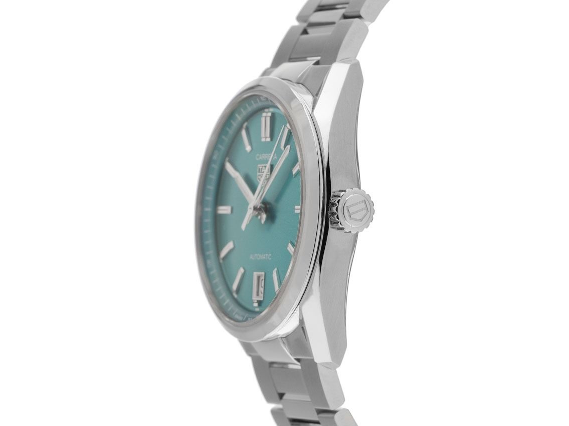 Tag Heuer Carrera Date Stahl Automatik Armband StahlGehäuse Edelstahl poliert, Gehäusedurchmesser ohne Krone 36mm, Gehäusehöhe 10,1mm. Lünette Edelstahl glatt und poliert. Armband Edelstahl poliert und satiniert, Sicherheitsfaltschließe Edelstahl mit Hersteller-Logo. Zifferblatt türkis mit aufgesetzten Indexen und Edelstahl Leuchtzeigern. Uhrwerk Automatik, Kaliber Tag Heuer Calibre 7 mit 25 Edelsteinen, Gangreserve ca. 50 Stunden. Anzeige von Stunde, Minute und Sekunde über Zeiger aus der Mitte mit Sekundenstopp zur sekundengenauen Einstellung der Uhrzeit, Datumsanzeige mit Schnellverstellung bei 6 Uhr. Saphirglas kratzfest und gewölbt. Krone mit Hersteller-Logo. Boden Edelstahl verschraubt und graviert mit Saphirglas Sichtfenster. Gewicht der Uhr inklusive Armband 112g, Länge des Armbandes inklusive Gehäuse 195mm. Wasserdicht bis 5 ATM. Referenznummer: WBN2316.BA0001, ID: ST116045400126H-3700, Artikelnummer: 10000084495. Original Tag Heuer Box mit Umkarton und Garantie Papiere von 2026 sowie Beschreibung, Full Set. Ungetragen. Lieferzeit sofort.