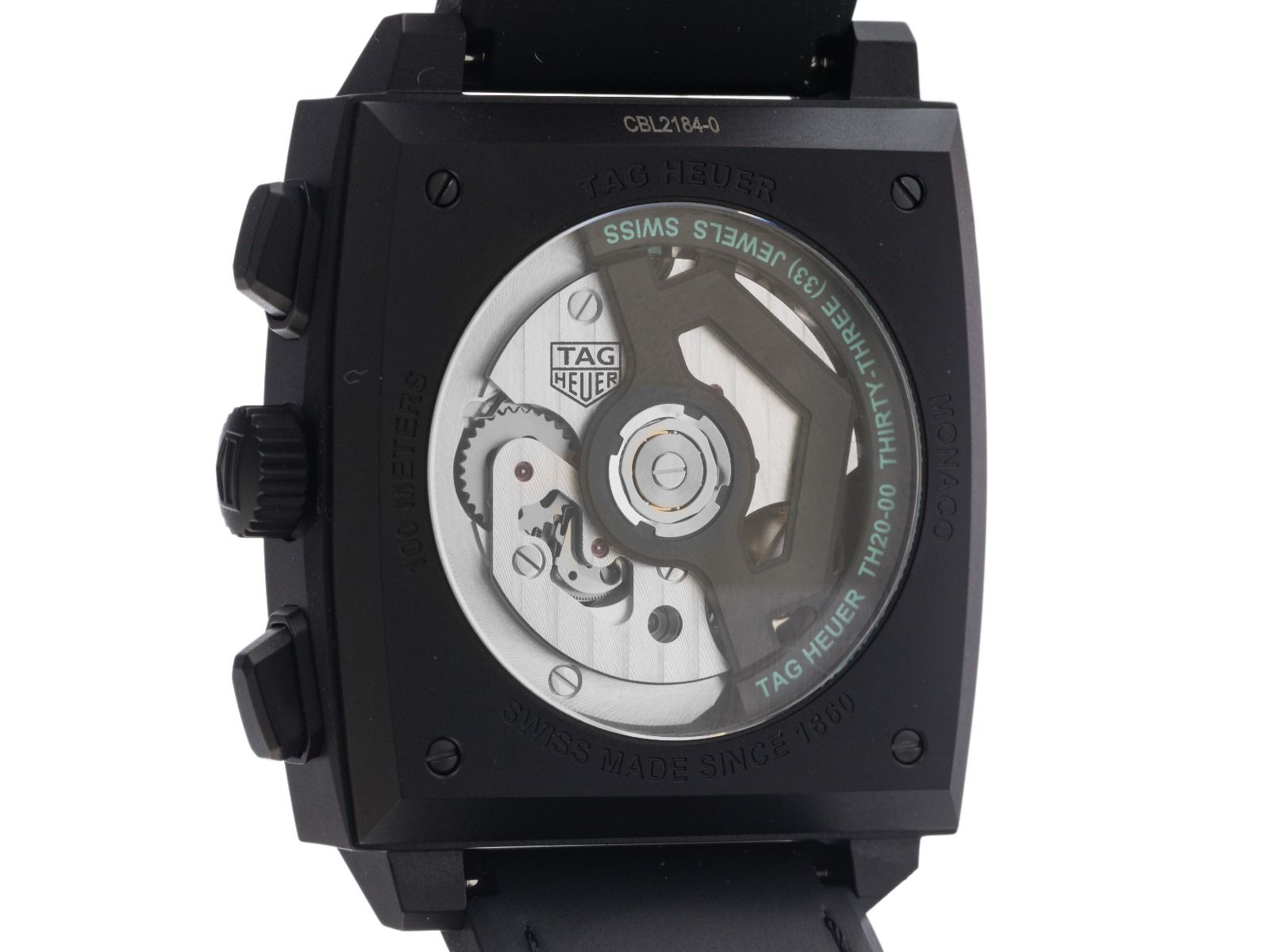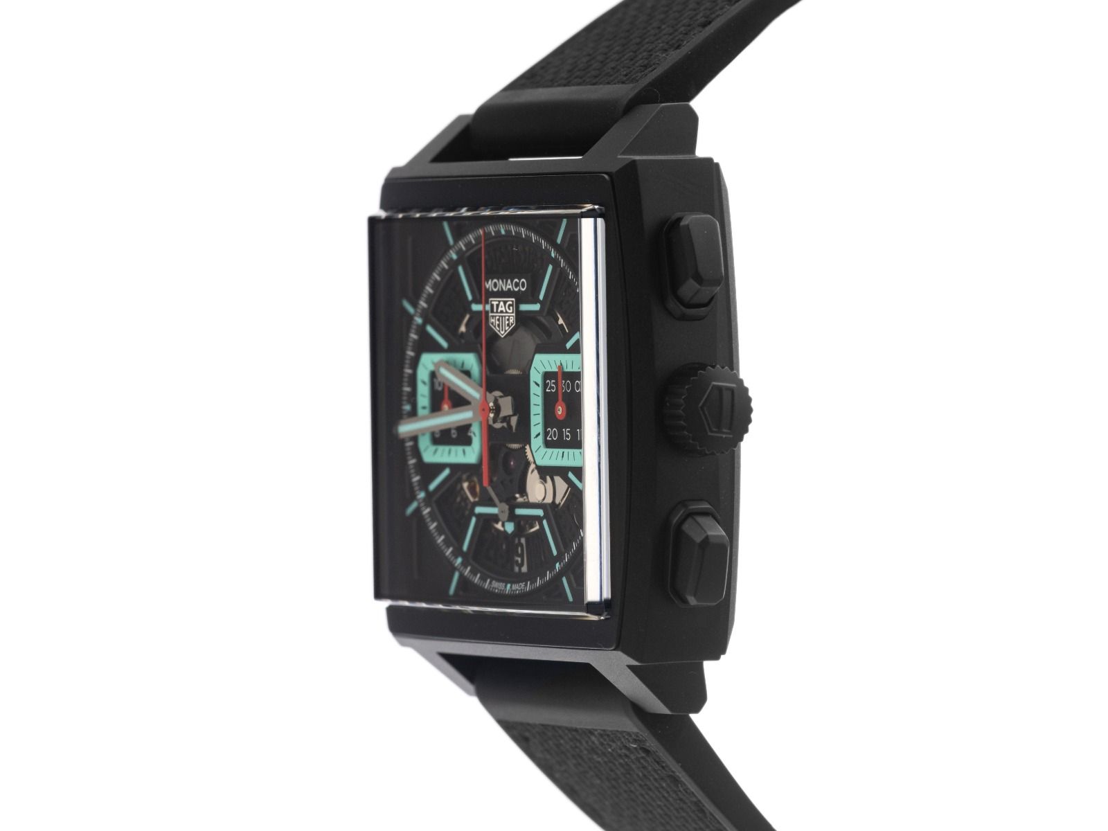 Tag Heuer Monaco Titan DLC Automatik Chronograph Armband Kautschuk FaltschließeGehäuse Titan schwarz DLC beschichtet und satiniert, rechteckig, Gehäusemaße ohne Krone (L x B x H) 39 x 39 x 13,8mm. Armband Kautschuk schwarz mit Ziernaht, Anstoßbreite 22mm, Sicherheitsfaltschließe Titan schwarz DLC beschichtet mit Hersteller-Logo. Zifferblatt skelettiert, schwarz / türkis mit Leuchtindexen und polierten Leuchtzeigern. Uhrwerk Automatik, Chronograph, Tag Heuer Manufakturkaliber Calibre TH20-00 mit 33 Edelsteinen, Gangreserve ca. 80 Stunden. Anzeige von Stunde und Minute über Zeiger aus der Mitte, kleine Sekunde mit Sekundenstopp zur sekundengenauen Einstellung der Uhrzeit bei 6 Uhr, Datumsanzeige mit Schnellverstellung bei 6 Uhr. Saphirglas kratzfest. Krone mit Hersteller-Logo. Boden Titan schwarz DLC beschichtet 4-fach verschraubt und graviert mit Saphirglas Sichtfenster. Gewicht der Uhr inklusive Armband 98g. Wasserdicht bis 10 ATM. Referenznummer: CBL2184.FT62361, ID: ST1160150040126H-11650, Artikelnummer: 10000084503. Original Tag Heuer Box mit Umkarton und Garantie Papiere von 2026 sowie Beschreibung, Full Set. Ungetragen. Lieferzeit sofort.