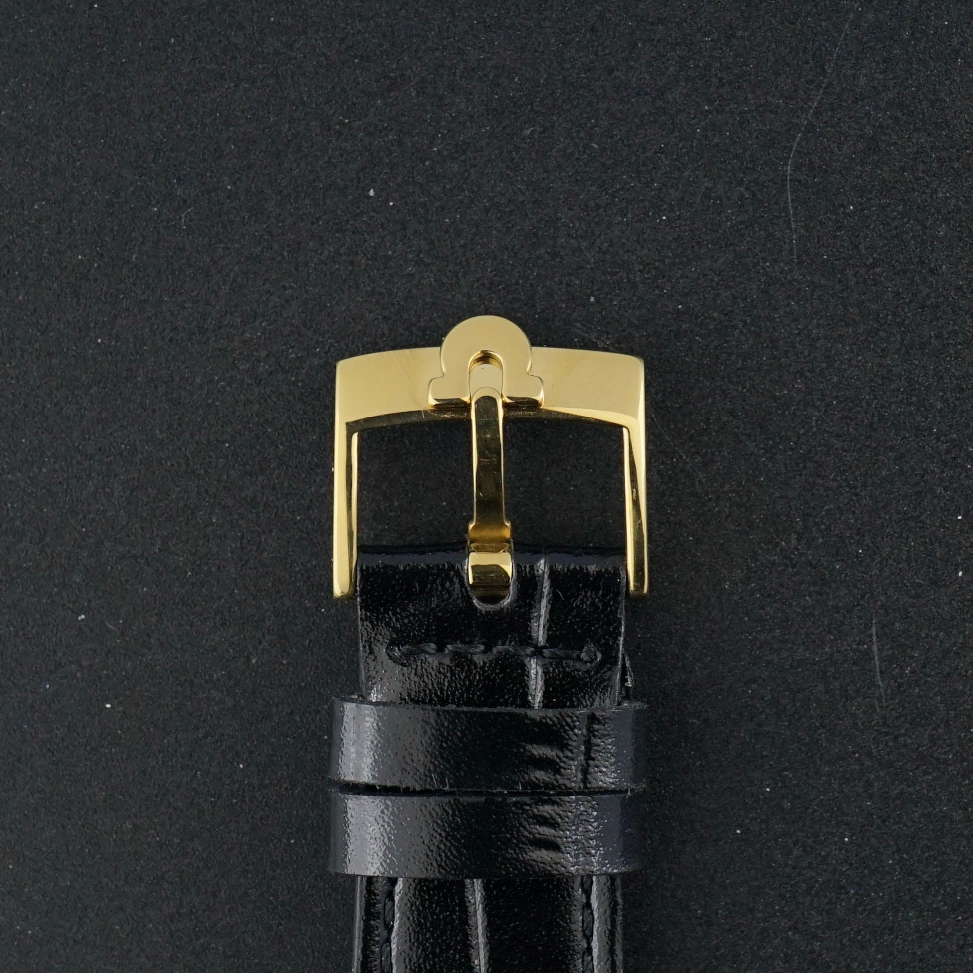 Diese Vintage Omega De Ville, produziert im Jahr 1982, verfügt über eine auffällige schwarze Zifferblatt, die der Uhr ein luxuriöses und gleichzeitig elegantes Aussehen verleiht. Kombiniert mit dem vergoldeten Gehäuse, goldenen Zeigern und dem goldenen Omega-Logo ist das Design perfekt ausgewogen. Wir haben die Uhr mit einem schwarzen Lederarmband mit Krokodilmotiv kombiniert, um das Dress-Watch-Ästhetik vollständig abzurunden.