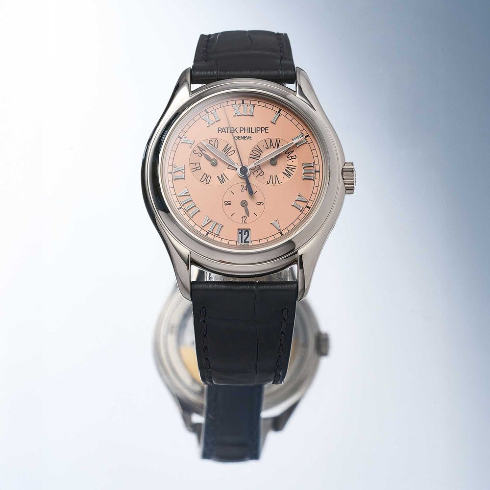 Patek Philippe Jahreskalender Ref. 5035G - "Sehr gut" Zustand - Lachsfarbene Zifferblatt in einem sehr guten Zustand. Wunderschönes pinkes Zifferblatt in einem Gehäuse aus Weißgold mit einer Lünette aus Weißgold.