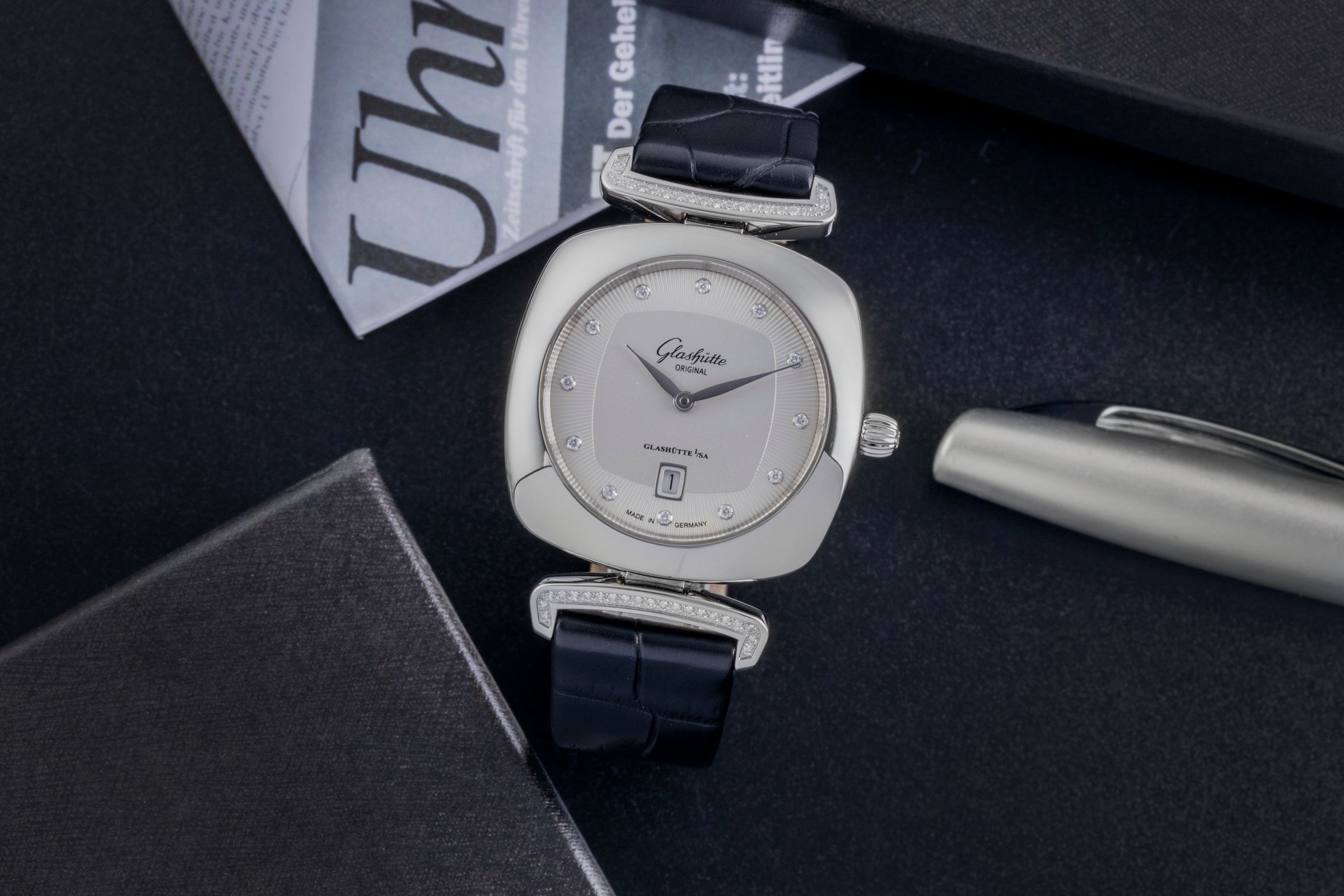 Alternative title: Glashütte Original 1-03-01-10-12-02 - Pavonina Date Stainless Steel / Diamond / Silver / Calf; Glashütte Pavonina Stahl Quarz Damen Diamonds Ref. 03-01-10-12-02 Papiere 2013 [2600066]
