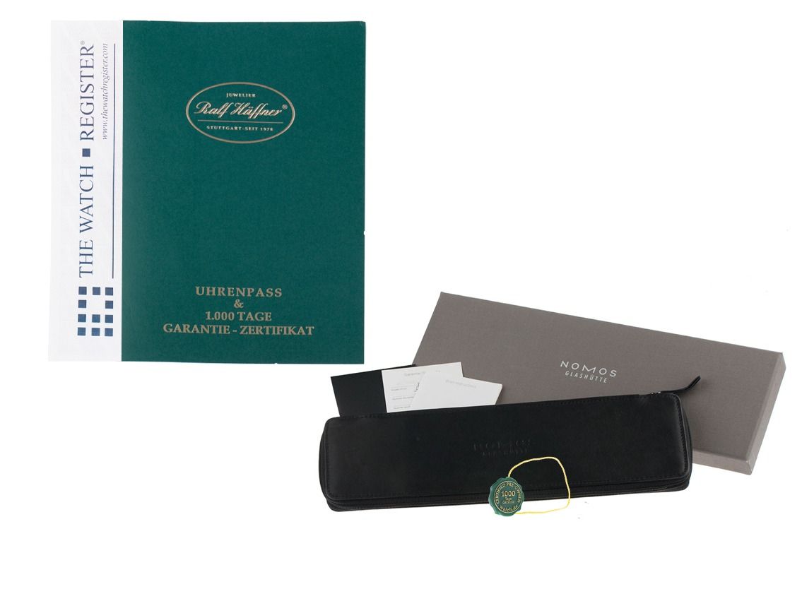 Gehäuse Edelstahl dreiteilig, poliert, Gehäusedurchmesser ohne Krone 38,5mm, Gehäusehöhe 7,8mm. Armband aus schwarzem Shell Cordovan Leder mit Ziernaht, Anstoßbreite 19mm, Stiftschließe aus Edelstahl mit Hersteller-Logo. Zifferblatt weiß versilbert, galvanisiert mit Punktindizes sowie schwarz oxidierten Edelstahlzeigern. Uhrwerk Handaufzug, Nomos Manufakturkaliber DUW4601 mit 23 Edelsteinen, Gangreserve ca. 52 Stunden. Anzeige von Stunde und Minute über Zeiger aus der Mitte, kleine Sekunde mit Sekundenstopp zur sekundengenauen Einstellung der Uhrzeit bei 6 Uhr, Datumsanzeige mit Schnellverstellung bei 6 Uhr. Saphirglas kratzfest, gewölbt. Krone mit Hersteller-Logo. Boden aus Edelstahl graviert mit Saphirglas-Sichtfenster. Gewicht der Uhr inklusive Armband 47g. Wasserdicht bis 3 ATM. Referenznummer: 1102, Gehäusenummer: 1XXX, ID: P236620000126H-2780, Artikelnummer: 10000084453. Mit Gangkontrolle und kompletter äußerlicher Aufarbeitung von Januar 2026. Original Nomos Box mit Umkarton und Garantie-Papieren von Februar 2019 sowie Beschreibung und Watchregister-Auszug von Januar 2026, The Watch Register Zertifikat / ohne Eintrag (Internationale Datenbank für verlorene oder gestohlene Uhren), Full Set. Wie Neu. Lieferzeit sofort.
