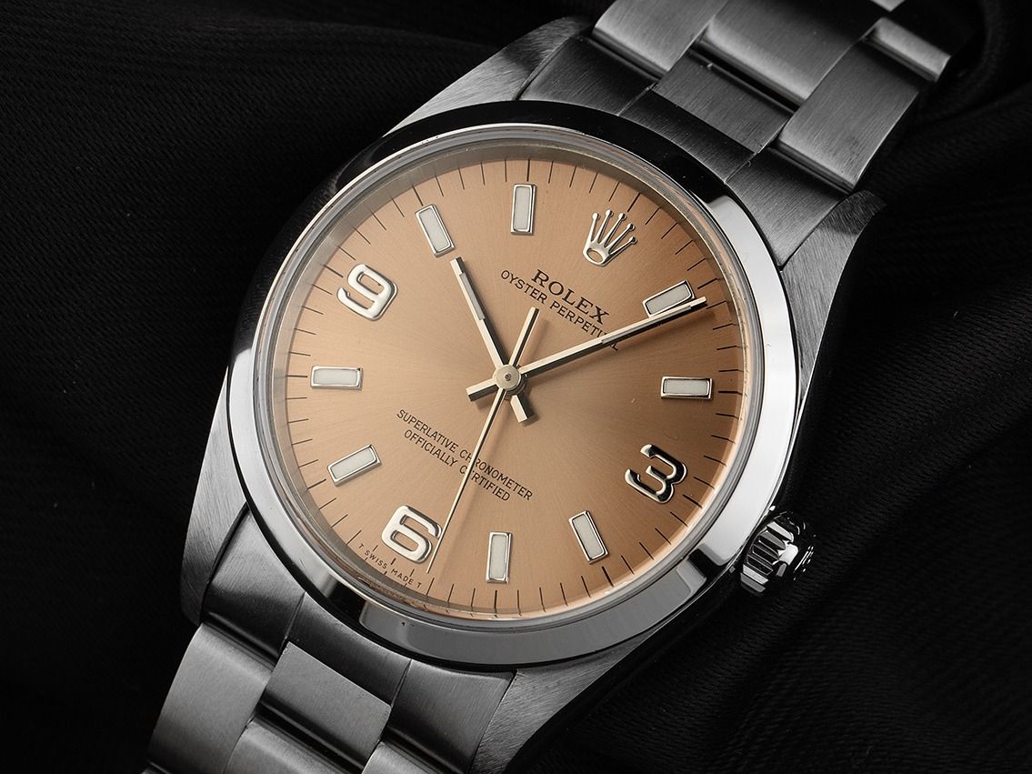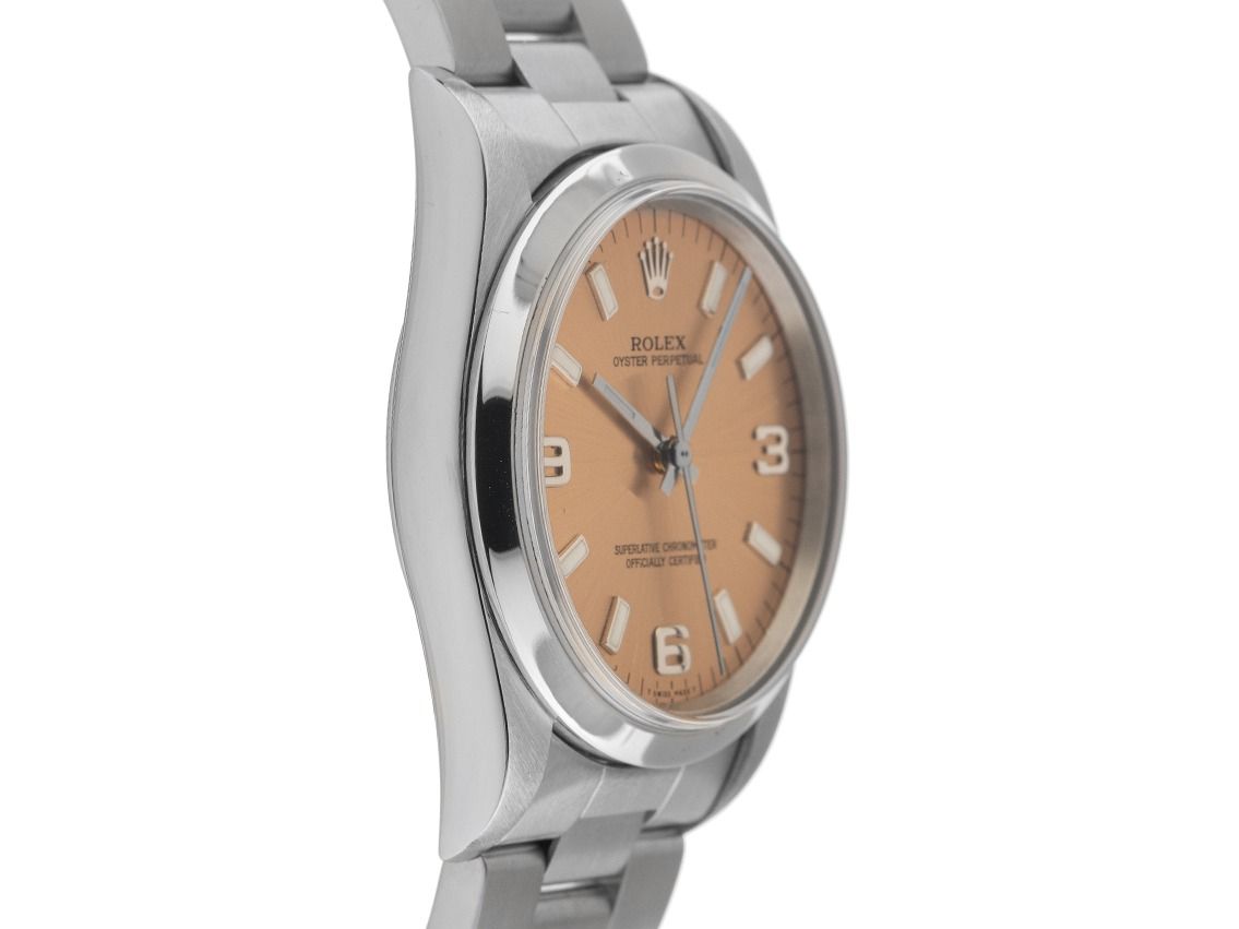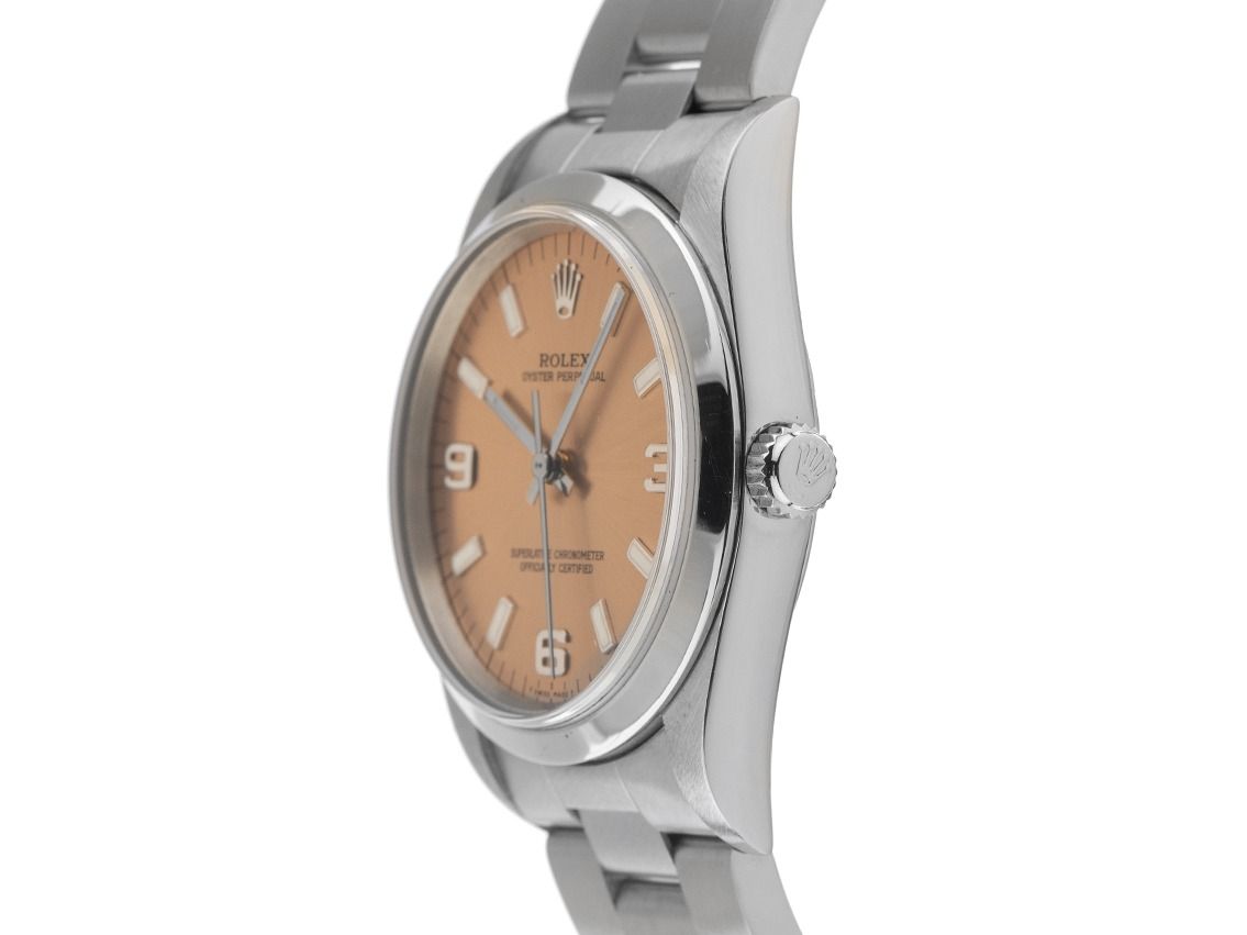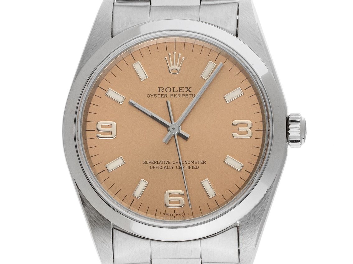 Gehäuse aus Edelstahl, poliert und satiniert, Gehäusedurchmesser ohne Krone 34mm, Gehäusehöhe 11,8mm. Lünette aus Edelstahl, glatt und poliert. Armband Oyster aus Edelstahl, poliert und satiniert, Faltschließe aus Edelstahl mit Hersteller-Logo. Zifferblatt in kupferfarben mit aufgesetzten weißgoldenen Indexen und arabischen Ziffern 3, 6 und 9 sowie weißgoldenen Zeigern. Uhrwerk Automatik, Rolex Manufakturkaliber 3130 mit 31 Edelsteinen. Anzeige von Stunde, Minute und Sekunde über Zeiger aus der Mitte mit Sekundenstopp zur sekundengenauen Einstellung der Uhrzeit. Saphirglas, kratzfest. Krone verschraubbar mit Hersteller-Logo. Boden aus Edelstahl, verschraubt. Gewicht der Uhr inklusive Armband 90g, Länge des Armbandes inklusive Gehäuse 175mm. Referenznummer: 14000M, Gehäusenummer: A127XXX, ID: KA177499000126H-8300, Artikelnummer: 10000084398. Mit Gangkontrolle und kompletter äußerlicher Aufarbeitung von Januar 2026. Original Rolex Box mit Umkarton und Garantie-Papieren von September 1999, LC 430 / Singapur, Beschreibung, Ledermäppchen, Übersetzungsheft, Rolex Chronometer-Siegel und Watchregister-Auszug von Januar 2026, The Watch Register Zertifikat / ohne Eintrag (Internationale Datenbank für verlorene oder gestohlene Uhren), Full Set. Superschnäppchen, Kapitalanlage mit Wertsteigerungspotential, sehr seltenes Sammlerstück. Sehr guter Zustand. Lieferzeit sofort.