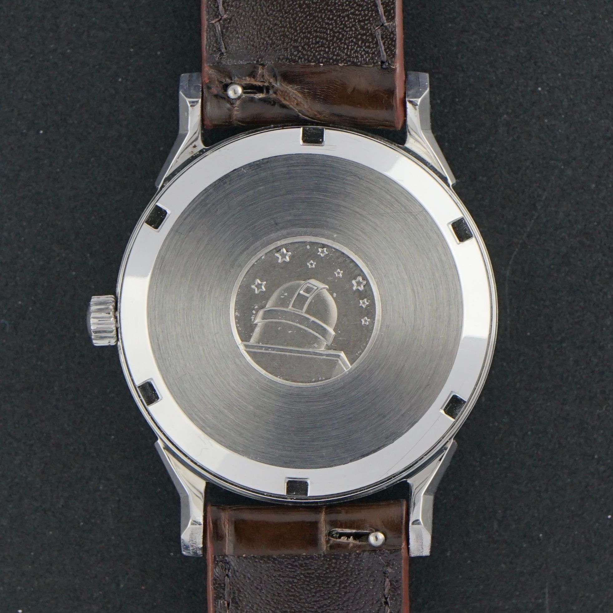 This vintage Omega Constellation, produced in 1973, is known as the “Dog Leg” and “Pie Pan” nicknames referencing its lug design and dial layout, respectively. It’s a Japanese market edition featuring a beautiful dial and a thinner 1000 series movement instead of the predecessor 500 series. The movement was serviced in January 2026 and is running flawlessly. The case measures 34mm wide (excluding crown) and 43mm lug-to-lug. It remains 100% original and in exceptional condition, paired with a non-original top-grain leather strap featuring a crocodile grain and light gloss finish.Year of production: 1973