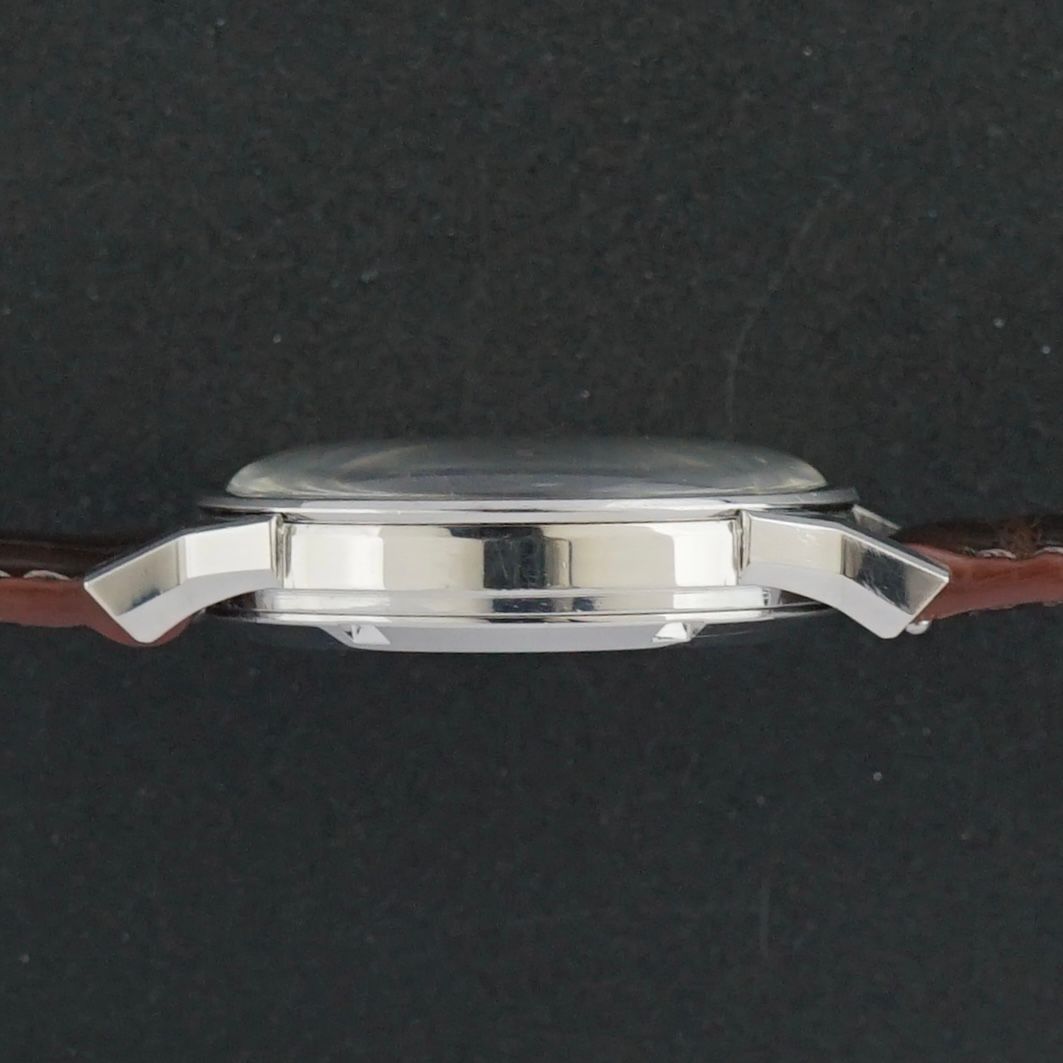 Diese Vintage Omega Constellation, produziert im Jahr 1973, ist bekannt unter den Spitznamen „Dog Leg“ und „Pie Pan“, die sich auf das Design der Hörner und das Layout der Zifferblatt beziehen. Es handelt sich um eine Edition für den japanischen Markt mit einem wunderschönen Zifferblatt und einem dünneren 1000er Serienwerk anstelle des Vorgängers, dem 500er Serienwerk. Das Werk wurde im Januar 2026 gewartet und läuft einwandfrei. Das Gehäuse hat eine Breite von 34mm (ohne Krone) und eine Hörnerbreite von 43mm. Es ist 100% original und in außergewöhnlichem Zustand, kombiniert mit einem nicht-originalen Oberlederarmband mit Krokodilprägung und leicht glänzender Oberfläche.