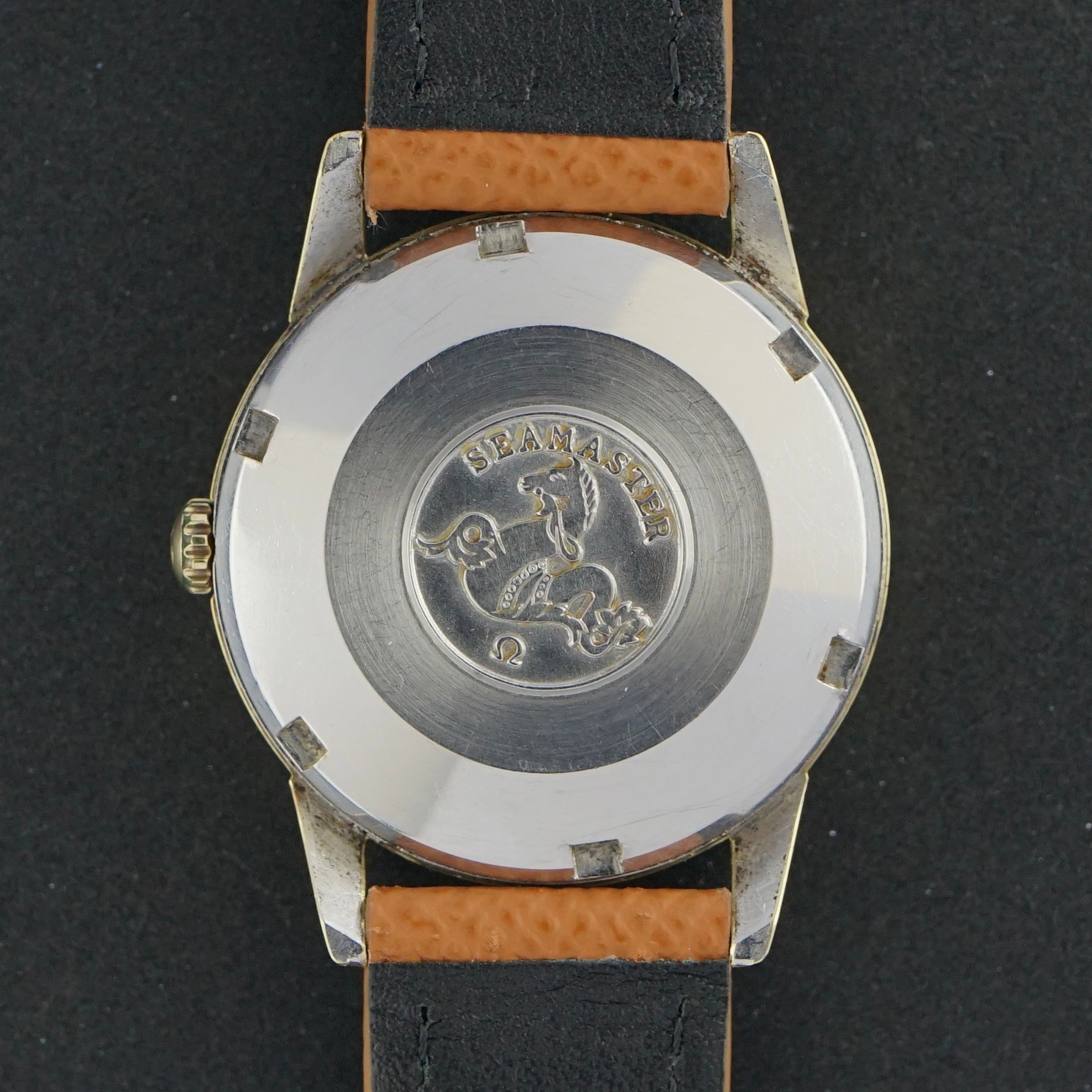 This beautiful vintage Omega Seamaster was produced in 1961. It features a white dial with a very fine patina, giving it an off white tone. The case measures 34 millimeters in width and is fully gold plated. Due to the relatively large lugs, the wrist presence is larger than that of a typical 34 millimeter watch. Inside is the Omega caliber 503 automatic movement, which was serviced in January 2026 and currently runs and functions excellently. The watch is paired with a brown calf leather strap and is in great overall condition.Year of production: 1961