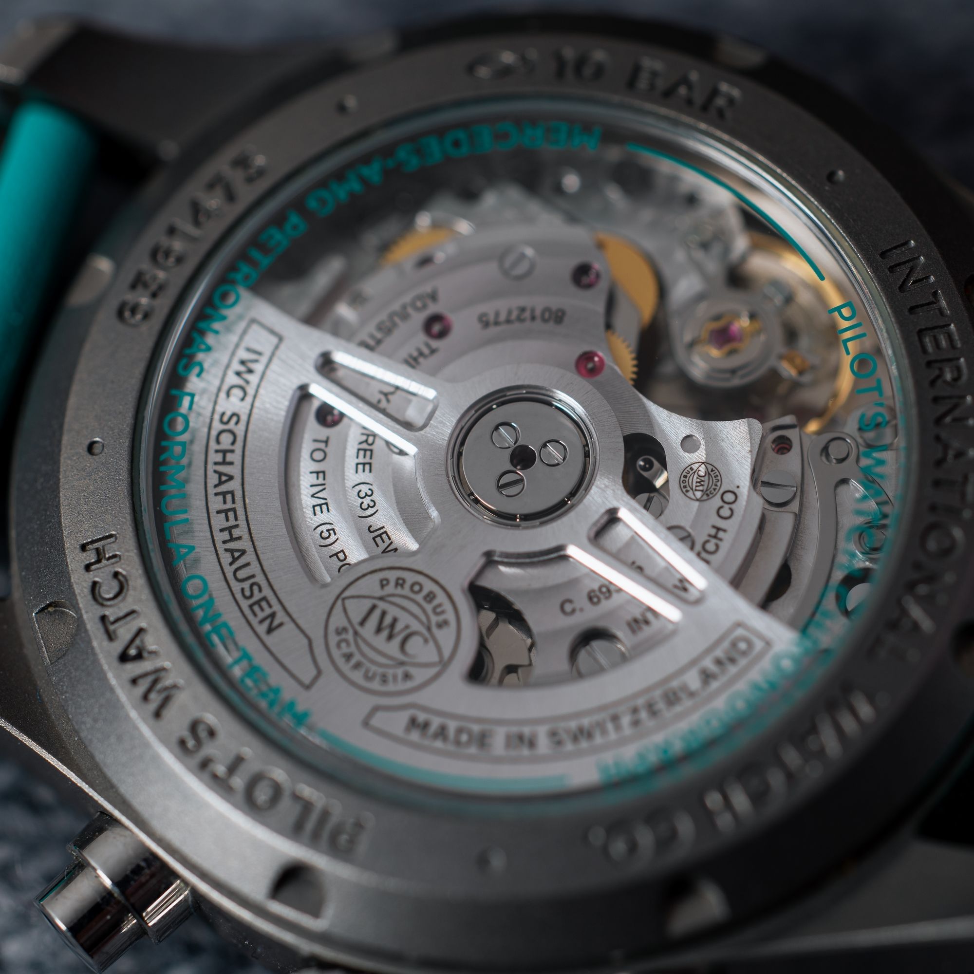 Die Uhr vereint das luftfahrttechnische Erbe der Pilot-Linie mit dem modernen Motorsport-DNA des AMG Petronas Teams. Die kontrastierenden Farbakzente verleihen Charakter und sorgen gleichzeitig für hervorragende Lesbarkeit und ein ausgewogenes Gesamtdesign.
