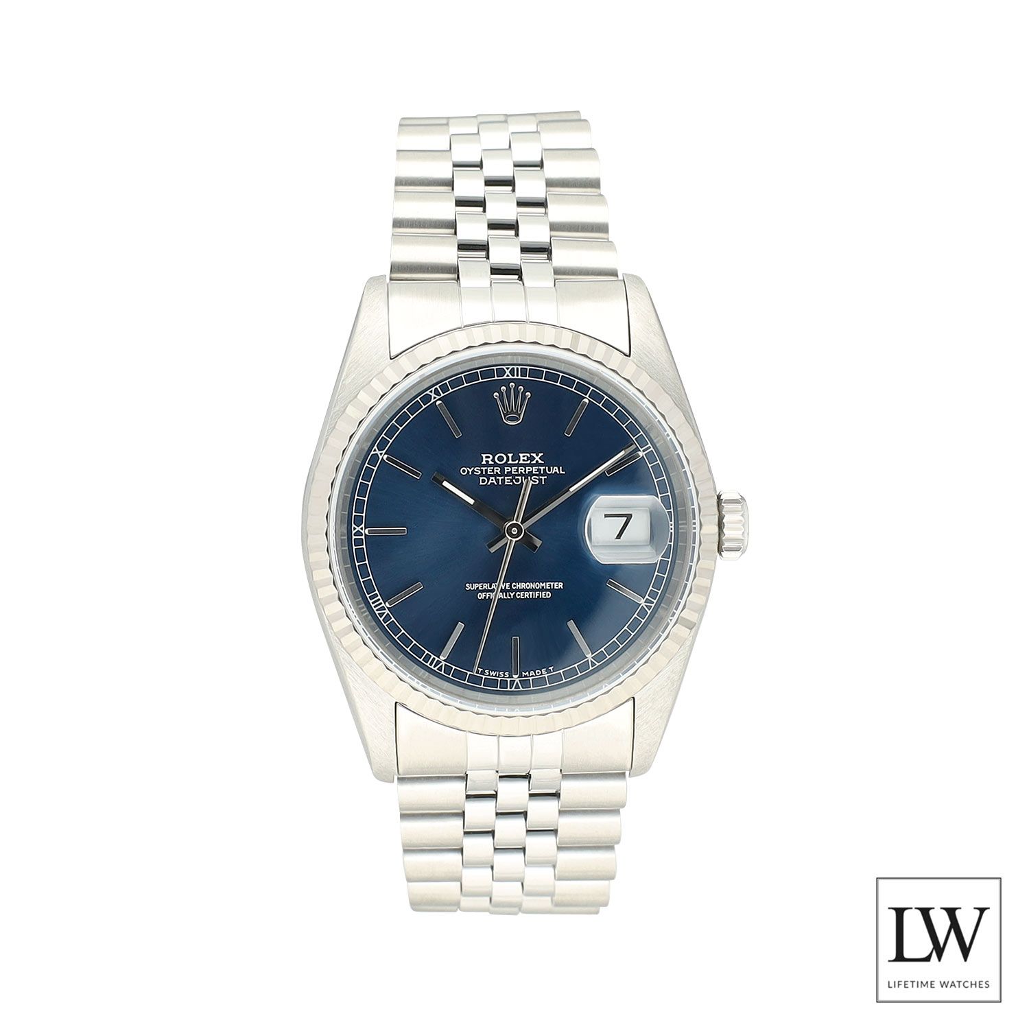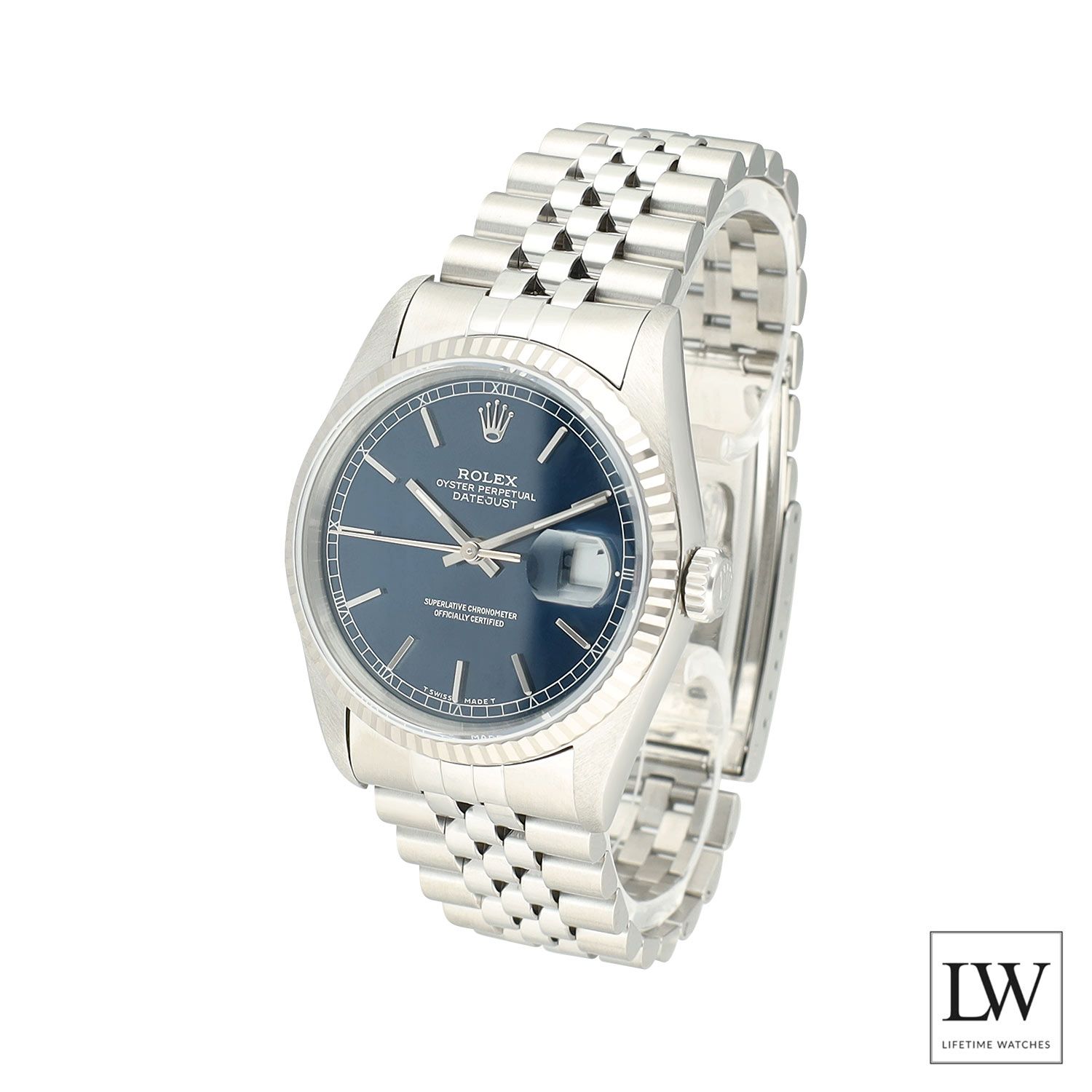 The Rolex Datejust ref. 16234 is a refined example of classic Rolex design, appreciated for its timeless proportions and understated elegance. As one of the most enduring models within the Rolex collection, the Datejust continues to appeal to collectors and enthusiasts who value versatility and heritage. This particular configuration features a blue minute track dial, giving the watch a distinctive and elegant appearance with a subtle vintage character.This example dates back to 1996 and is offered in perfect condition. The original box is included, while the papers are not present. A classic Datejust that continues to feel relevant, stylish, and effortlessly wearable. The watch is backed by a 24-month warranty and authenticity papers.