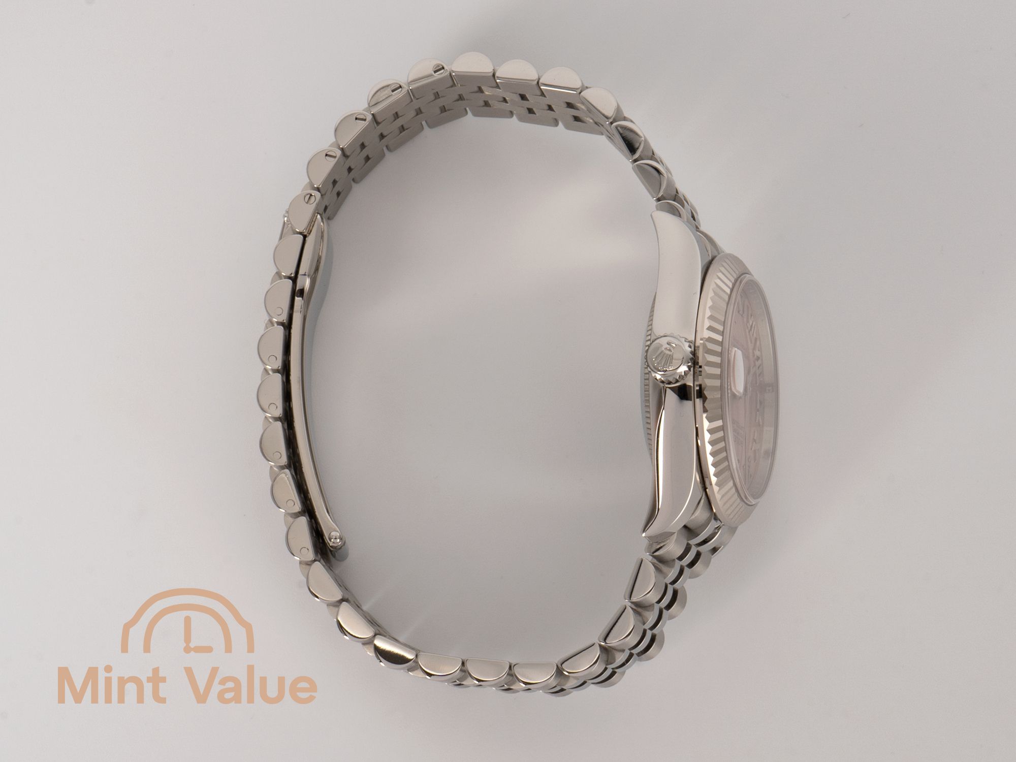 Das 31 mm große Oyster-Gehäuse ist bis 100 m wasserdicht und mit der charakteristischen geriffelten Lünette aus 18-karätigem Weißgold ausgestattet — sowohl ein visuelles Markenzeichen als auch ein funktionales Element. Das Jubilee-Armband mit seinen fünfgliedrigen Gliedern und der verdeckten Crownclasp bietet außergewöhnlichen Komfort und eine raffinierte, schmuckähnliche Präsenz am Handgelenk.