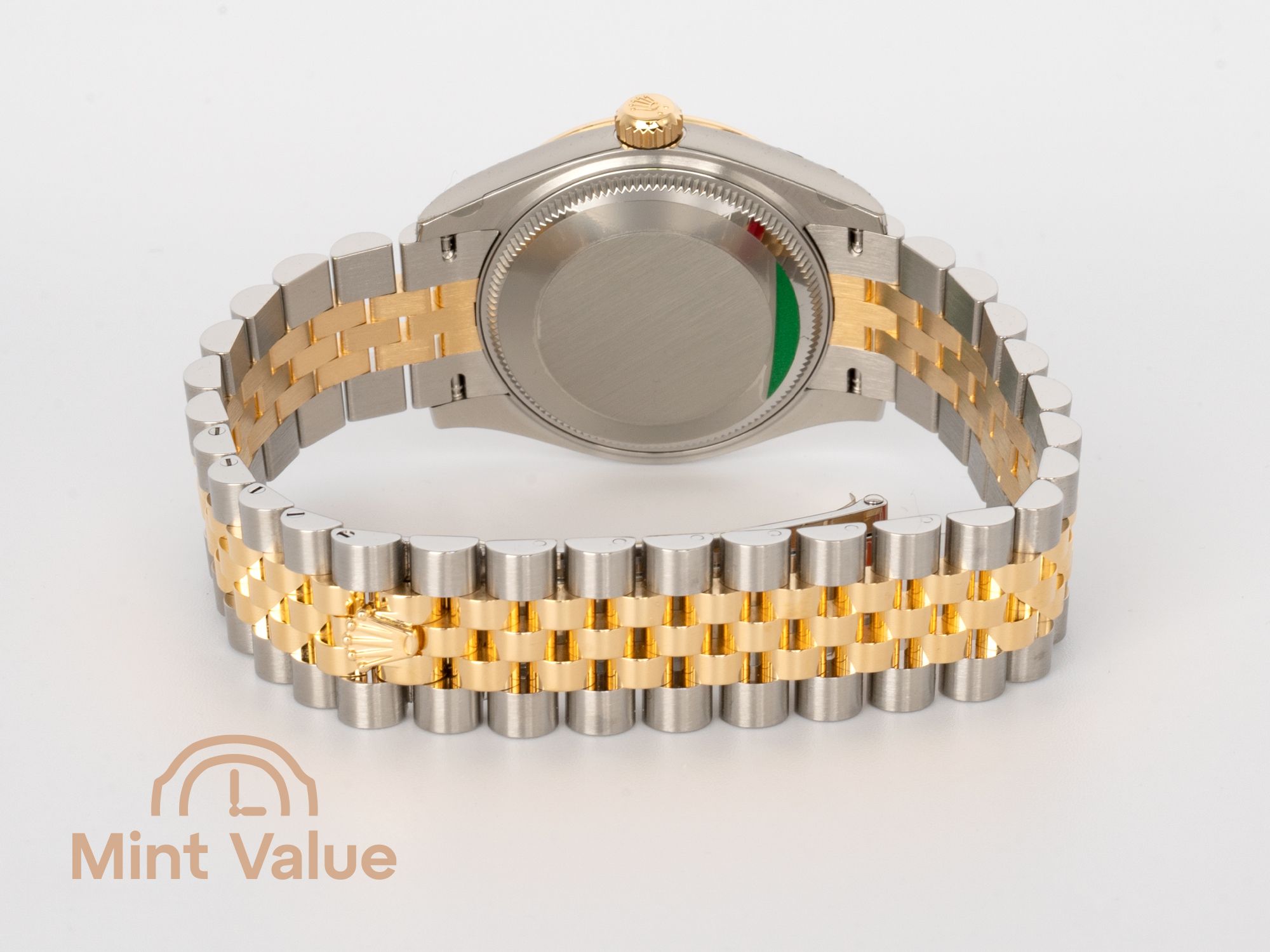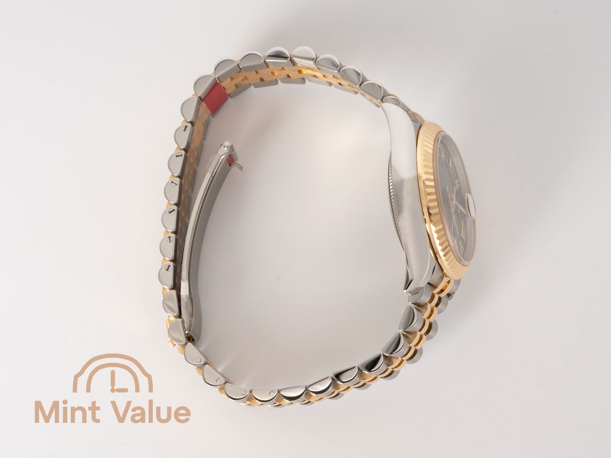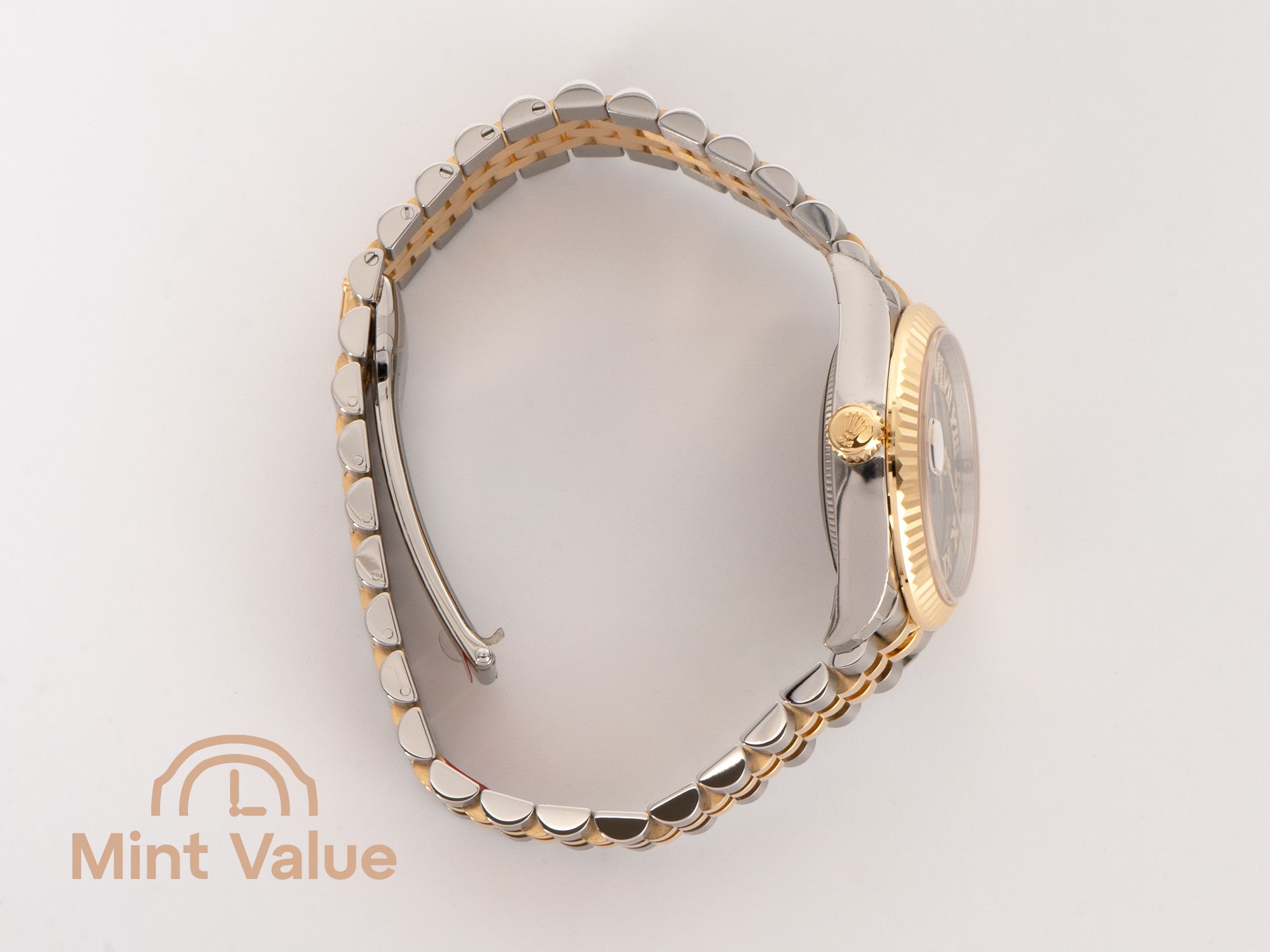 Das 31 mm große Oyster-Gehäuse ist bis 100 Meter wasserdicht und mit der geriffelten Lünette aus 18-karätigem Gelbgold versehen — ein Markenzeichen von Rolex, das ästhetische Raffinesse mit funktionalem Erbe verbindet. Das Jubilee-Armband mit seinen fünf Gliedern und der verdeckten Crownclasp sorgt für außergewöhnlichen Tragekomfort und ein nahtloses, elegantes Profil am Handgelenk.