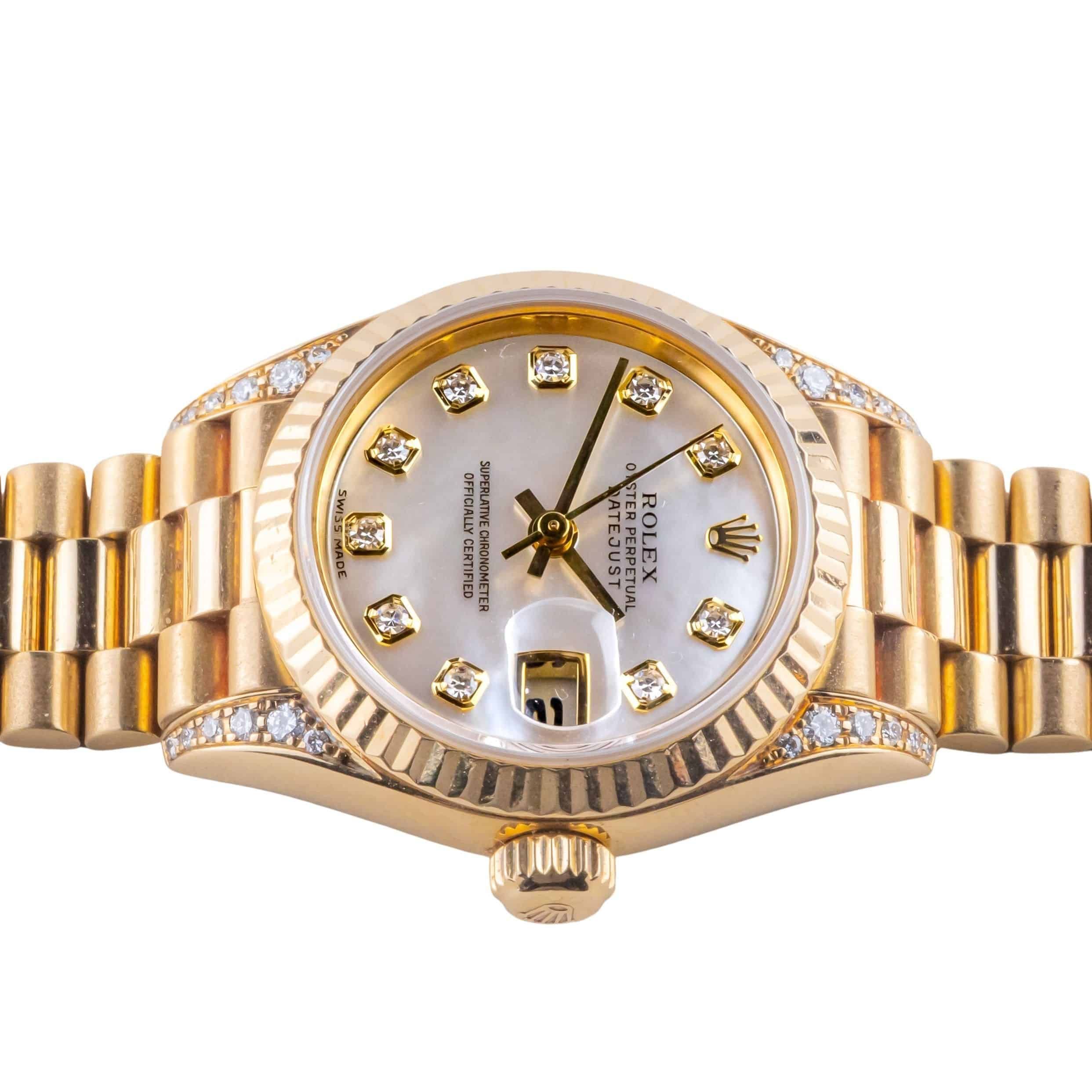 Rolex Oyster Perpetual Lady-Datejust Referenz 79238 aus dem Jahr 1999, inklusive vollständigem Set. Die Lady-Datejust 79238 hat ein 26mm Gehäuse aus 18k Gold mit werkseitig besetzten Diamantanstößen, ein 18k Gold Präsidentenarmband und eine geriffelte Lünette aus 18k Gold. Diese Lady-Datejust 79238 verfügt über ein automatisches Uhrwerk Kaliber 2235 mit Schnellschaltung für das Datum, ein kratzfestes Saphirglas und eine MOP-Zifferblatt mit Diamant-Einlage.