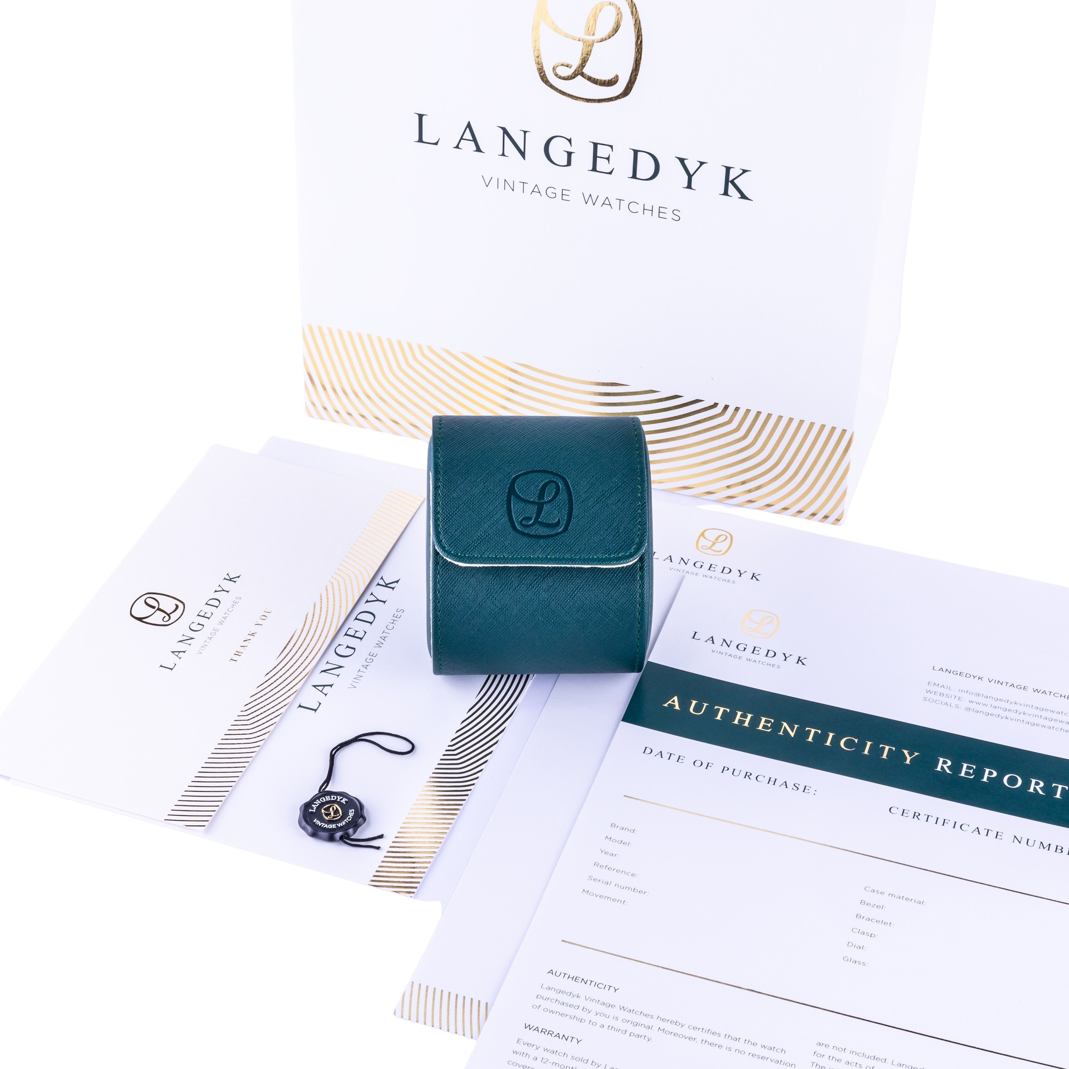 Jede gebrauchte Uhr, die wir verkaufen, kommt mit einer 12-monatigen Garantie ab Kaufdatum. Jede von Langedyk Vintage Watches verkaufte Uhr wird mit einer LVW-Uhrenbox, einem Echtheitsbericht und kostenlosem weltweiten (versichertem) Versand geliefert.