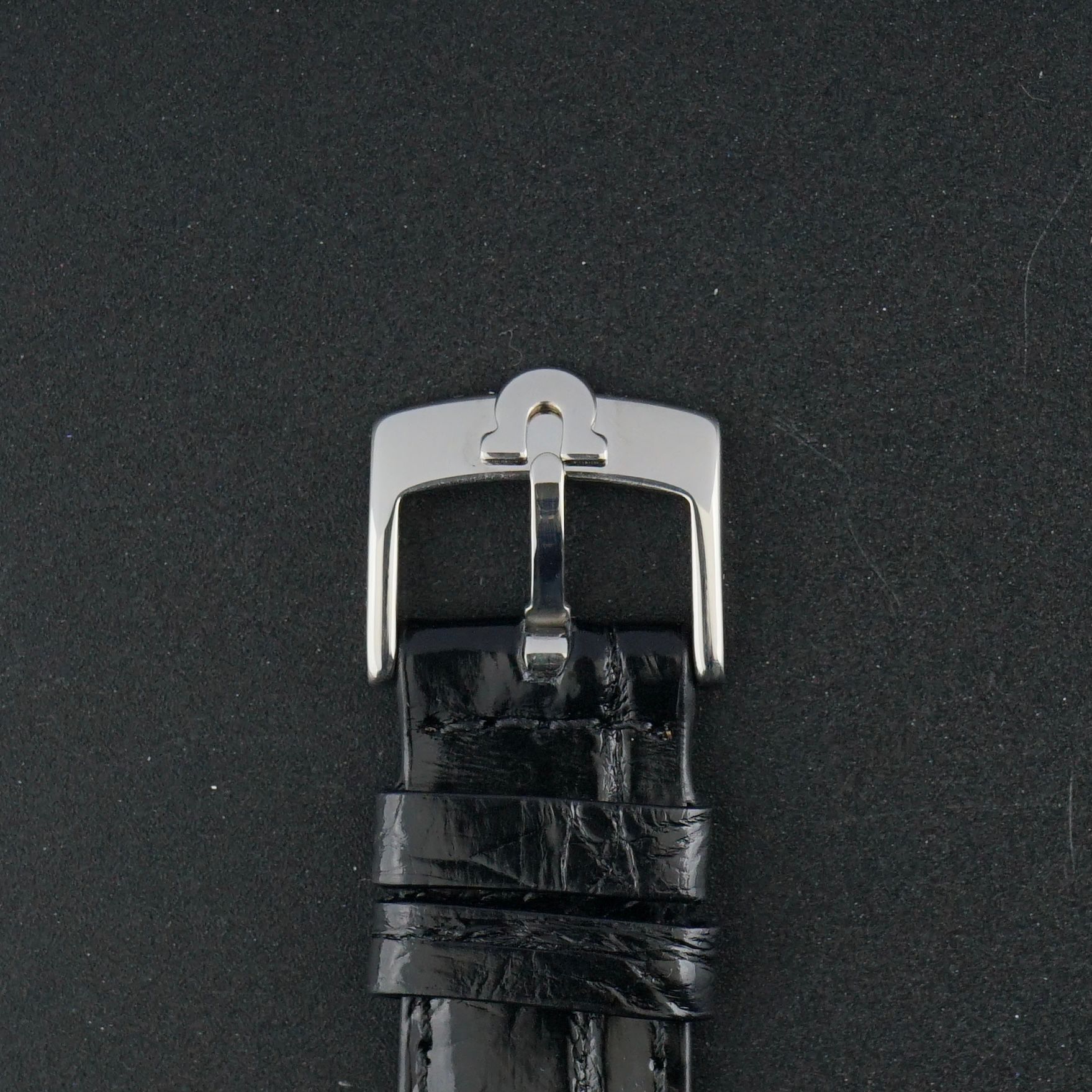 The white sunburst dial remains in beautiful condition and shows a warm and elegant contrast with the rose golden elements. We have chosen to pair this watch with a black top grain leather strap with a crocodile motif and a glossy finish, which complements the watch very well.