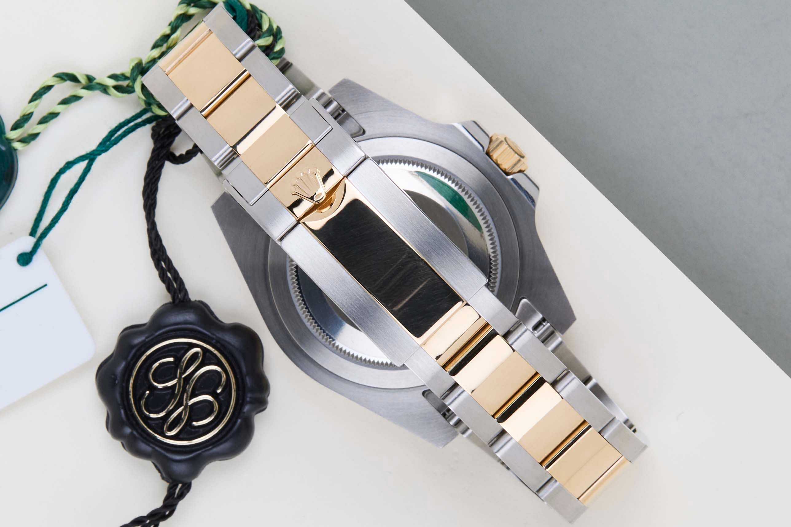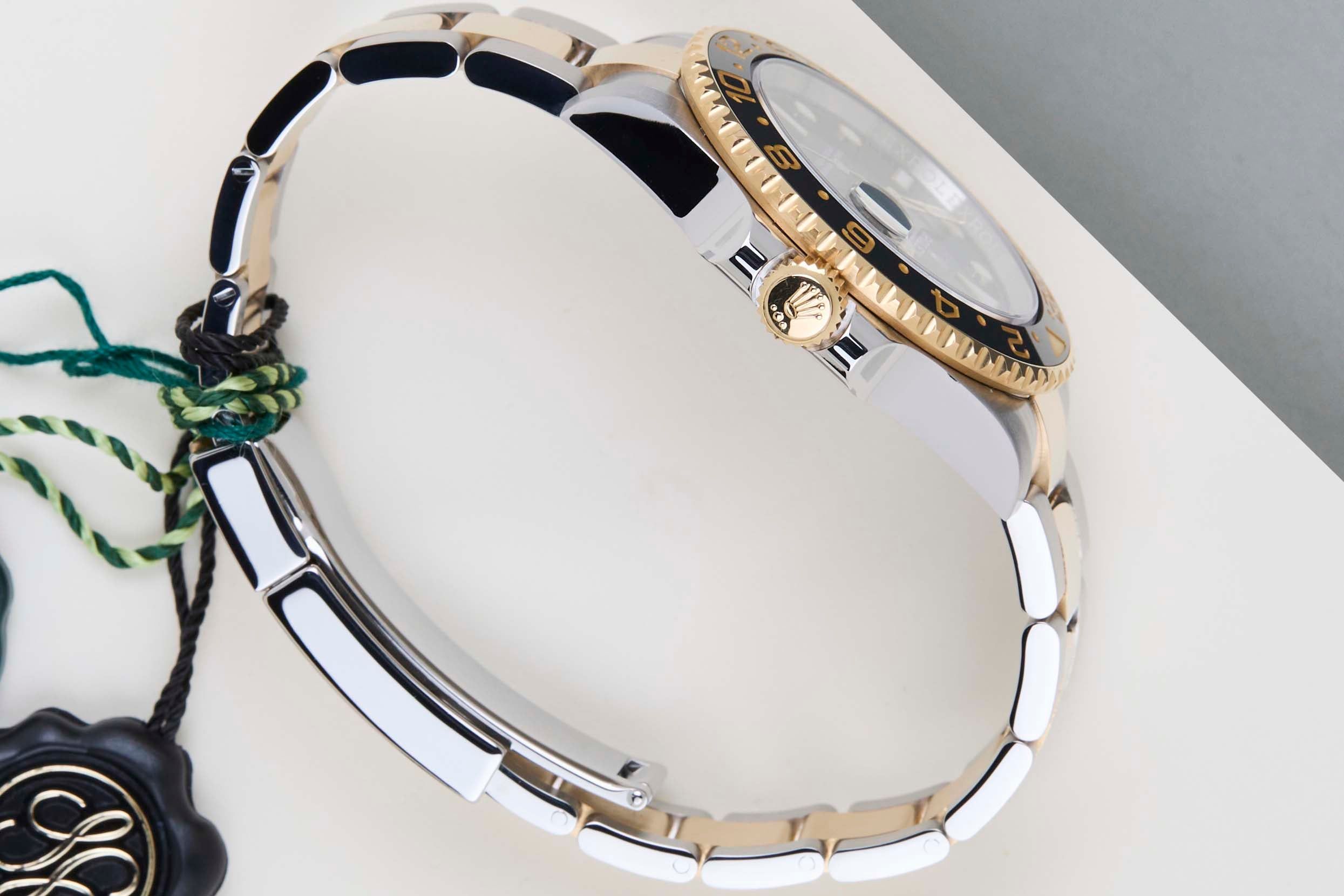 Dieser GMT-Master besteht aus Edelstahl und Gelbgold und ist mit einem Oyster-Armband ausgestattet, das mit dem Easylink-System versehen ist. Diese Erweiterung ermöglicht es dem Träger, das Armband um 5 Millimeter zu verlängern oder zu verkürzen, was den Tragekomfort und die Benutzerfreundlichkeit der Uhr verbessert.