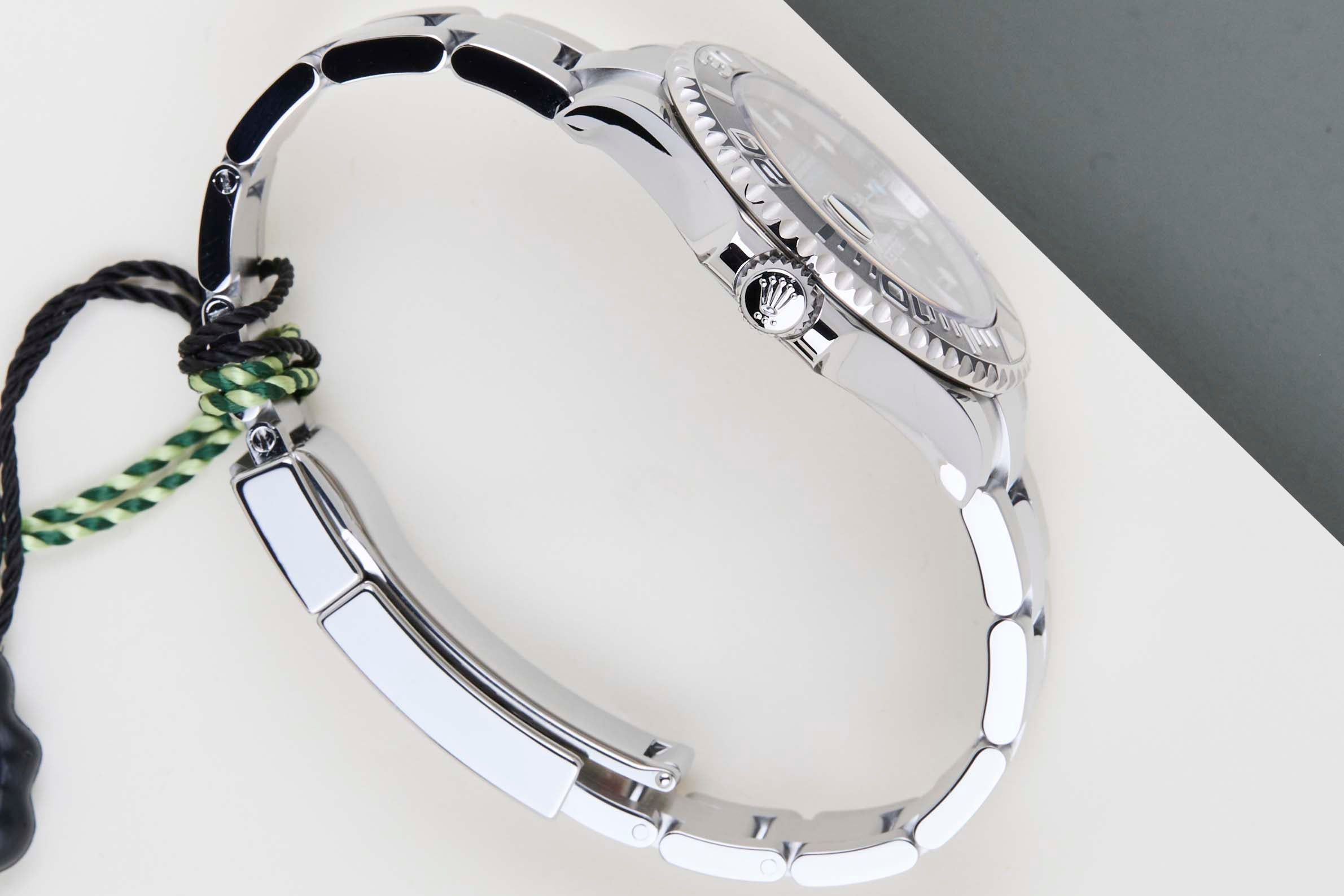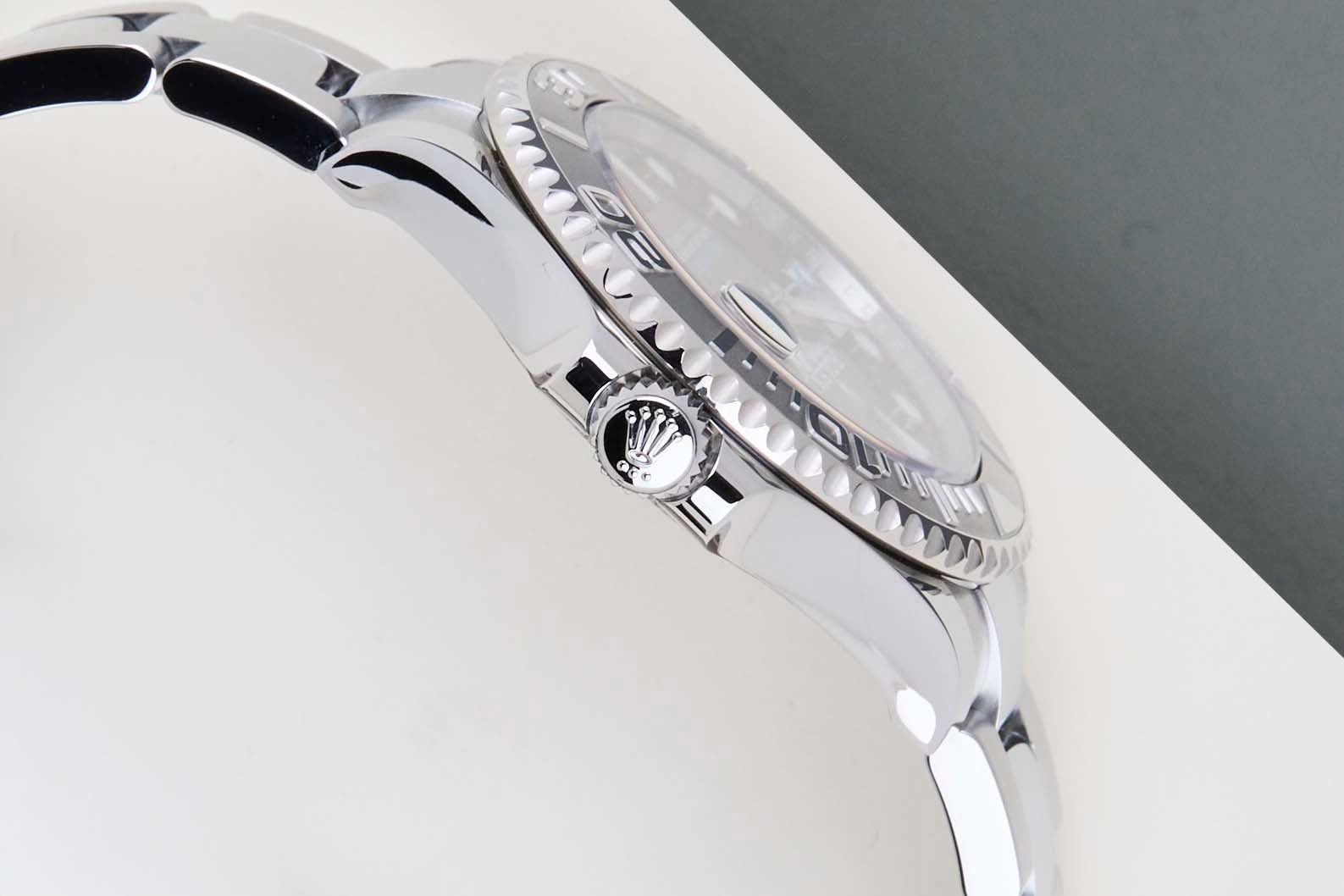 Die Rolex Yacht-Master wurde 1992 als stilvollere und luxuriösere Alternative zur Submariner eingeführt, die mehr auf das Tauchen ausgerichtet ist. Die Yacht-Master wurde für Segler und maritime Enthusiasten entworfen. Diese Rolex Yacht-Master 37 'Slate Dial' wurde erstmals im Juni 2024 verkauft. Diese Rolex Yacht-Master besteht aus Edelstahl und Platin, wobei die Lünette aus 950 Platin gefertigt ist, während das Gehäuse, das Armband und die Krone aus Edelstahl bestehen.