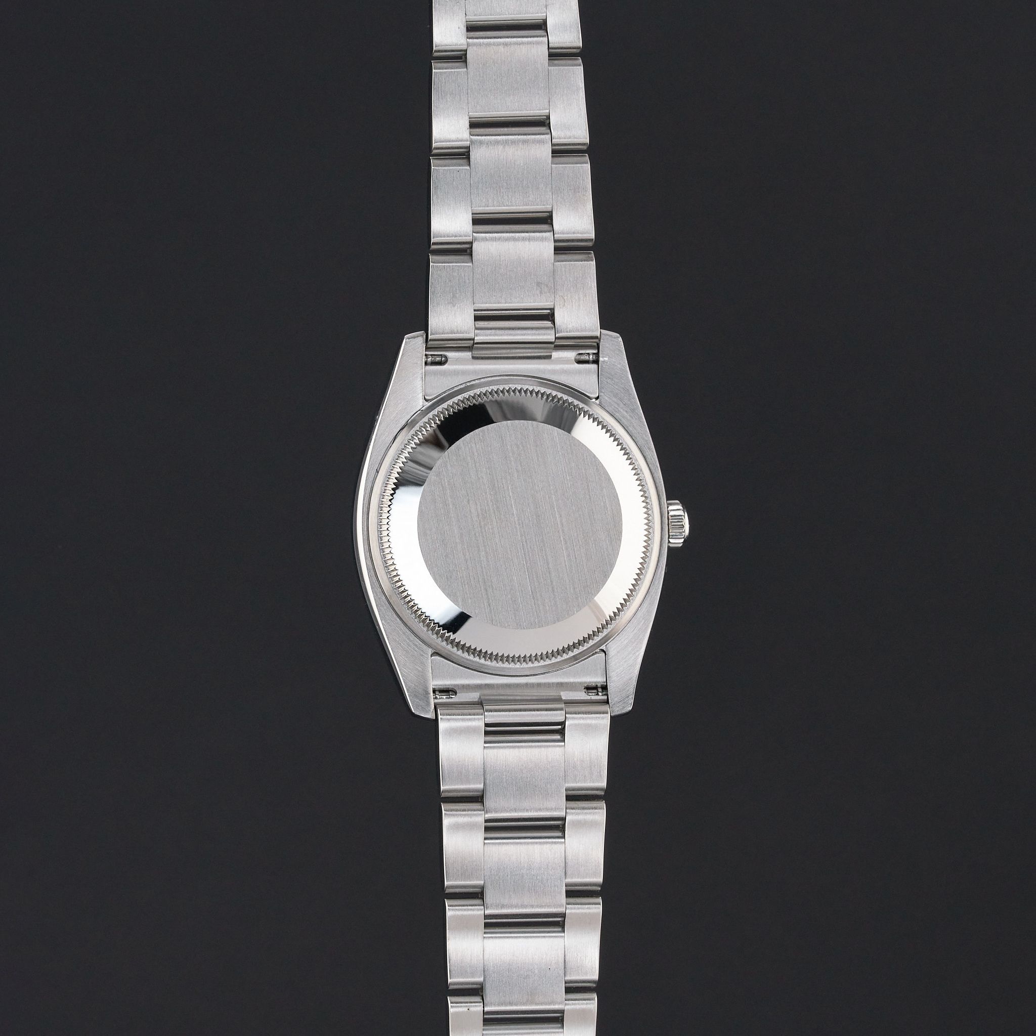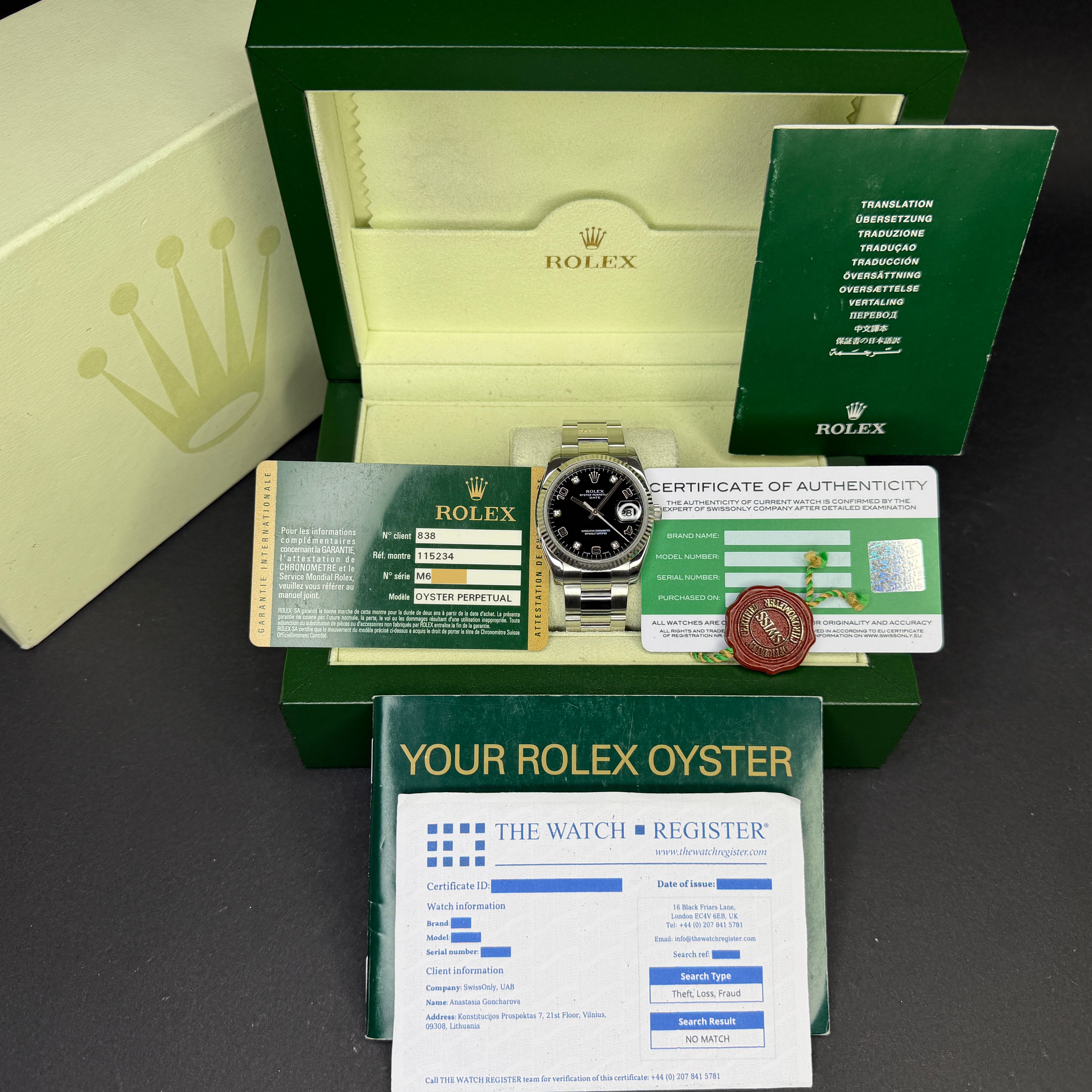 This Rolex Oyster Perpetual Date 115234 features a Black Arabic diamond dial and is crafted from stainless steel, with a production year of 2008.Case No: M65XXXX