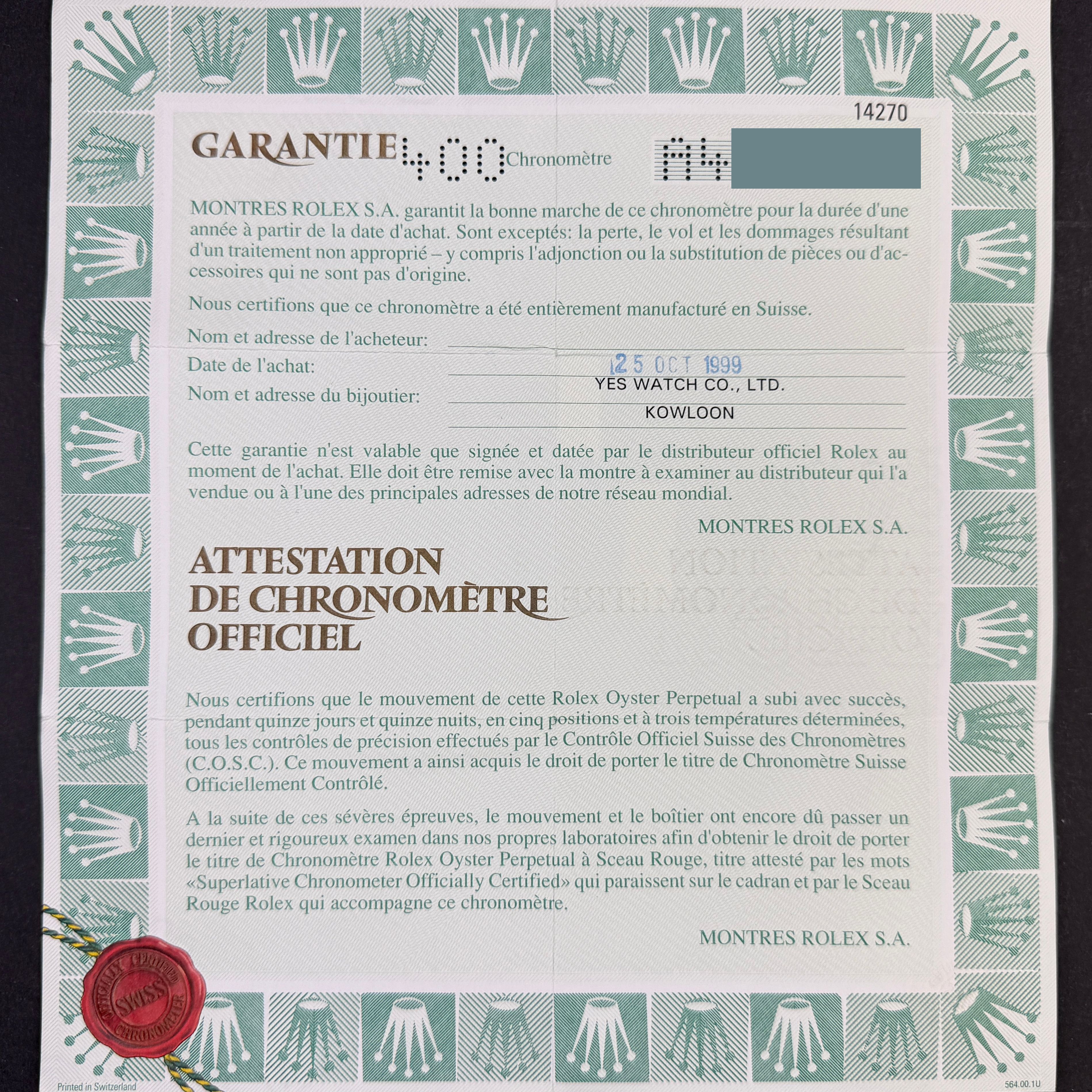 This Rolex Explorer 14270 features a Black Arabic dial and is crafted from stainless steel, with a production year of 1999.Case No: A49XXXX