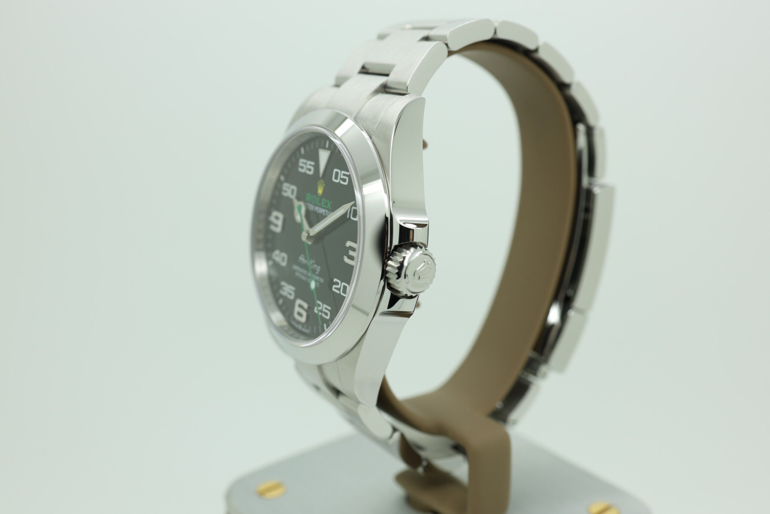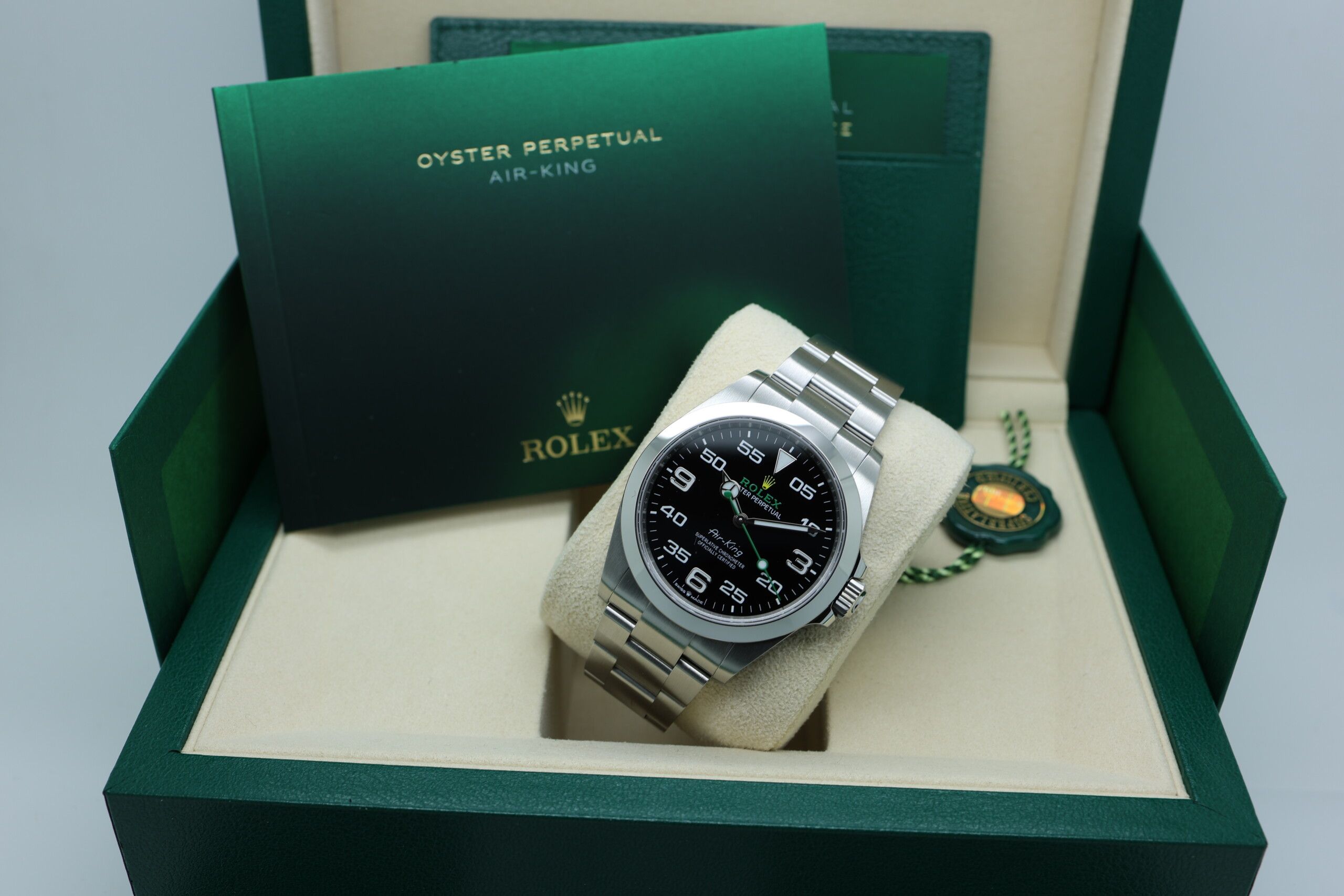 Rolex Air-King – Ref. 126900 – 2025 – Brand New – Full SetThe Rolex Air-King 126900 is a bold tribute to aviation heritage, reimagined with modern Rolex engineering. With its distinctive black dial, oversized 3-6-9 numerals, and signature green “Rolex” logo paired with a yellow crown, the Air-King stands out as one of the most characterful models in the current collection.