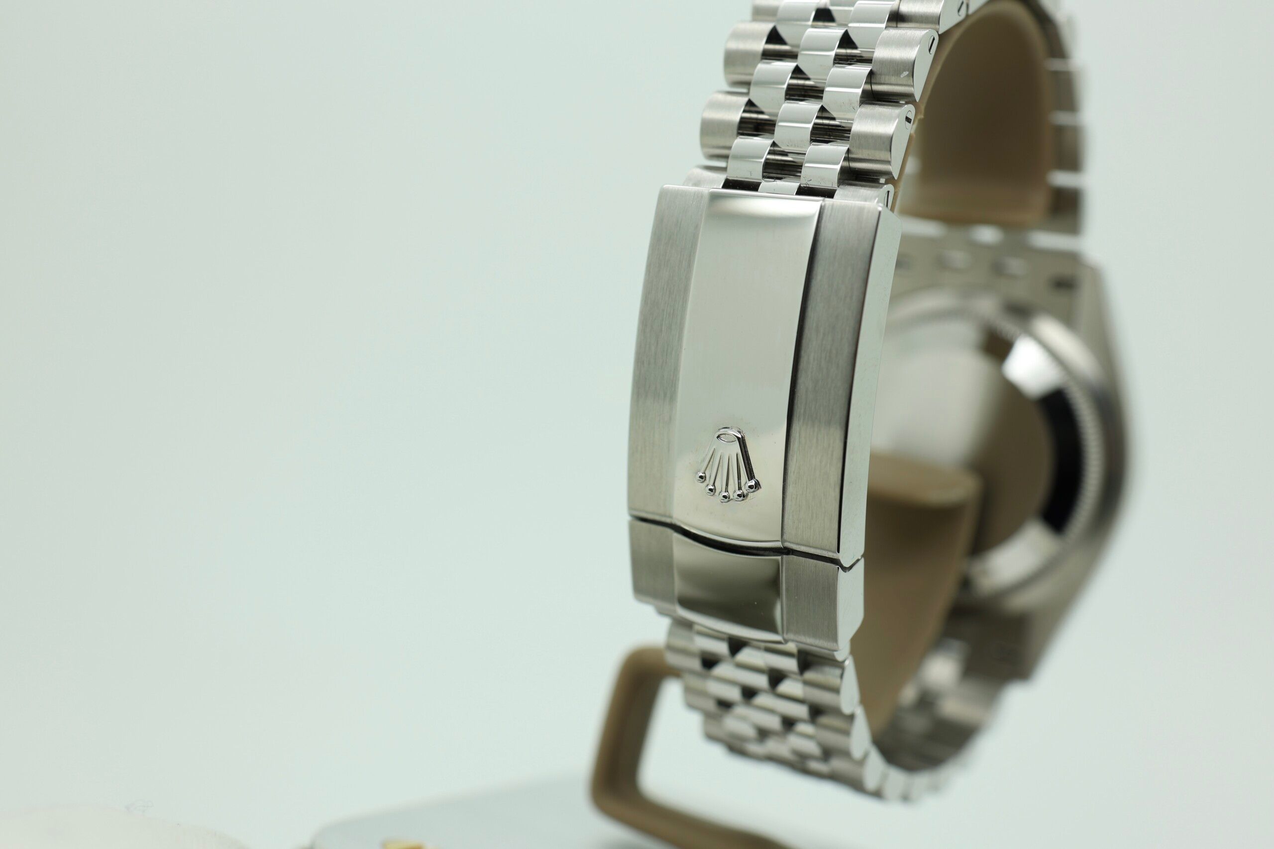 Die Uhr ist aus Rolex Oystersteel gefertigt und mit einer charakteristischen, weißgoldenen, geriffelten Lünette versehen, die die unverwechselbare Silhouette der Datejust schafft. Ausgestattet mit dem komfortablen und eleganten Jubilee-Armband bietet sie eine nahtlose Verbindung von Luxus und Alltagstauglichkeit.