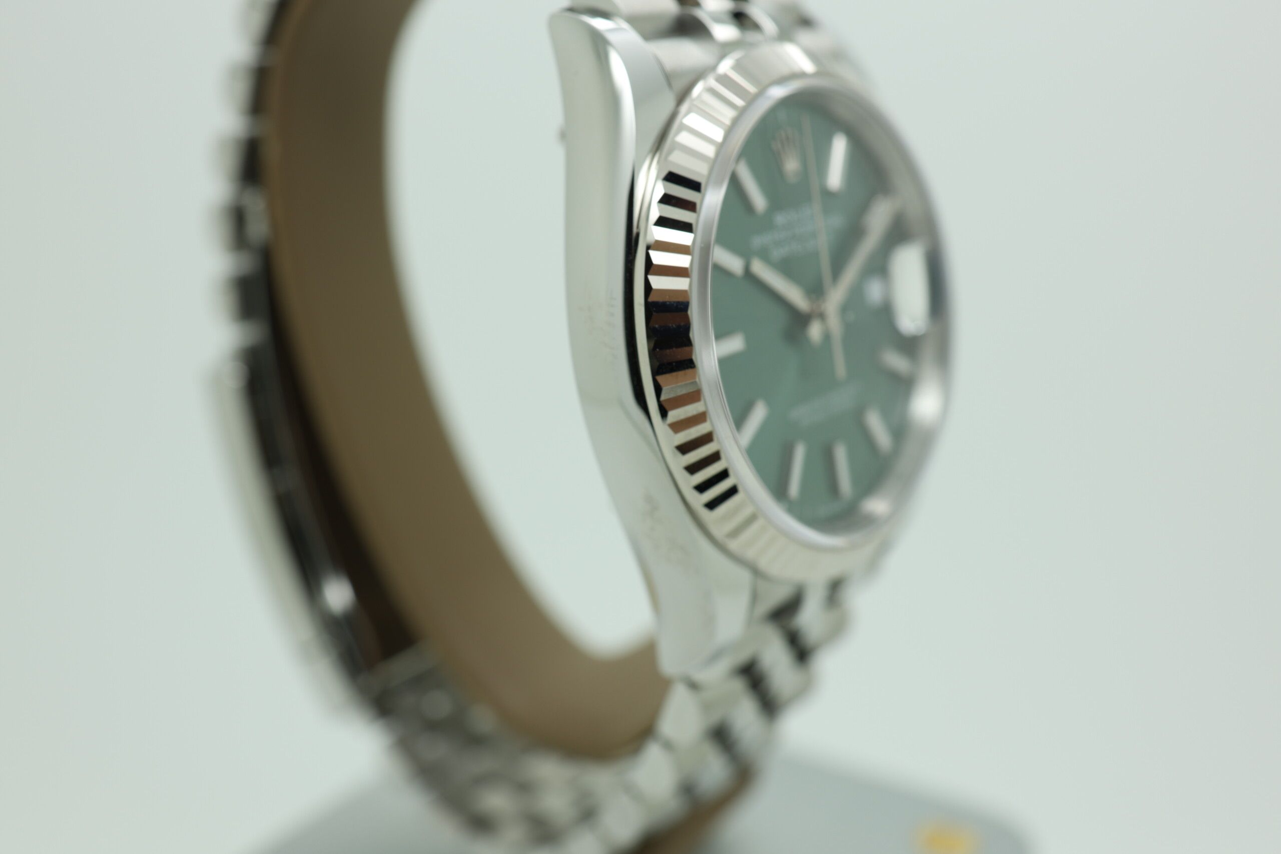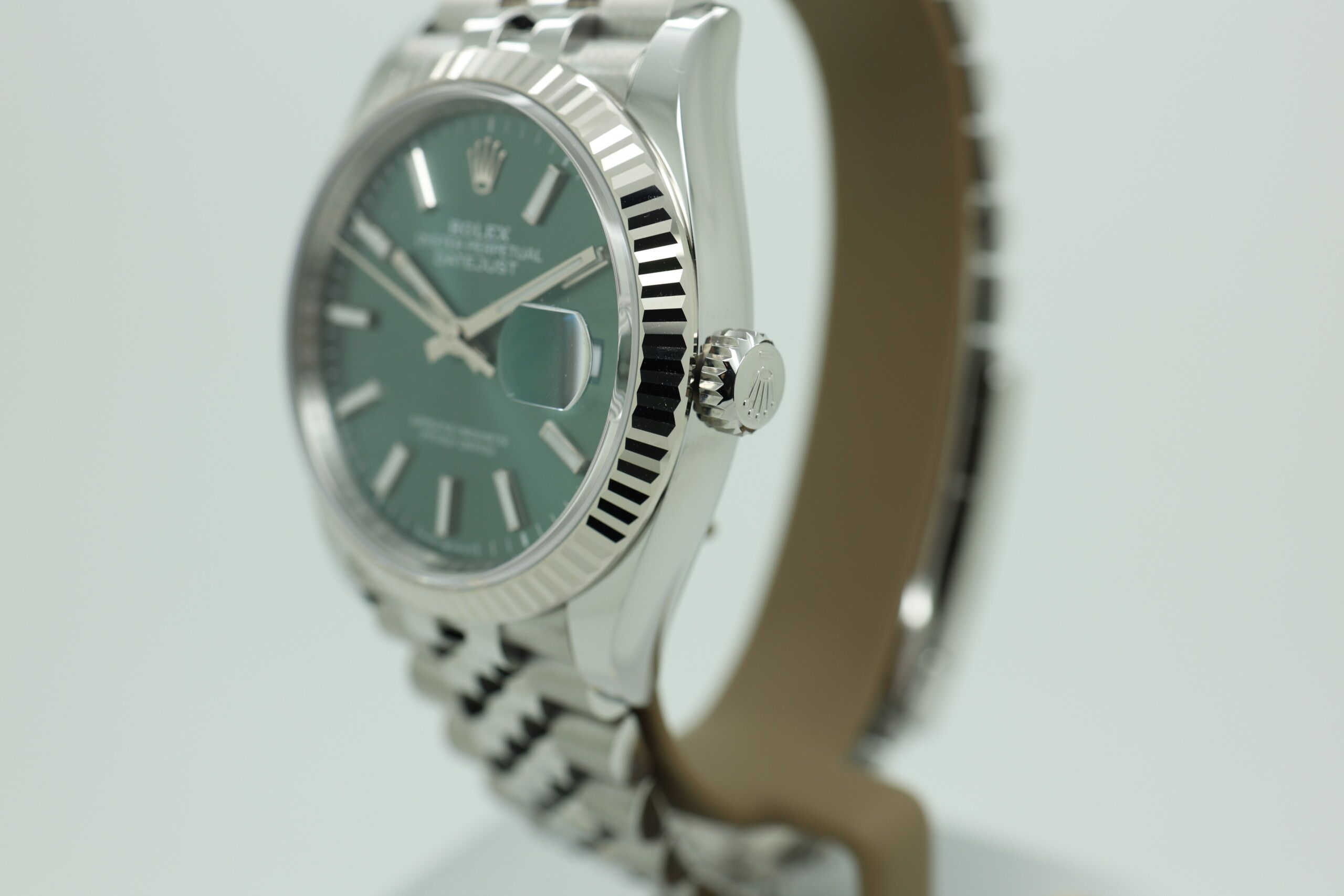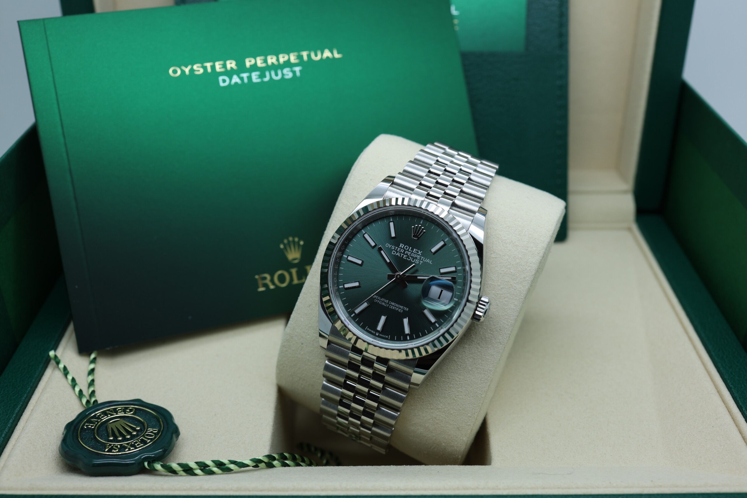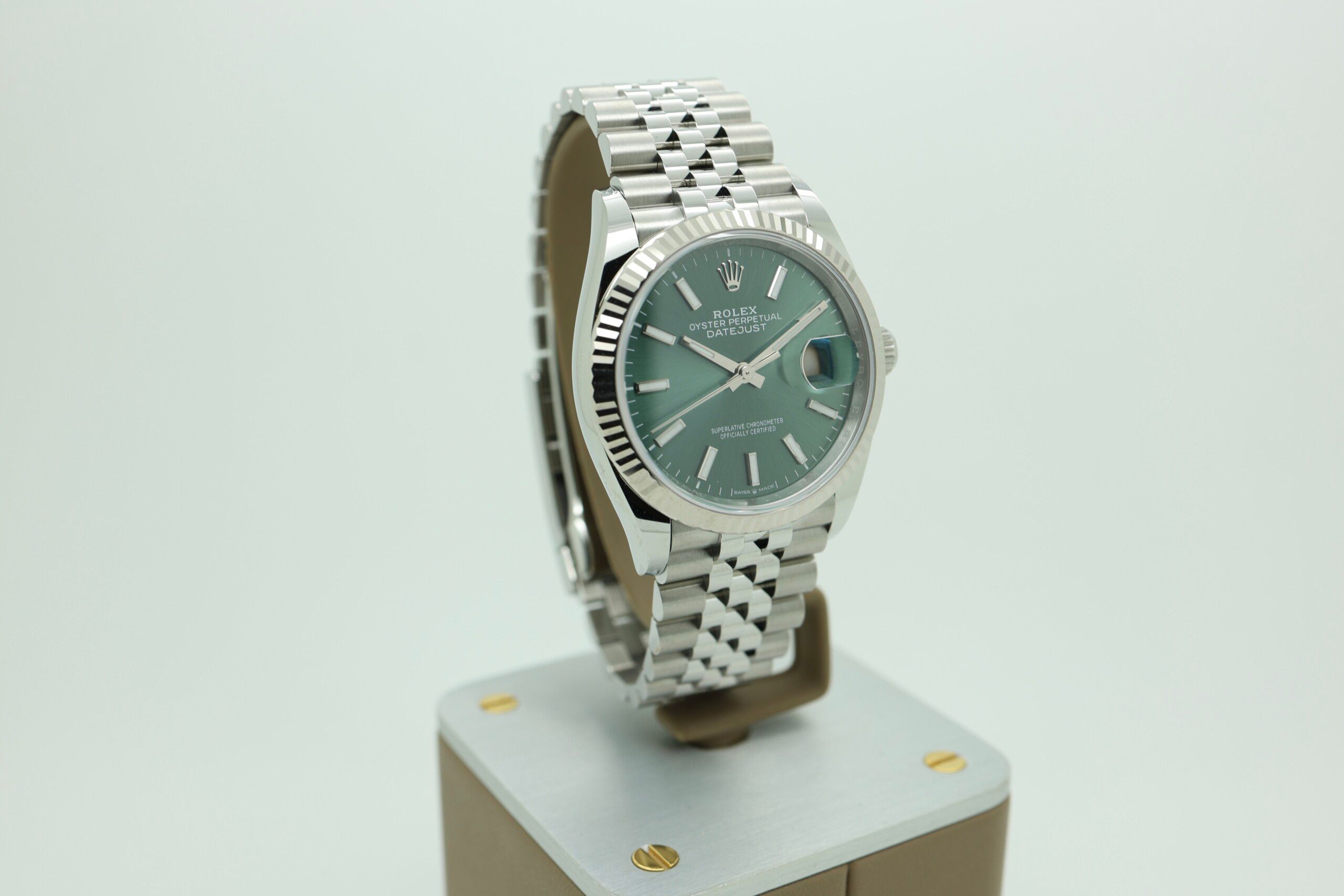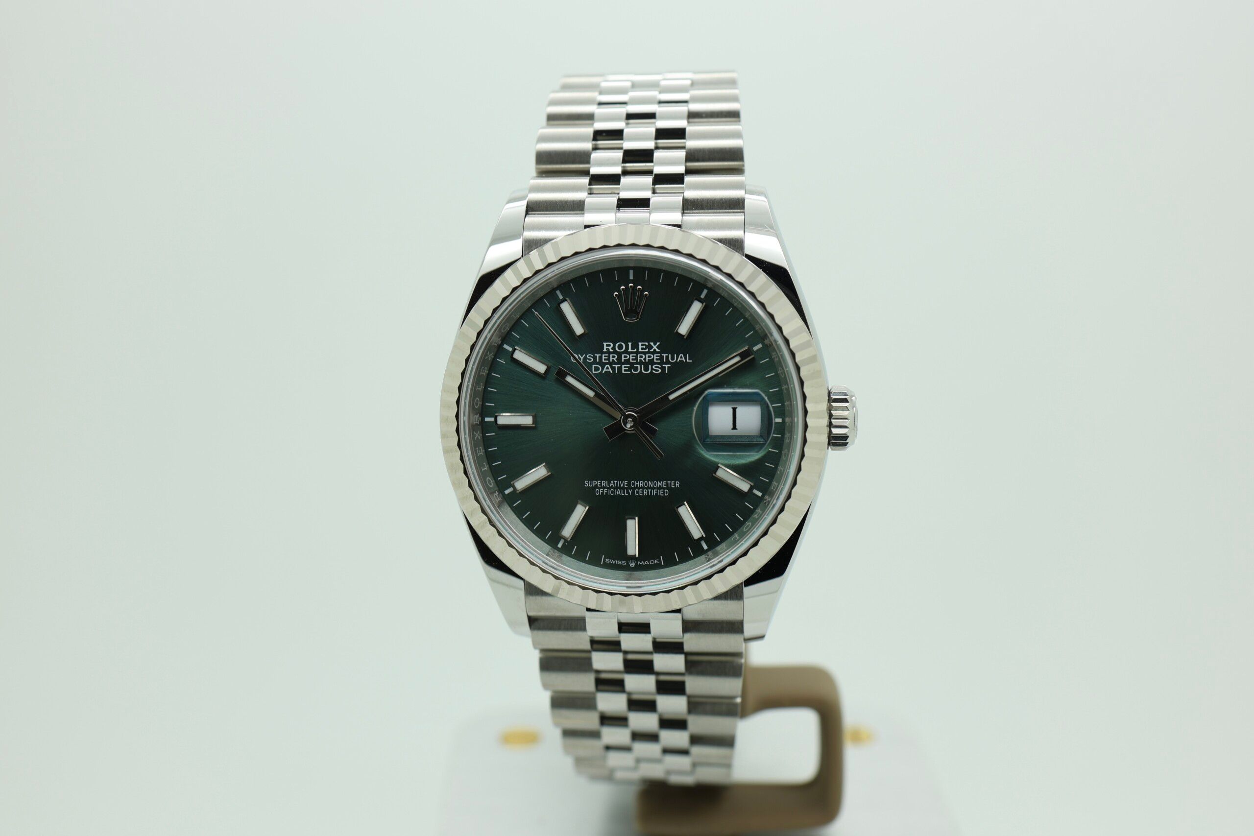 Rolex Datejust 36 – Ref. 126234 – Mint Green Dial – Jubilee Bracelet – 2025 – Brand New – Full SetThe Rolex Datejust 36 (Ref. 126234) perfectly balances classic elegance with modern refinement. This 2025 example features the highly sought-after mint green dial, a fresh and contemporary color that plays beautifully with light and adds subtle individuality to a timeless design.