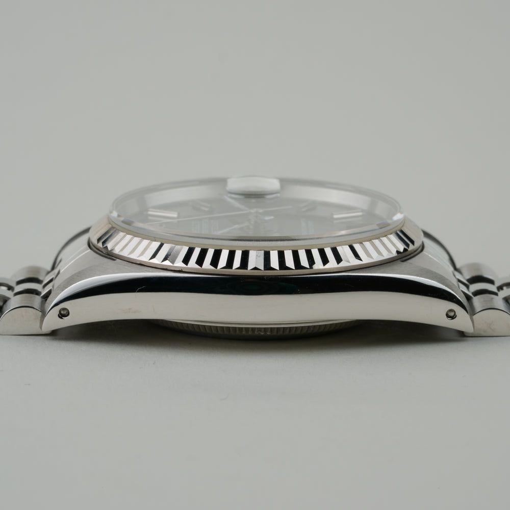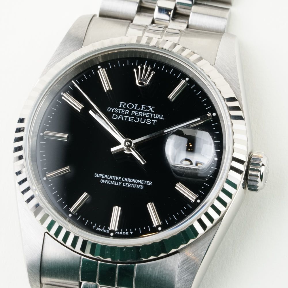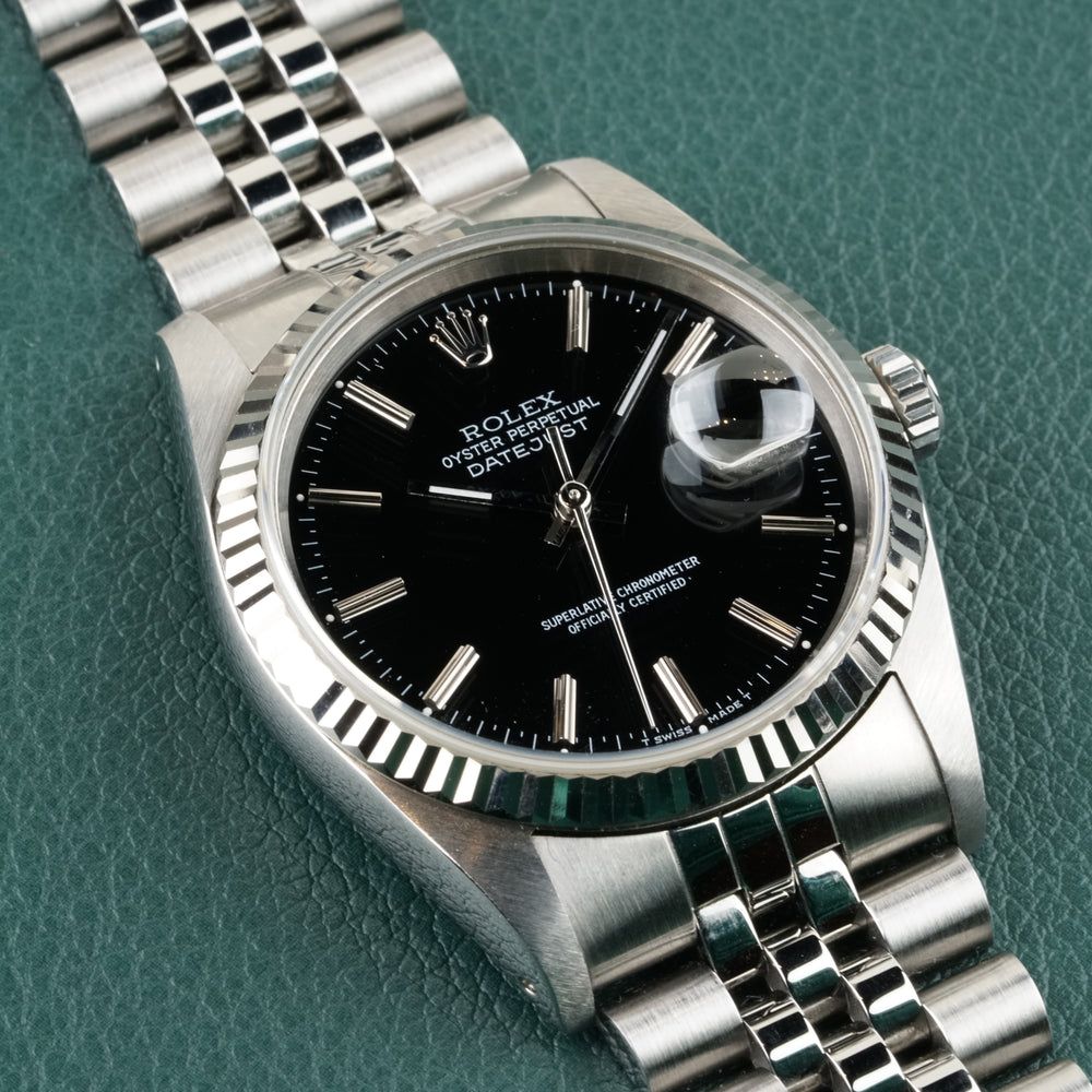 The Rolex Datejust Ref. 16234 is a definitive example of neo-vintage luxury. Its classic 36 mm stainless steel case is crowned by a signature 18k white gold fluted bezel, framing a black dial with stick indices that adds a refined depth to the design. Powered by the legendary automatic Caliber 3135, this 1998 Rolex Datejust Included with box and paper, perfectly balances robust reliability with timeless sophistication.