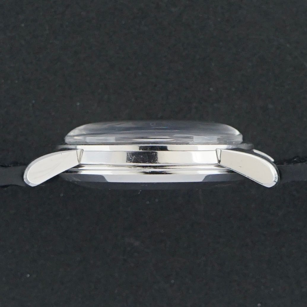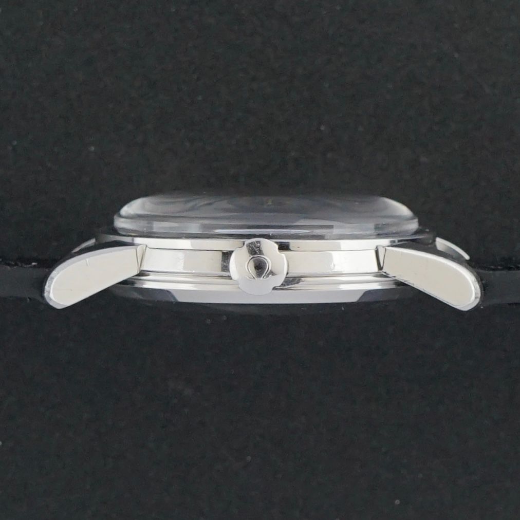 This beautiful vintage Omega Seamaster automatic was produced in 1954 and what makes this piece truly special is the dial. It features a black gilt dial with a beautiful tropical patina formed over time, complemented by golden colored accents and dauphine hands. Arabic numerals are present at the 12, 3, 6, and 9 o’clock positions. The stainless steel case measures 34,5 millimeters in width, however due to the substantial lugs it wears noticeably larger than a regular 34,5 millimeter watch. Inside is the Omega caliber 503 automatic movement, which was serviced in January, 2026 and currently runs and functions excellently. The watch is paired with a black grade 3 leather strap with a crocodile motif. The caseback is engraved with the date 5-12-1956. Considering the production year of 1954, it is most likely that this watch was gifted on that date, adding an extra layer of story and vintage character to an already exceptional and increasingly uncommon timepiece.Year of production: 1954