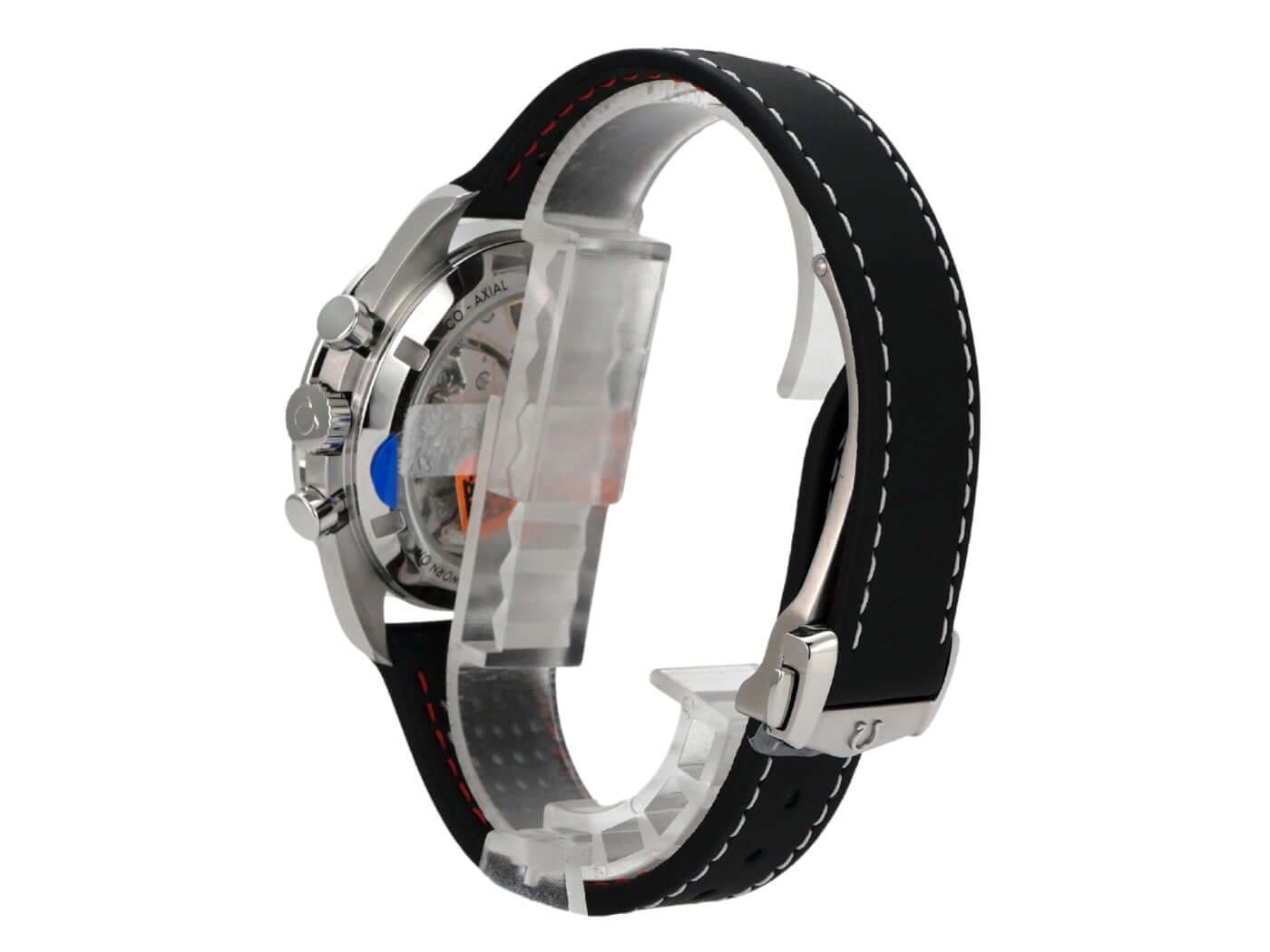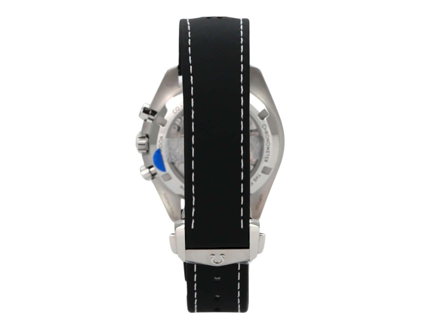 Gehäuse aus poliertem und satiniertem Edelstahl, Gehäusedurchmesser 42 mm, Gehäusehöhe 13,2 mm, Edelstahl-Lünette mit schwarzem Einlage und Tachymeterskala, schwarzes Lederarmband mit Faltschließe, weiße Zifferblatt mit aufgesetzten Leuchtmarkierungen, leuchtende Zeiger, Handaufzugswerk, Omega Kaliber 3861 mit 26 Rubinen, 21.600 Schwingungen pro Stunde, Gangreserve ca. 50 Stunden, Stoppuhr, Master Chronometer, Saphirglas, doppelseitige Anti-Reflex-Beschichtung, verschraubter Edelstahlboden mit graviertem Saphirglasfenster, wasserdicht bis 5 bar.