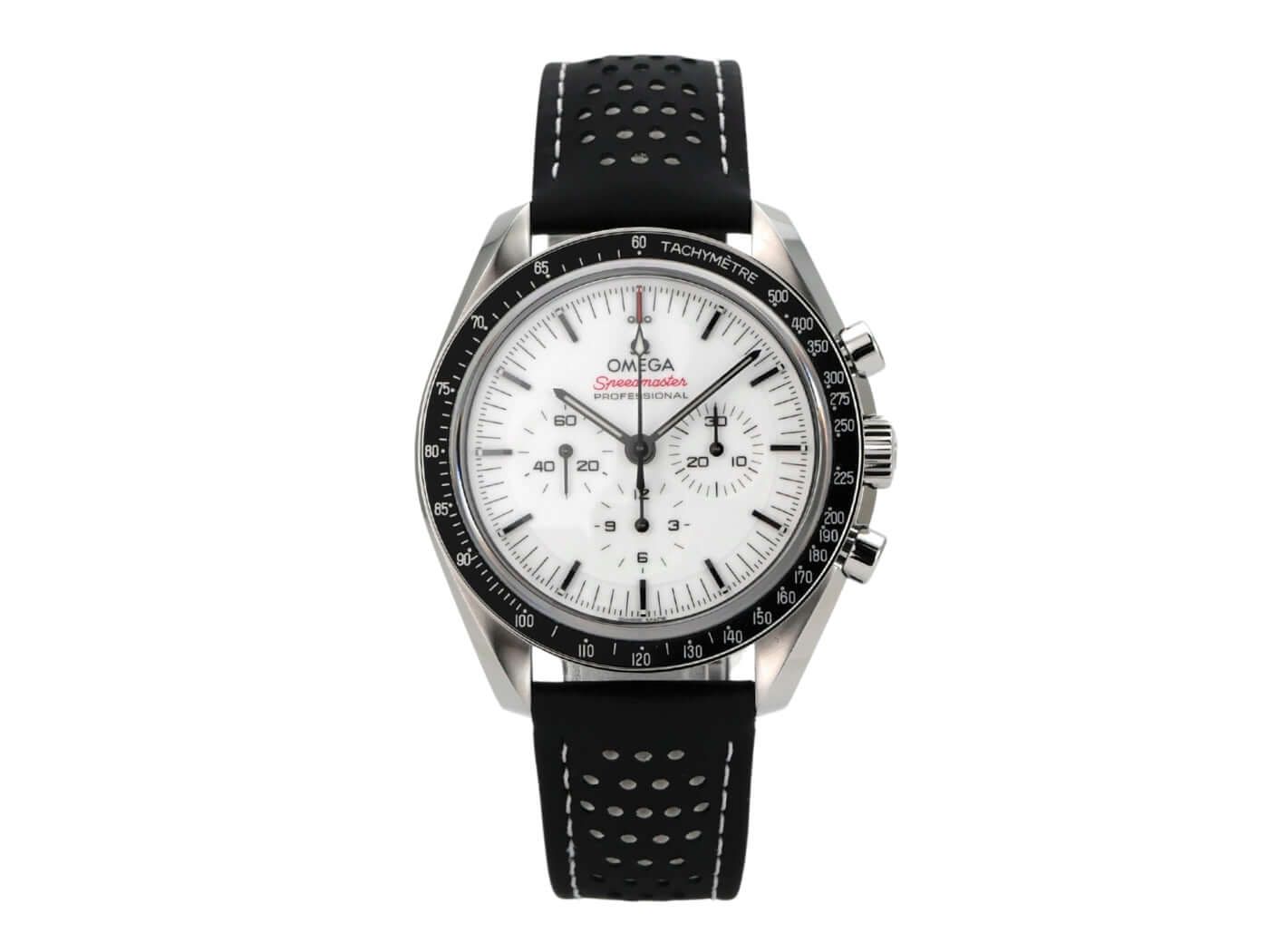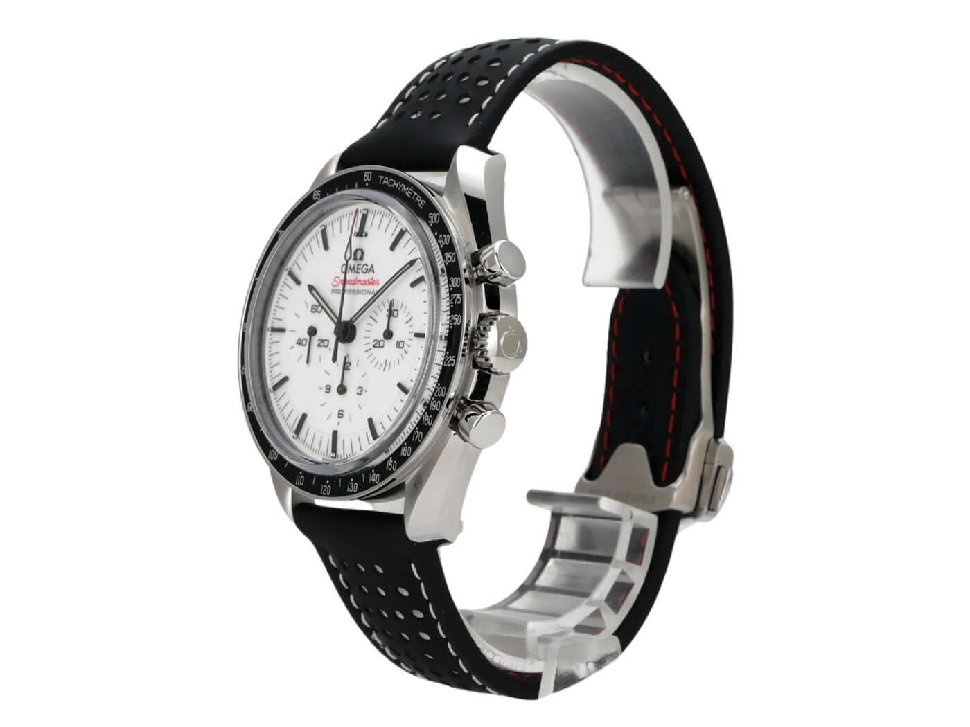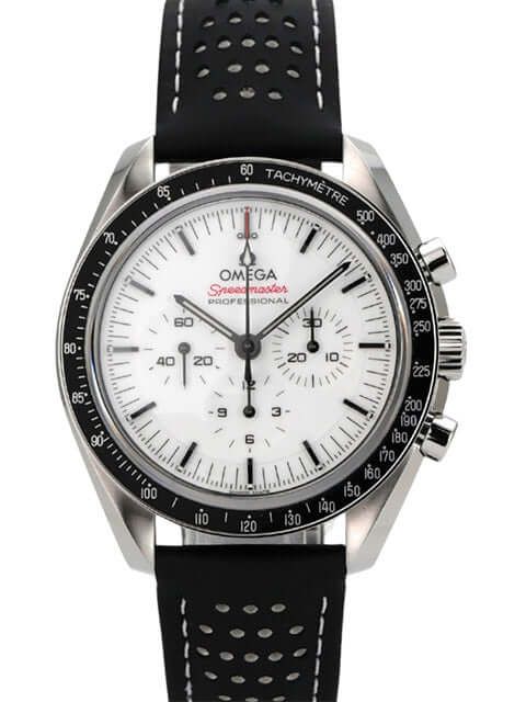 Omega Speedmaster Professional Moonwatch 310.32.42.50.04.002Case made of polished and satin-finished stainless steel, case diameter 42 mm, case height 13.2 mm, stainless steel bezel with black inlay and tachymeter scale, black leather strap with folding clasp, white dial with applied luminous markers, luminous hands, hand-wound movement, Omega caliber 3861 with 26 jewels, 21,600 vibrations per hour, power reserve approx. 50 hours, stopwatch, Master Chronometer, sapphire glass, double-sided anti-reflective coating, screwed stainless steel back engraved with sapphire glass window, water-resistant up to 5 bar.