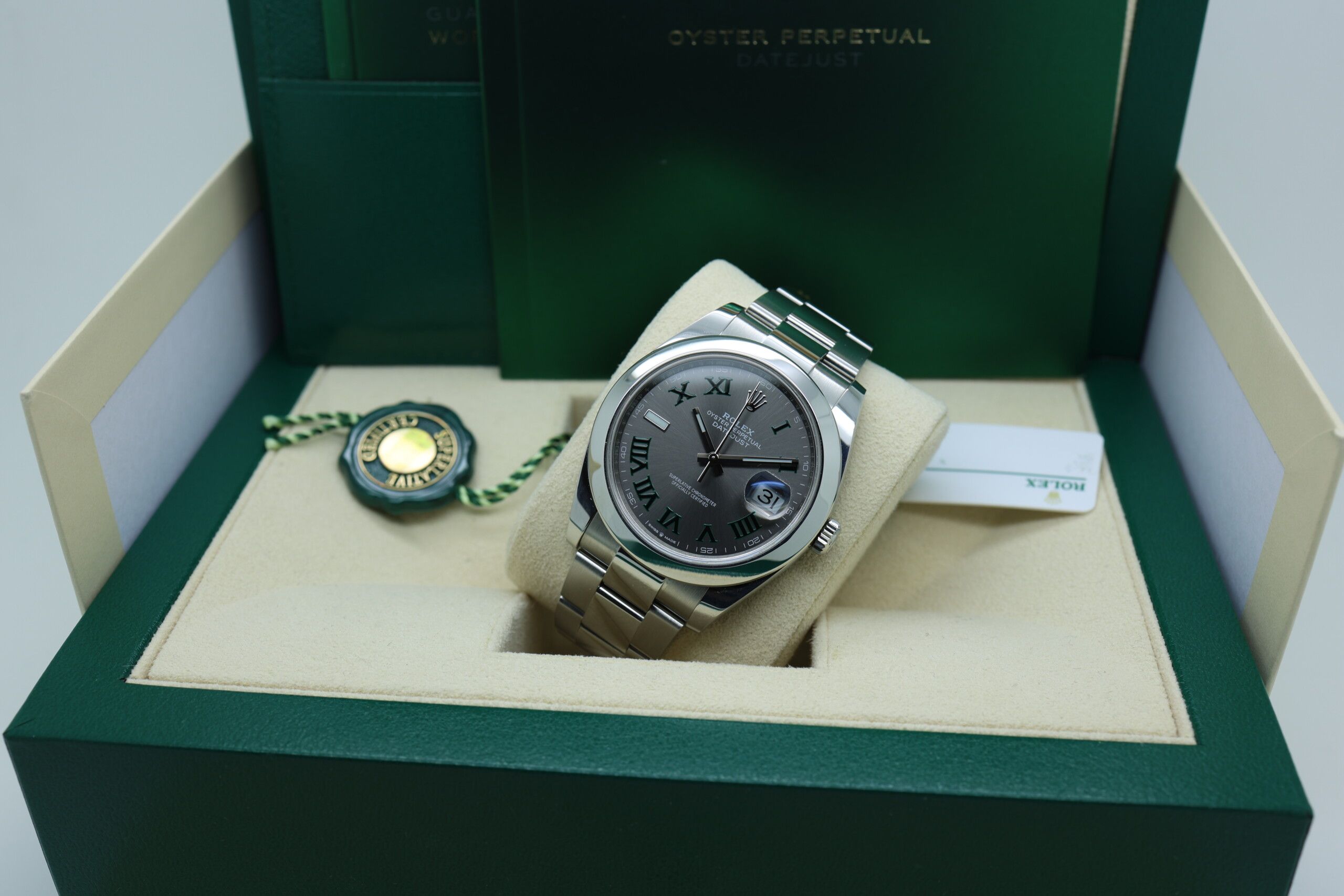 Rolex Datejust 41 – Ref. 126300 – “Wimbledon” Dial – Oyster Bracelet – Full Set – Excellent ConditionThe Rolex Datejust 41 (Ref. 126300) with the iconic “Wimbledon” dial is one of the most recognizable and desirable modern Datejust configurations. Its slate grey dial with bold black Roman numerals and signature green Roman numeral at VI creates a striking and instantly identifiable look.